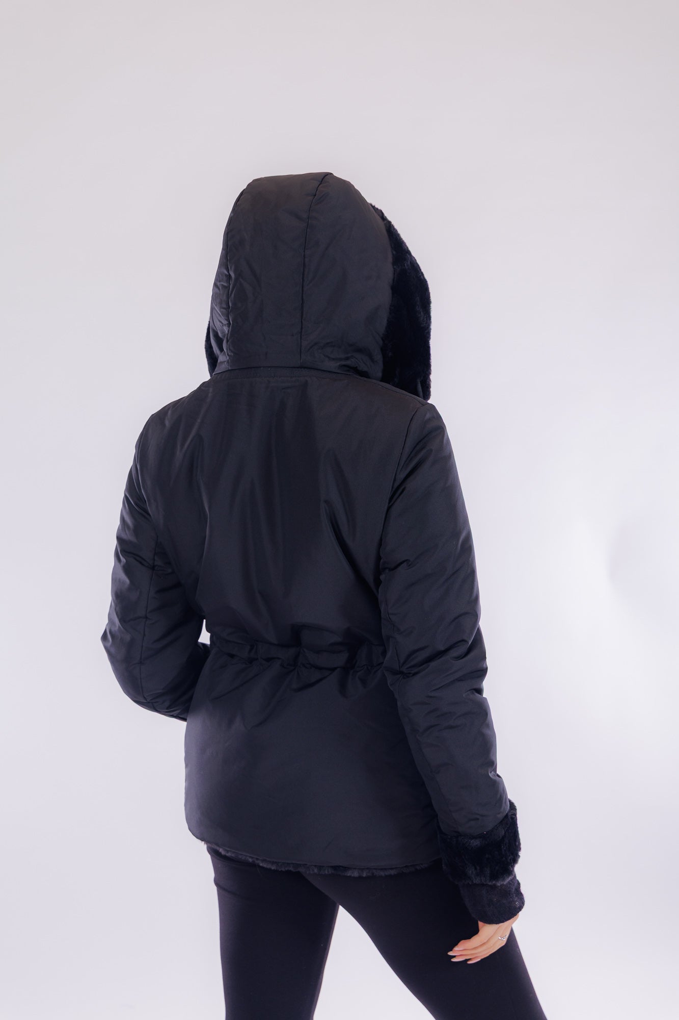 Questo giaccone double face combina praticità e uno stile casual chic, con una vestibilità comoda e lunghezza che copre il sedere. Un lato è realizzato in morbida eco pelliccia con cappuccio peloso, coulisse in vita per definire la silhouette, tasche profonde e chiusura a cerniera con doppio cursore. L'altro lato presenta un tessuto impermeabile rifinito con bordi, polsi e cappuccio in eco pelliccia calda, completo di tasche zippate e coulisse sul cappuccio per una protezione ottimale. Una soluzione versatile, ideale per affrontare con stile le variabili condizioni climatiche.