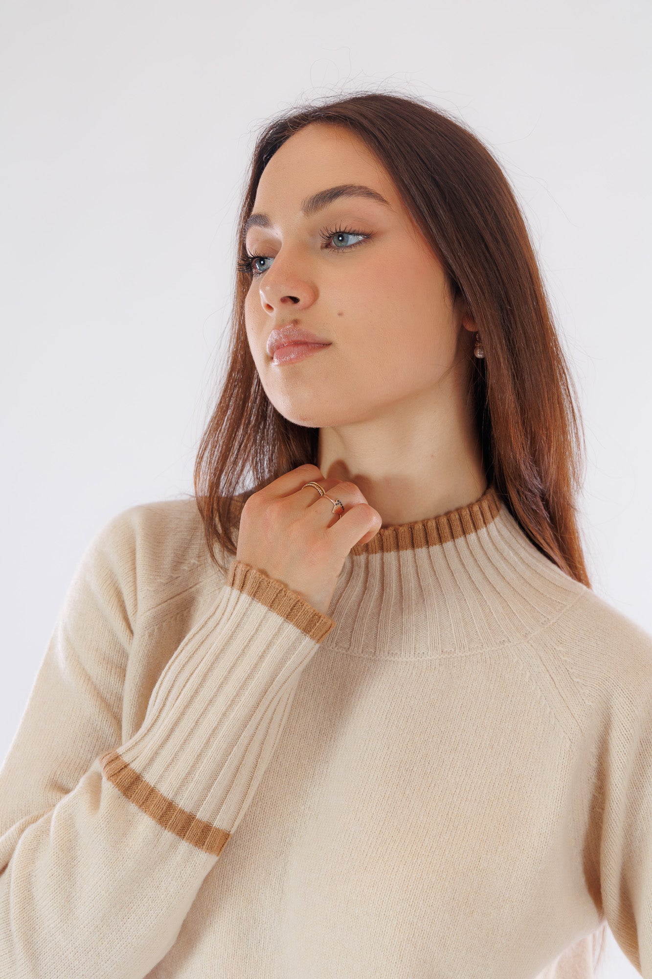 Questo maglione con collo in piedi è caratterizzato da una lavorazione a raglan sulle maniche e da bordi a coste inglesi su collo, polsini e fondo, arricchiti da bordi a contrasto in un tenero color biscotto. La sua lunghezza oltre il bacino e la vestibilità morbida offrono comfort e stile, mentre gli spacchetti laterali facilitano il movimento. Realizzato con materie prime di alta qualità in collaborazione con l'azienda "Linsieme filati cashmere", garantisce attenzione alla salute e al rispetto ambientale.