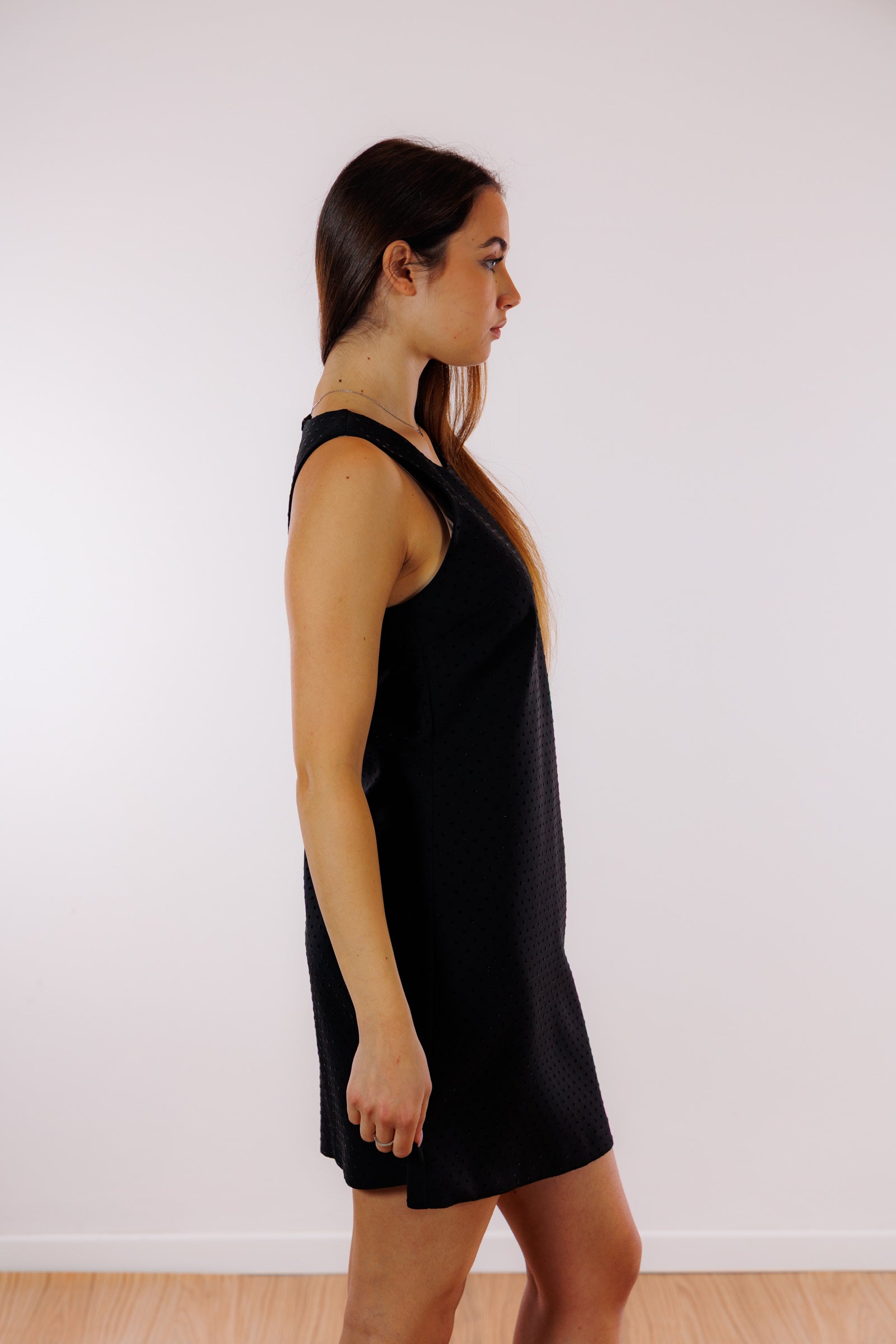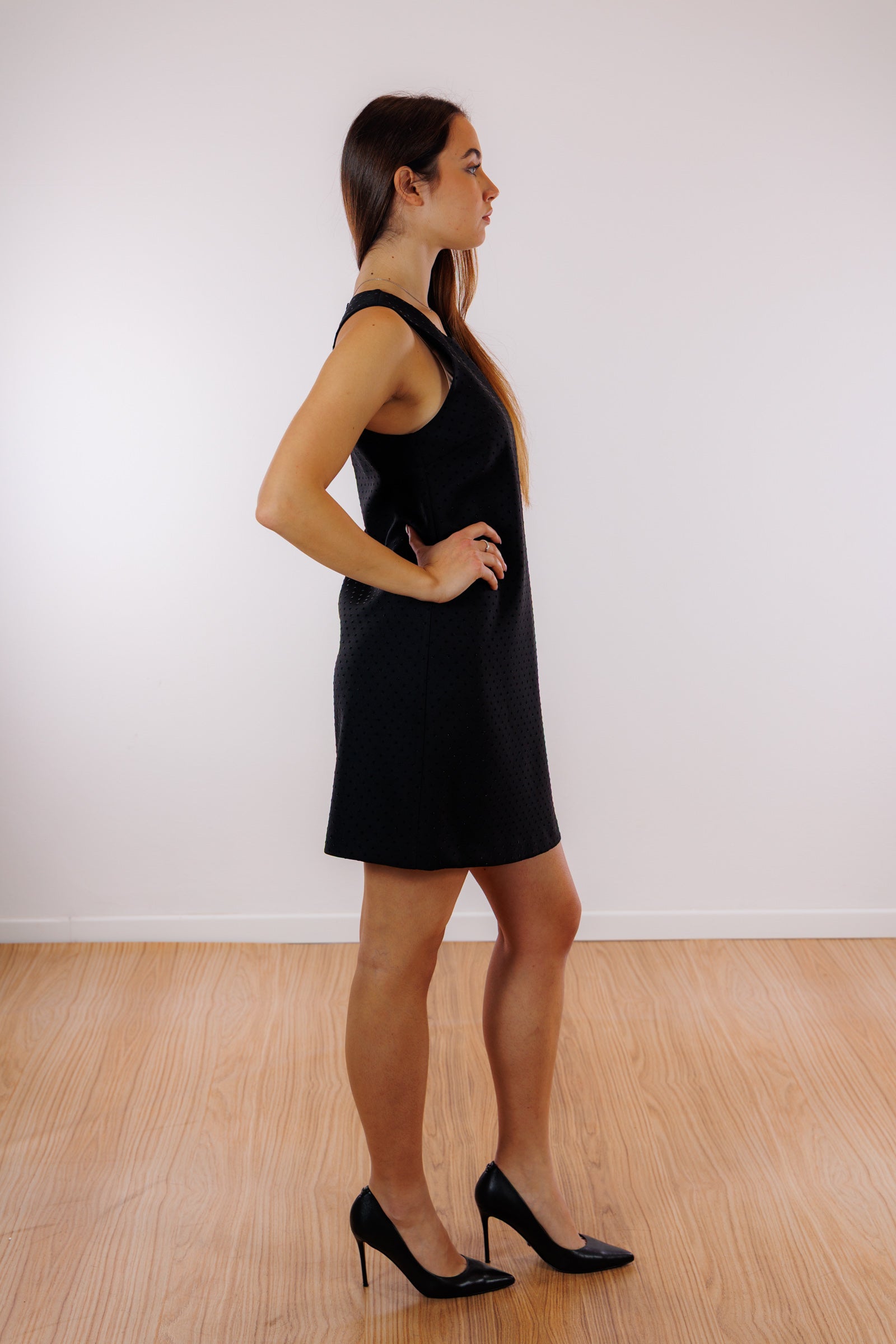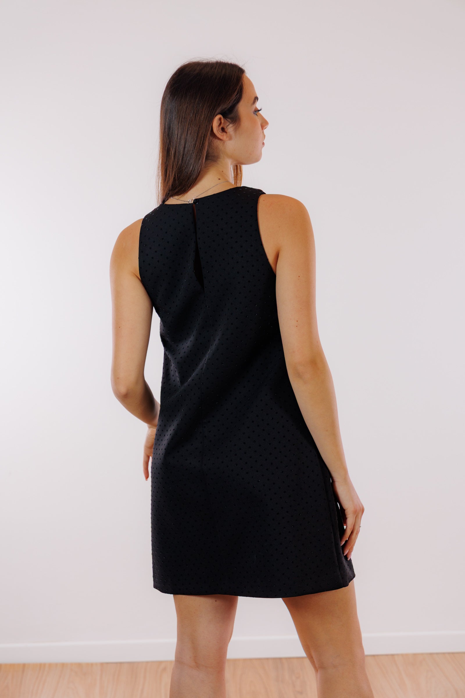 Abito realizzato in tessuto con pois in rilievo vellutati. Il modello è ad " A", senza maniche, e con scollatura a girocollo. Lunghezza vestito 87 cm, metà coscia, presenta un bottoncino dietro il collo per facilitare l'indosso. Dal design sofisticato e chic, è un abitino perfetto per le tue serate più eleganti.
