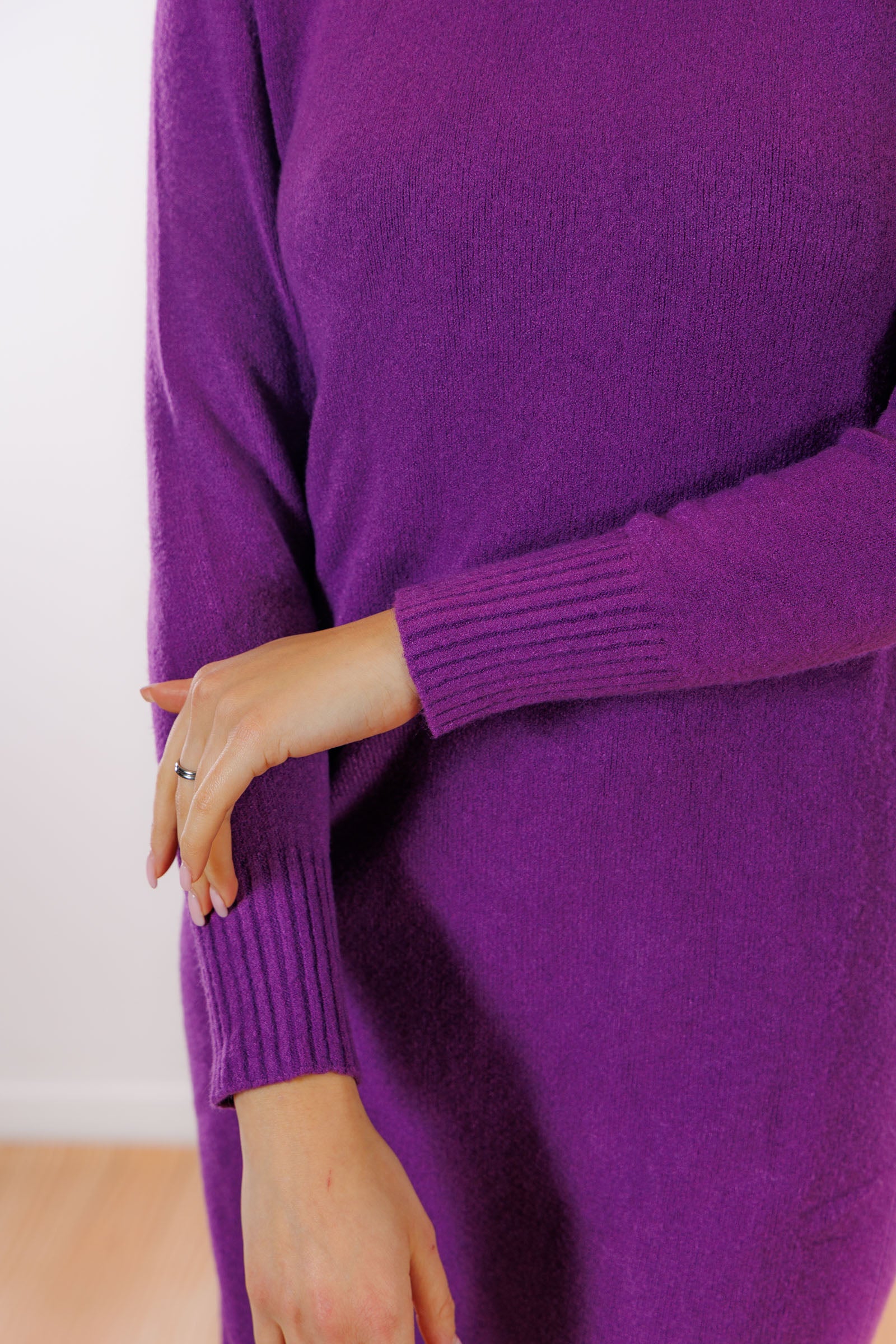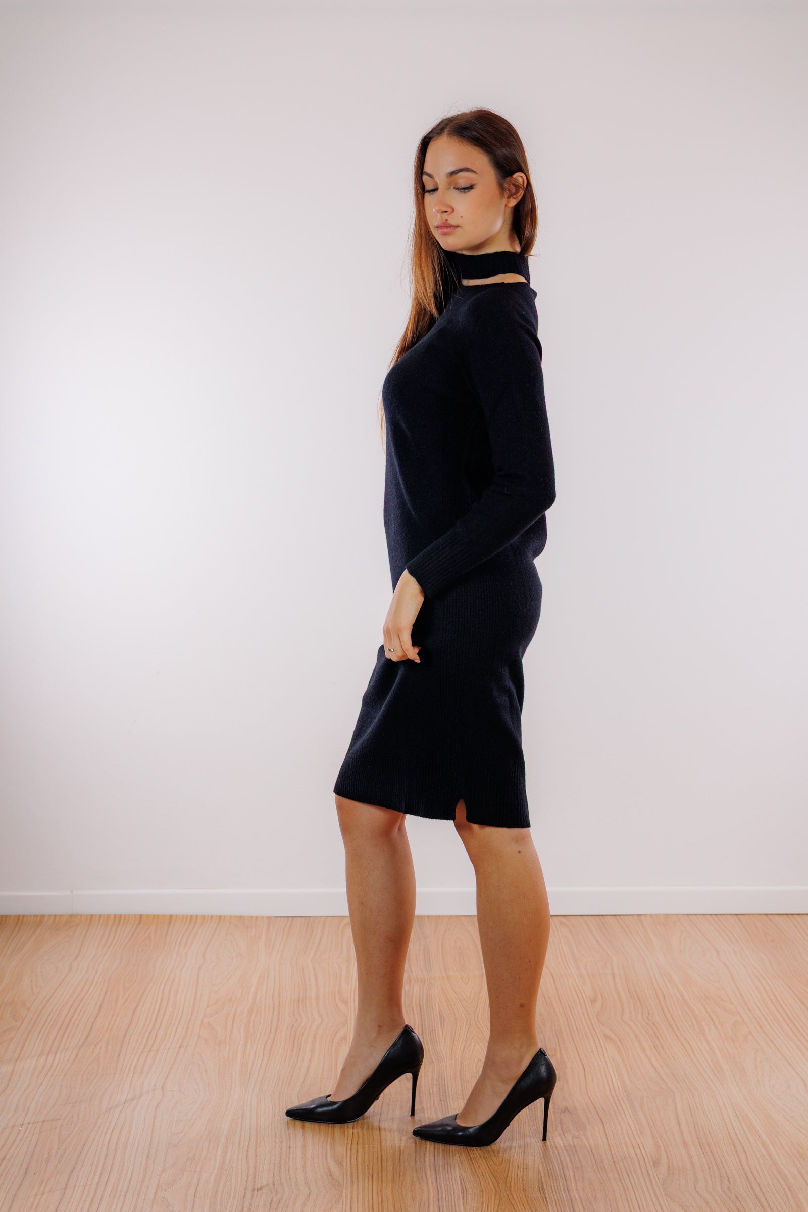 Abito invernale, in maglia, lungo al ginocchio e con dettaglio cut out sul collo. Vestibilità regolare, mano morbida e realizzato in tessuto di calda viscosa, elasticizzato e fasciante. Presenta costine laterali e sui polsi e a completare il design chic ci sono dei piccoli spacchetti laterali sul fondo.