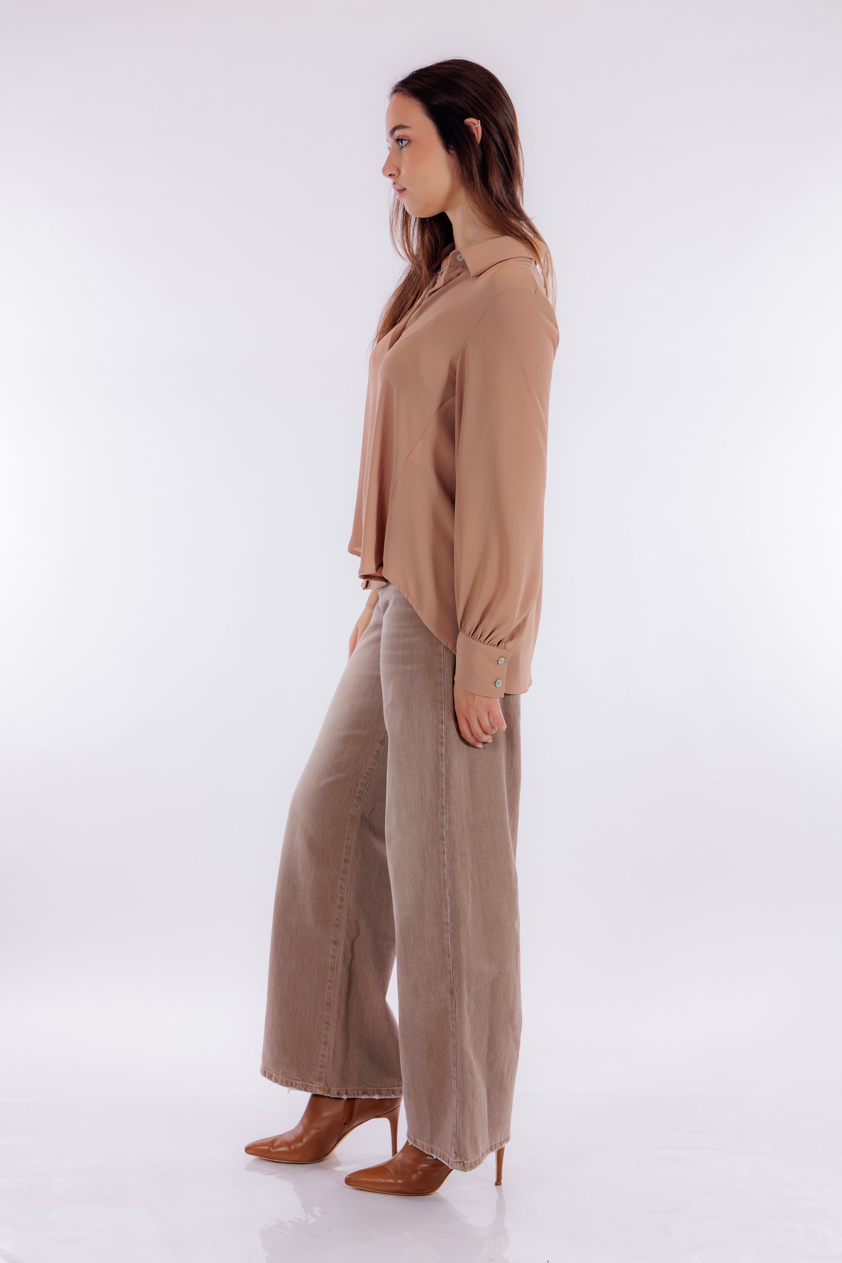 Questa camicia con maniche a sbuffo è realizzata in pes setificato, leggero e fluido, ideale per mantenere un aspetto impeccabile senza stropicciarsi. Presenta un’apertura centrale con bottoncini in madreperla e polsini rifiniti allo stesso modo, garantendo eleganza e praticità. La vestibilità morbida e la lunghezza leggermente più estesa sul retro offrono comfort e uno stile contemporaneo versatile.