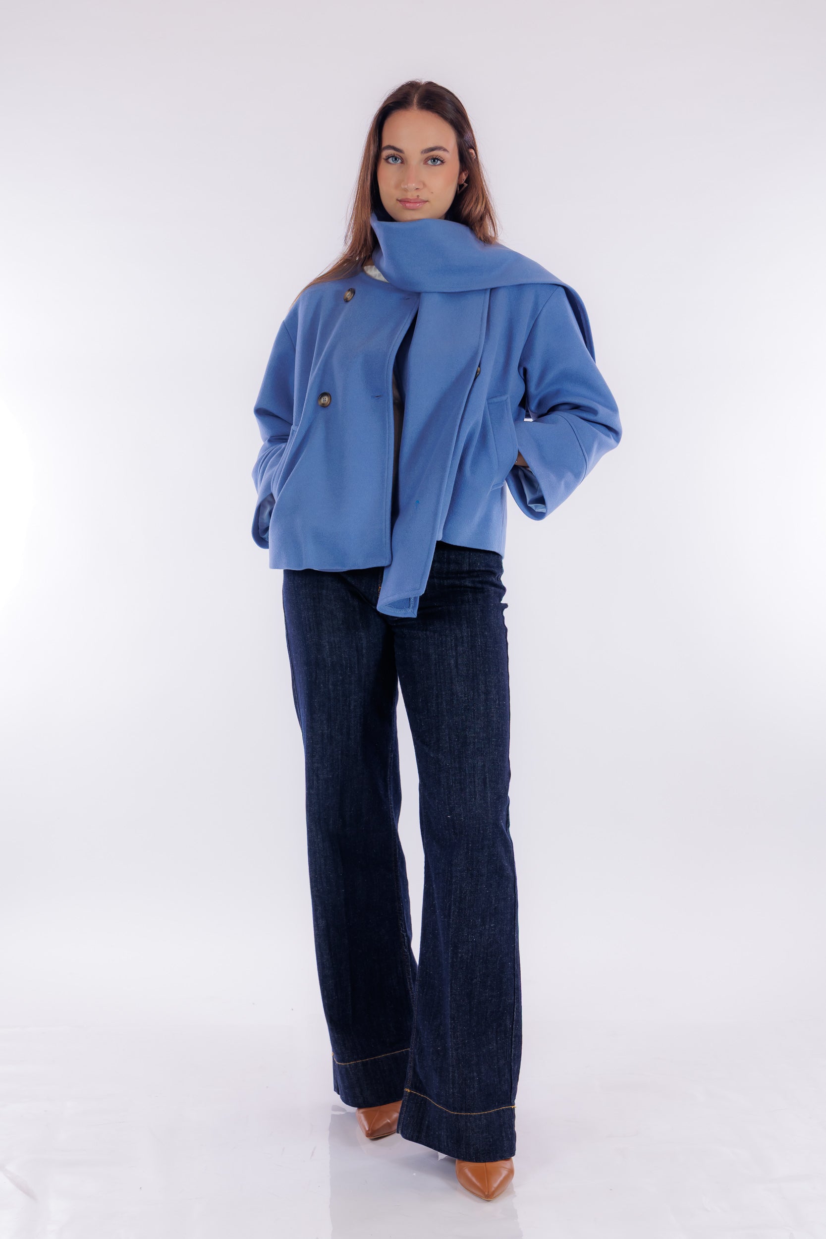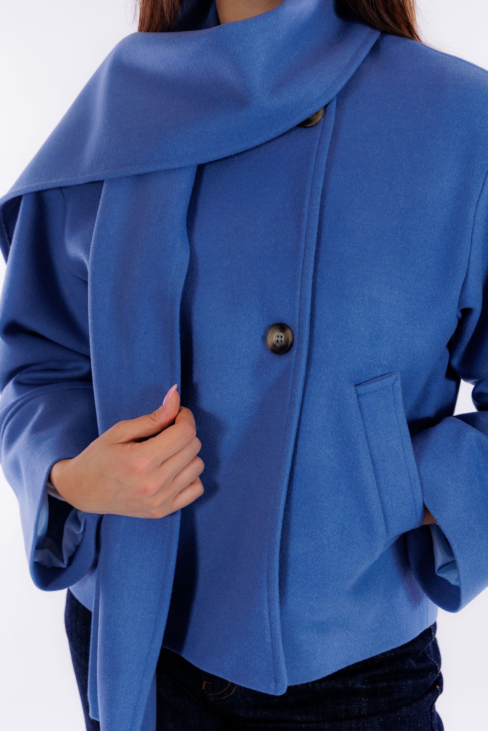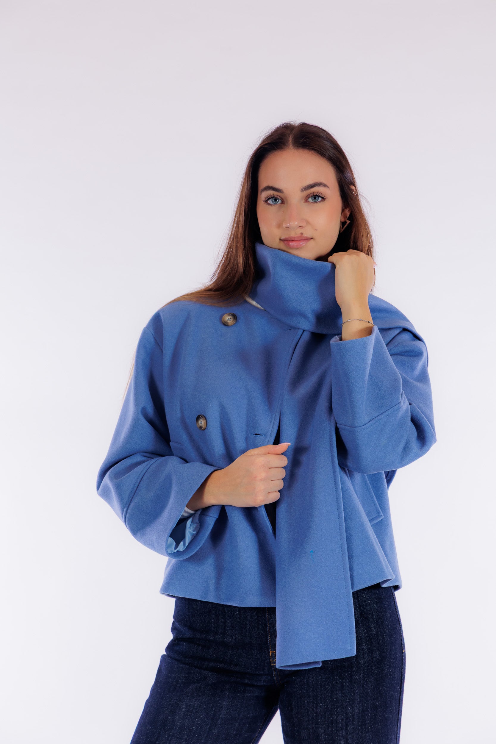 Questa cappa corta al bacino offre una vestibilità over con spalle scese per un comfort ottimale. Foderata internamente in raso, assicura una sensazione morbida al tatto. Presenta una chiusura centrale doppiopetto con bottoni grandi, pratiche tasche frontali e una sciarpa removibile tramite bottone dietro il collo, garantendo versatilità e stile raffinato.