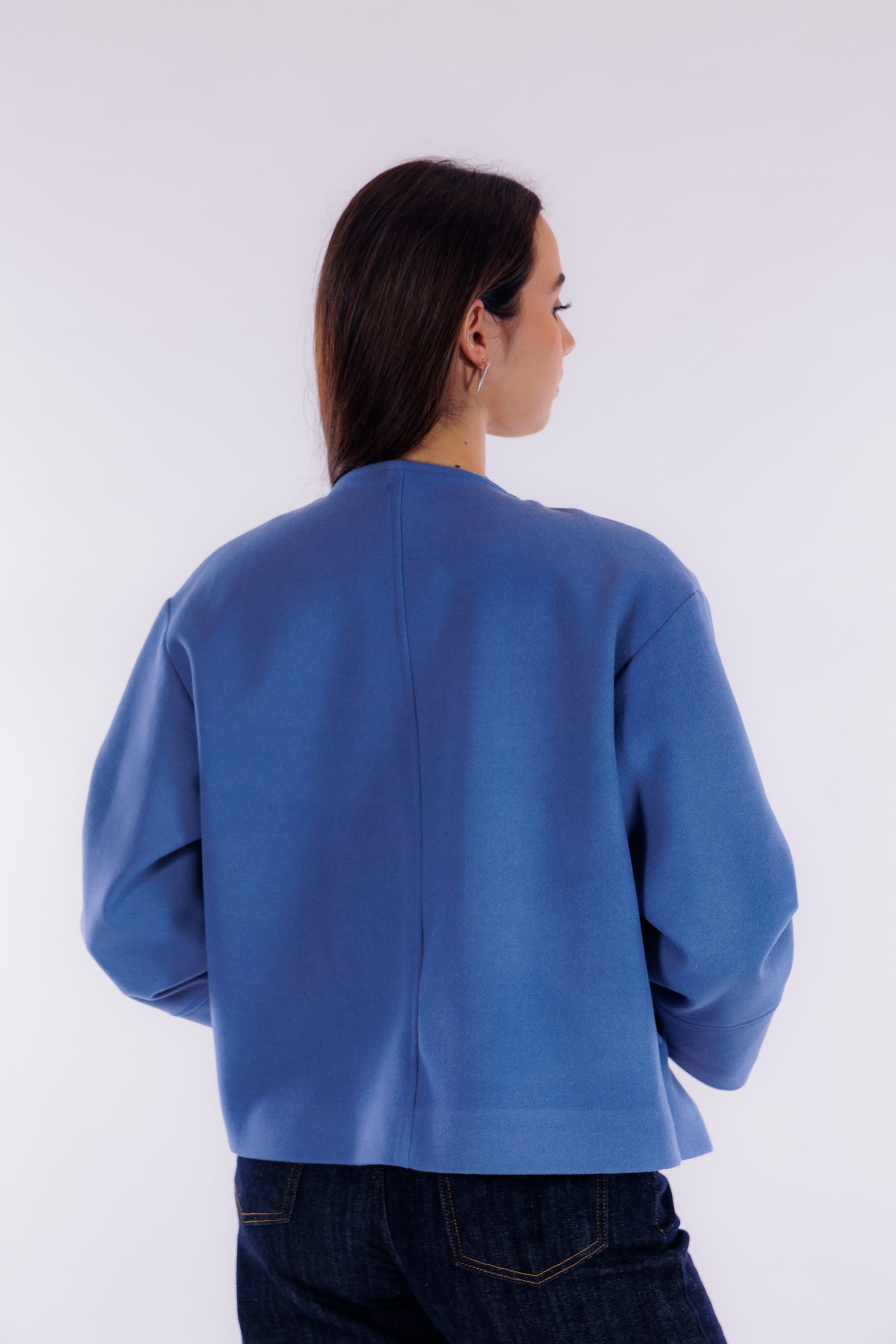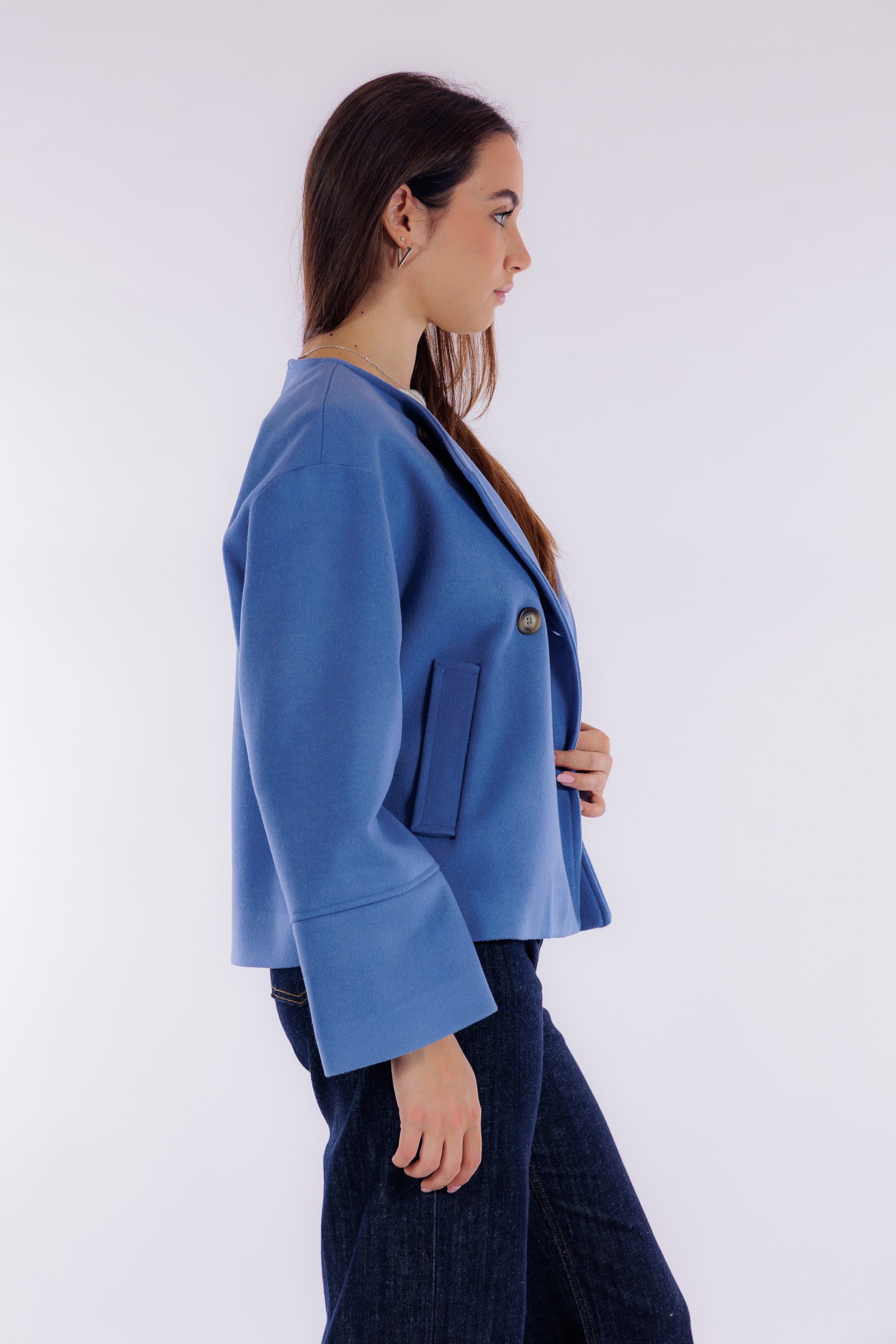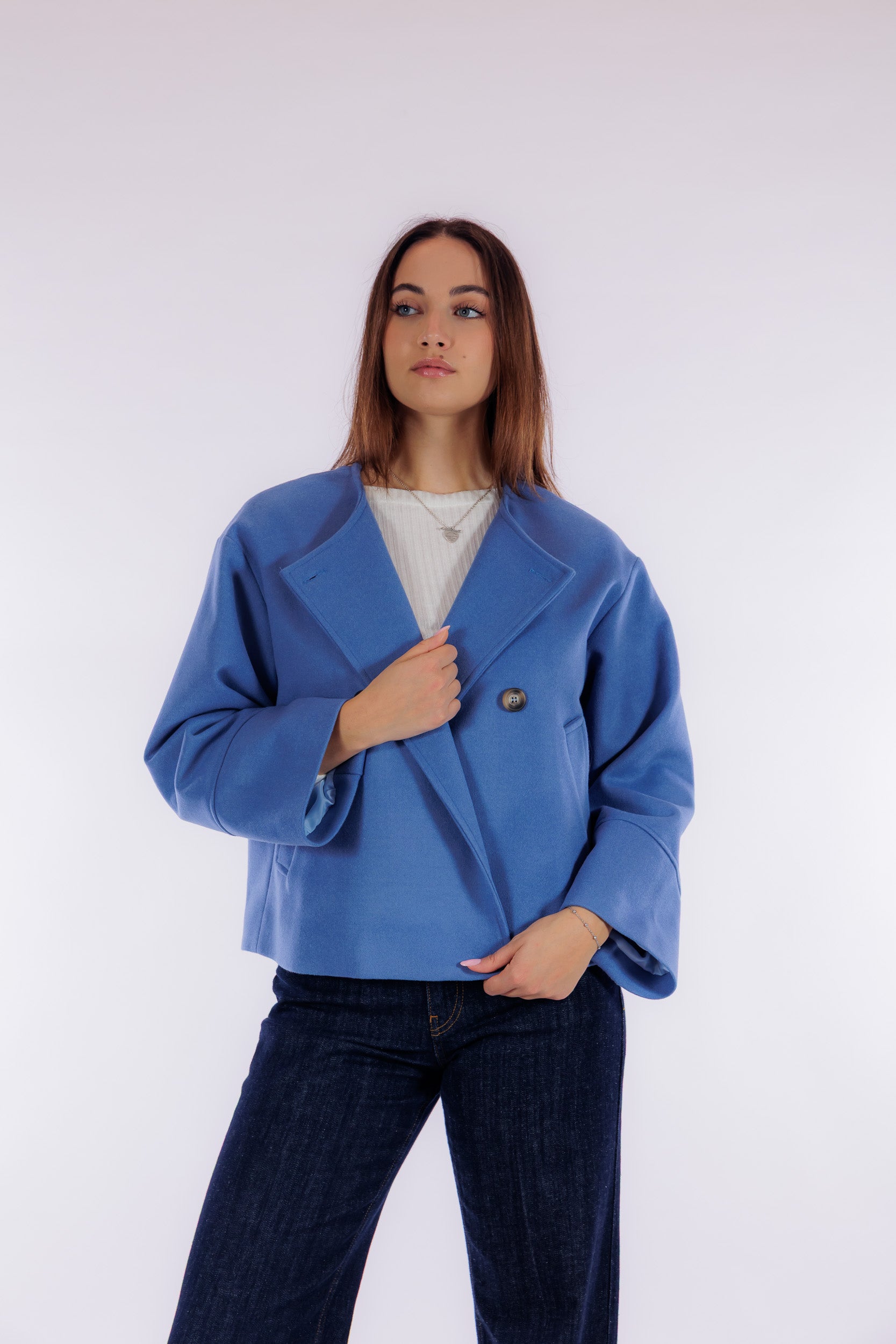Questa cappa corta al bacino offre una vestibilità over con spalle scese per un comfort ottimale. Foderata internamente in raso, assicura una sensazione morbida al tatto. Presenta una chiusura centrale doppiopetto con bottoni grandi, pratiche tasche frontali e una sciarpa removibile tramite bottone dietro il collo, garantendo versatilità e stile raffinato.