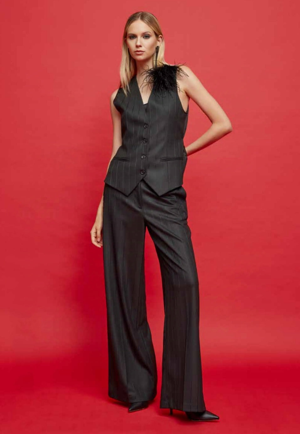 Esplora l'eleganza e il comfort del nostro completo in flanella gessato. Perfetto per le occasioni più fashion, il gilet scollato a V si apre con 4 bottoni, decorato con un cinturino dietro e tasche frontali a due filetti. Il pantalone a palazzo si apre con zip e bottoni, con tasche alla francese e passanti per un eventuale cintura per un look sofisticato e pratico.