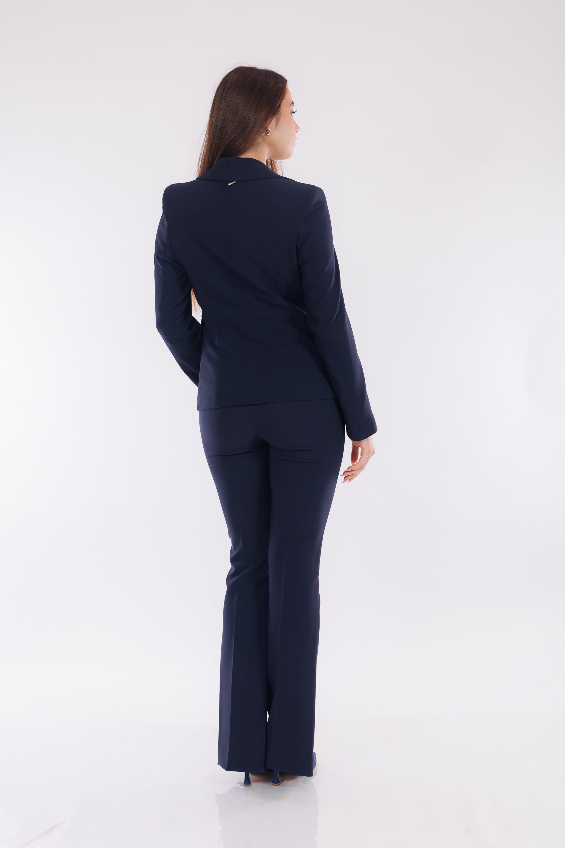 Questo tailleur elegante, professionale e femminile si distingue per la giacca monopetto con un bottone e rever leggermente arrotondati, che valorizzano il taglio in vita per una silhouette sfiancata. Le finte taschine a pattina aggiungono un dettaglio chic, mentre la fodera in raso conferma la qualità di questo capo. Il pantalone a vita alta, senza bottoni e dotato di zip laterale, presenta un modello flare che allunga la gamba e dona un tocco moderno e sofisticato. Una scelta perfetta per chi cerca stile e comfort in ogni occasione.