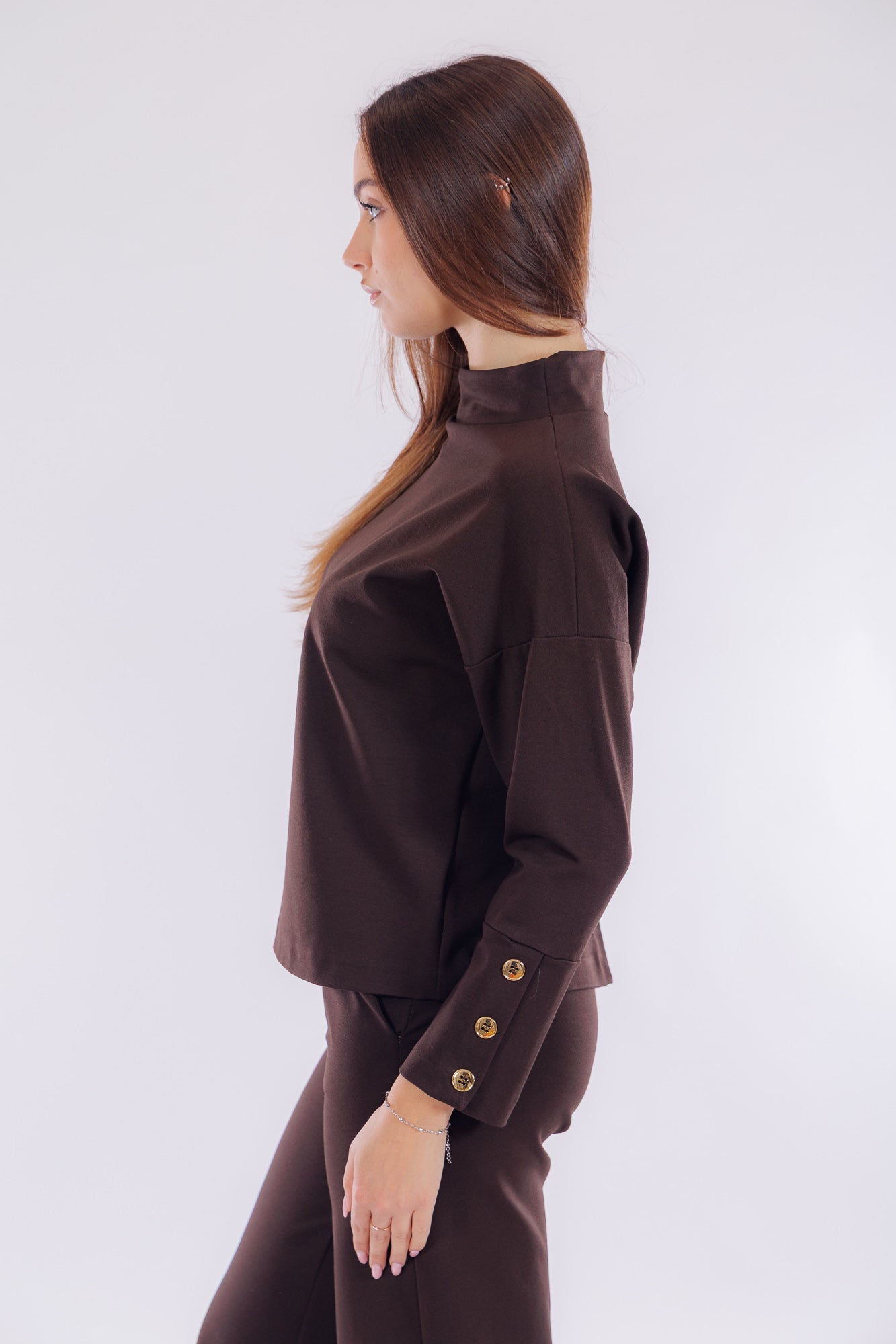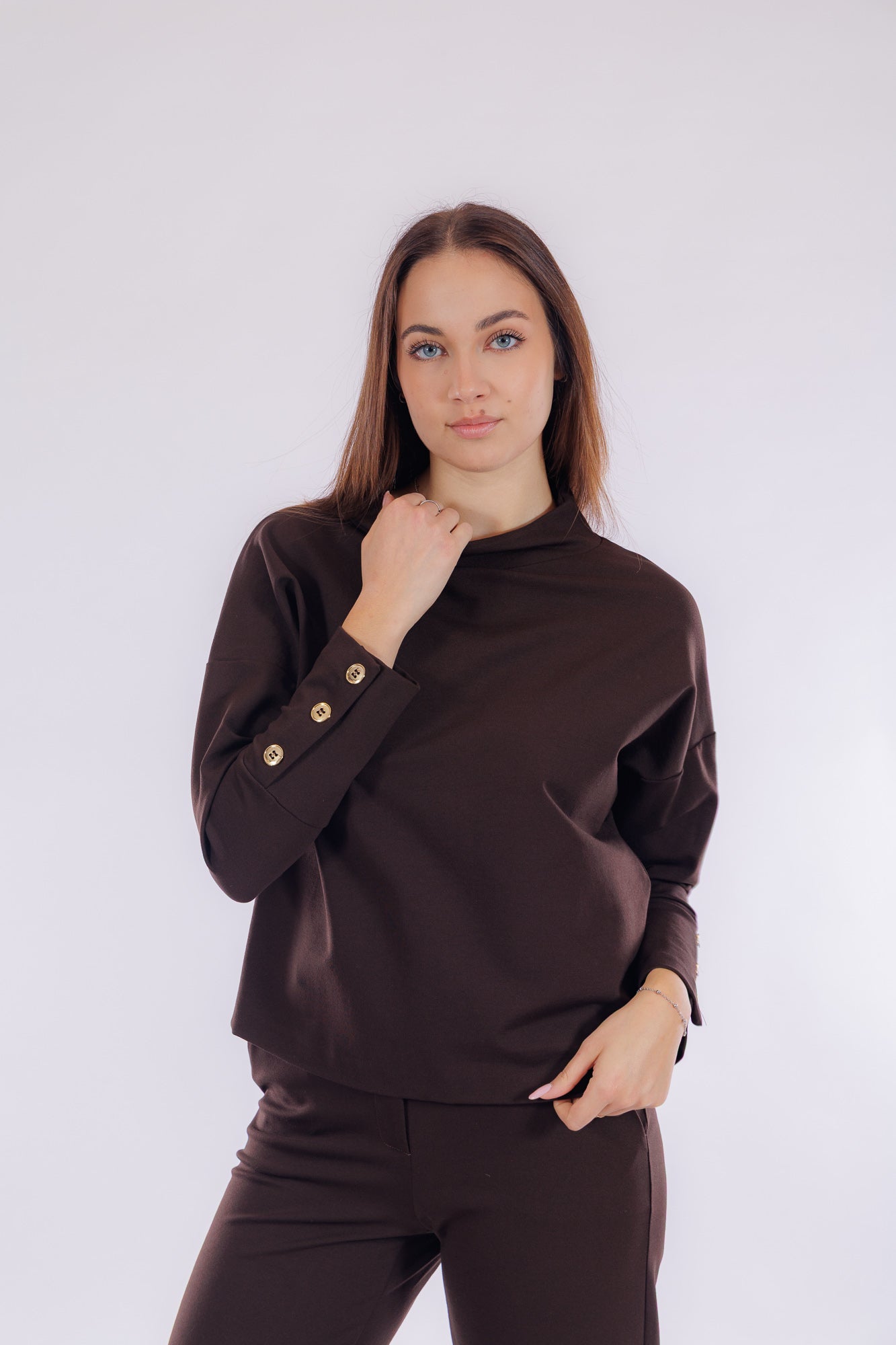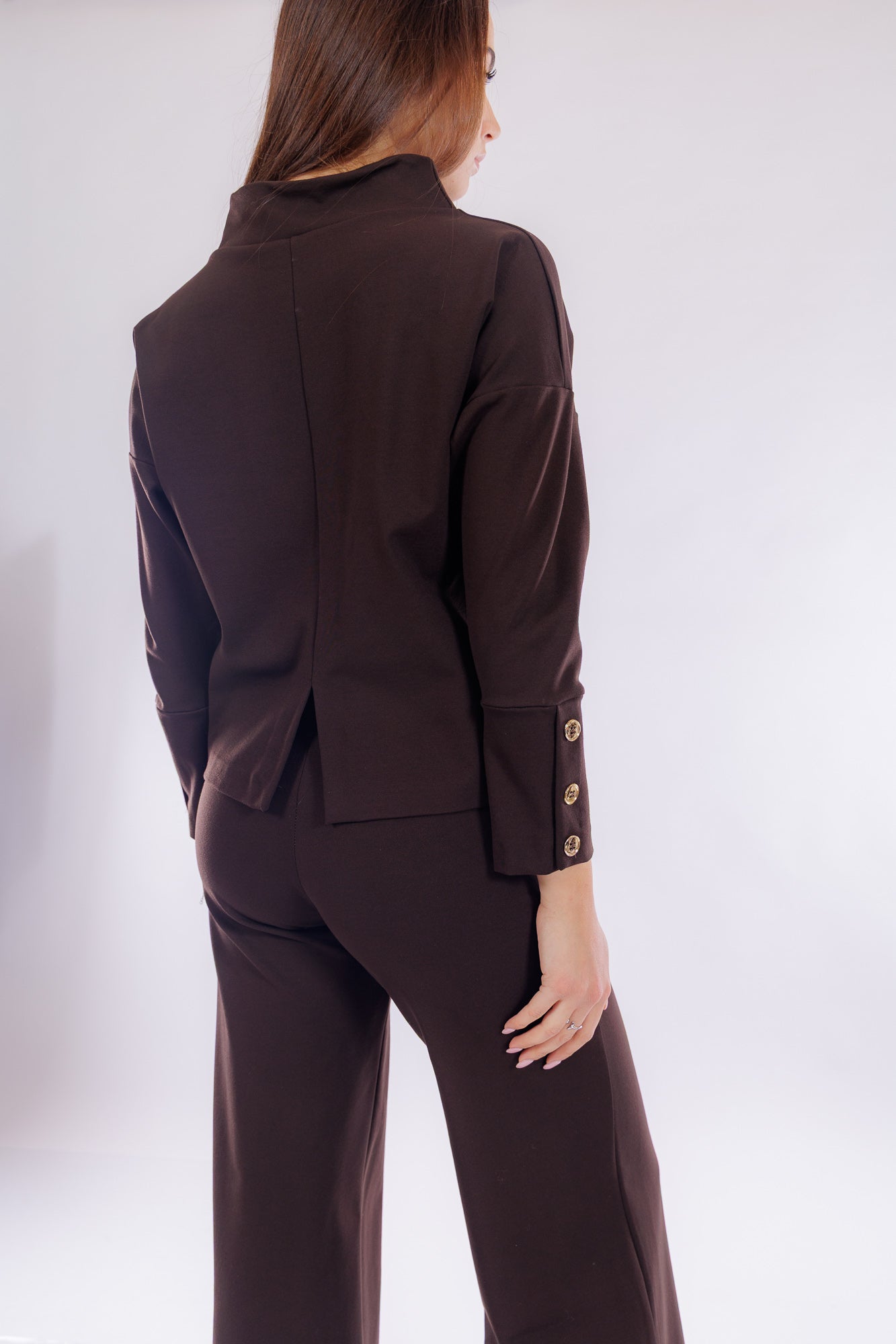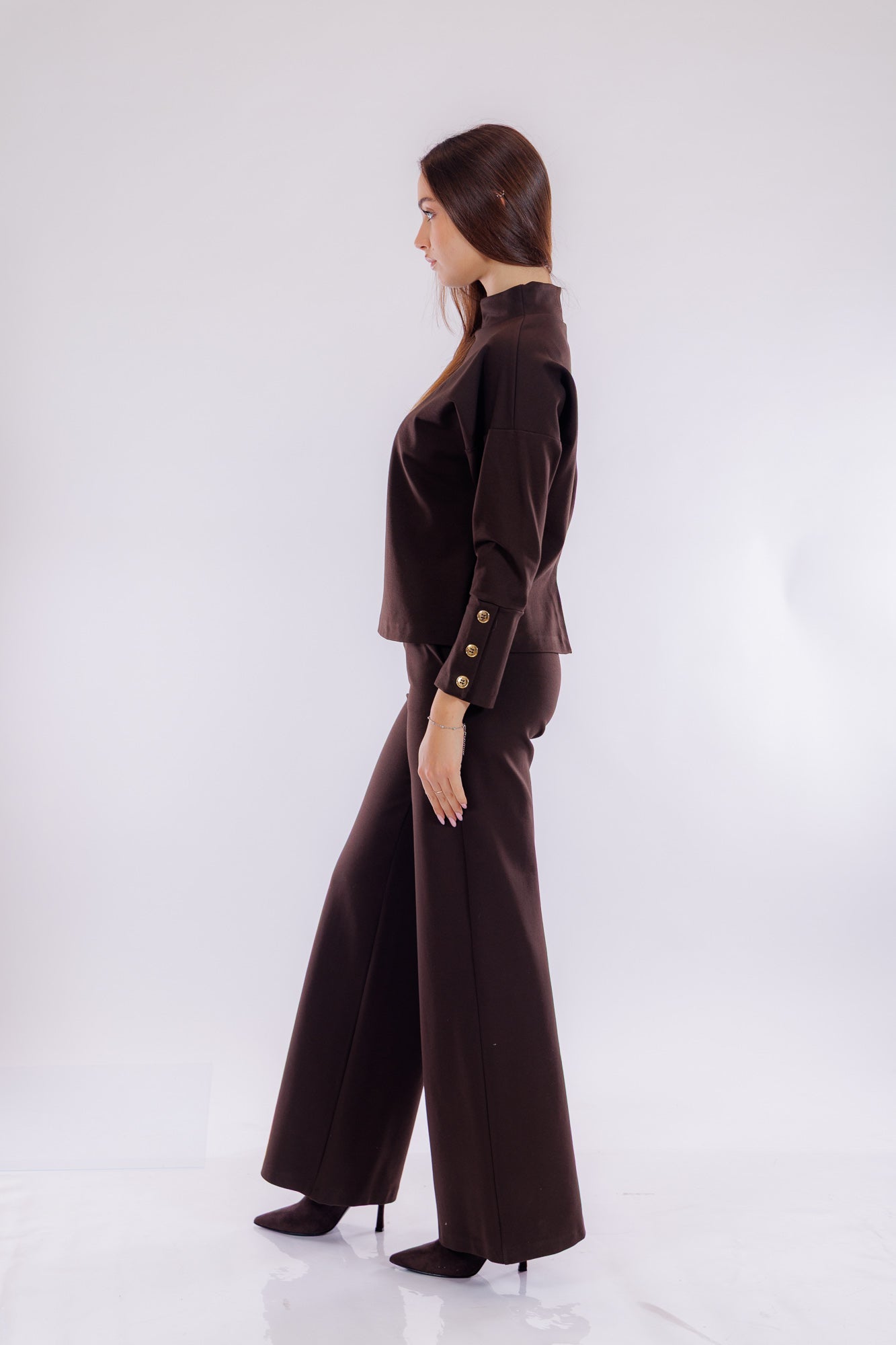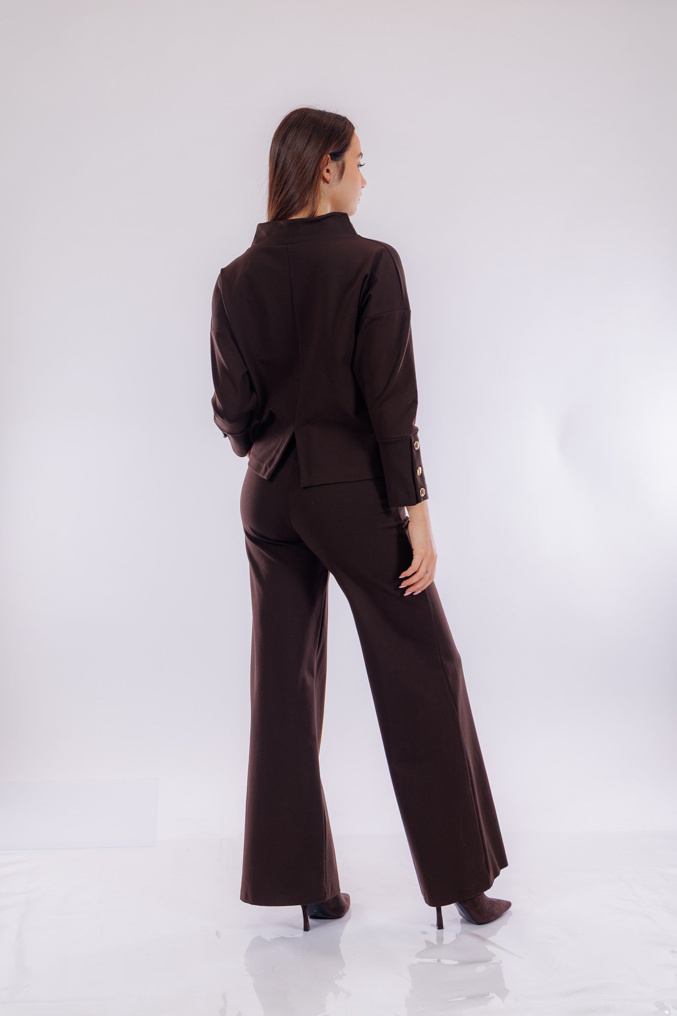 Completo di tessuto punto milano con blusa over, caratterizzata da spalle scese, vestibilità morbida e lunghezza al bacino. Particolarissimi i polsi alti arricchiti da bottoni oro e spacchetto dietro la blusa che dona quel tocco in più di stile e praticità. Il pantalone è a palazzo con tasche francesi e passanti in vita per cintura. Chiusura sicura con zip, bottone e gancetto interno. Con questo tessuto comodo e elasticizzato, il completo è perfetto per essere chic e sempre a tuo agio.