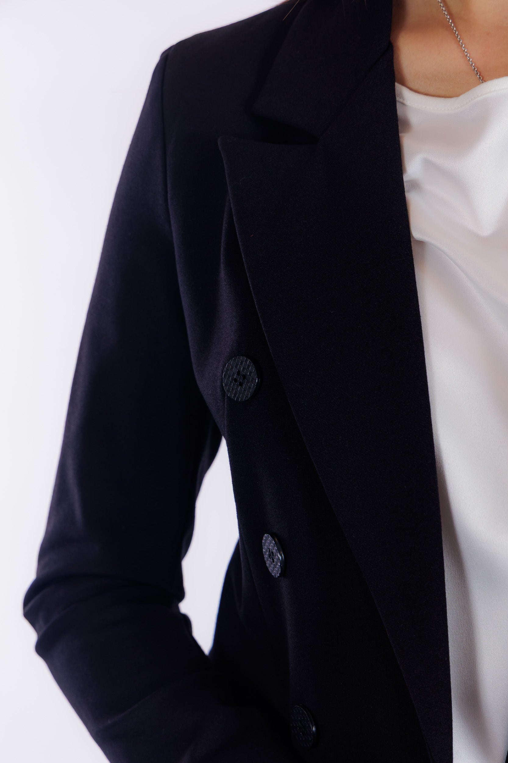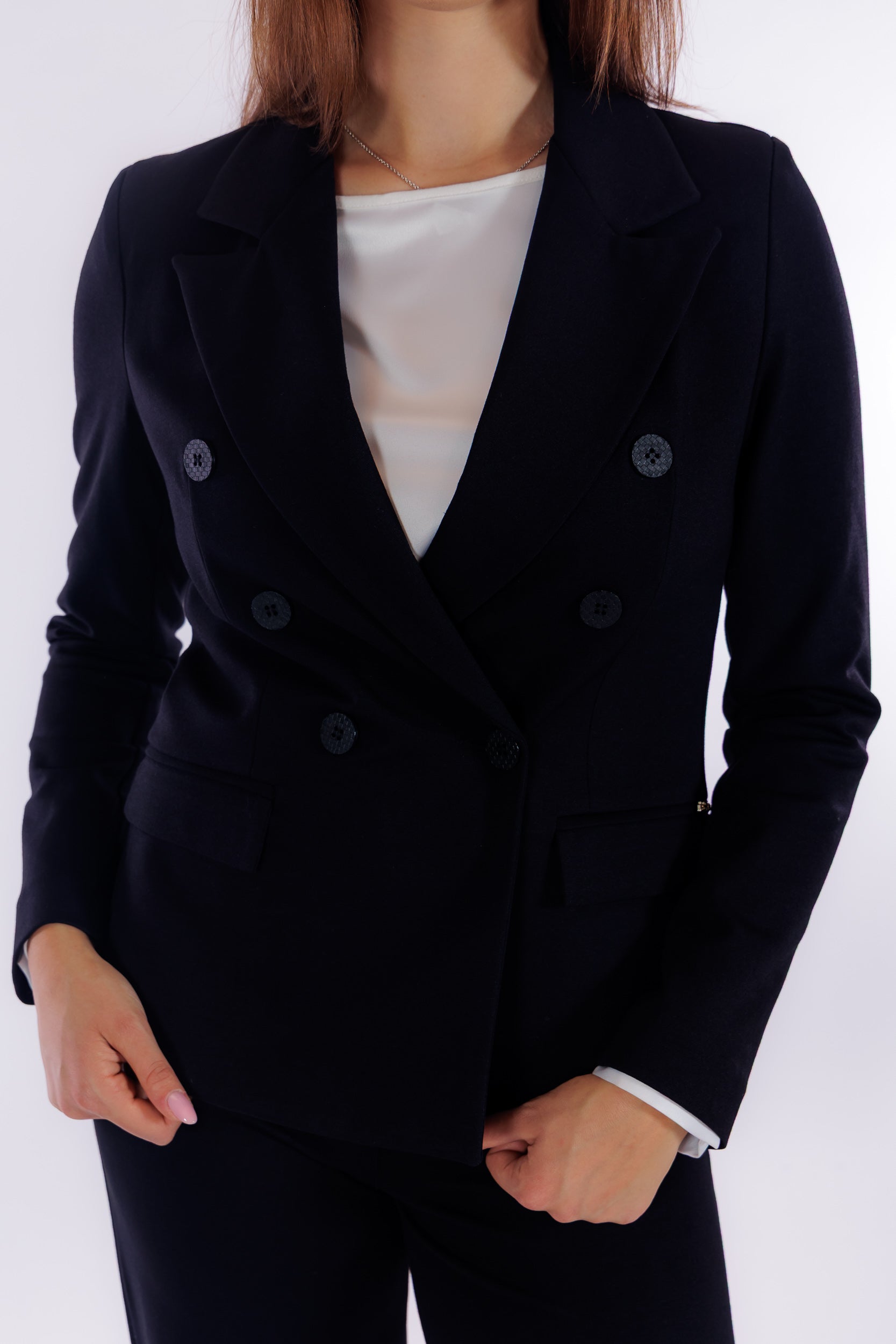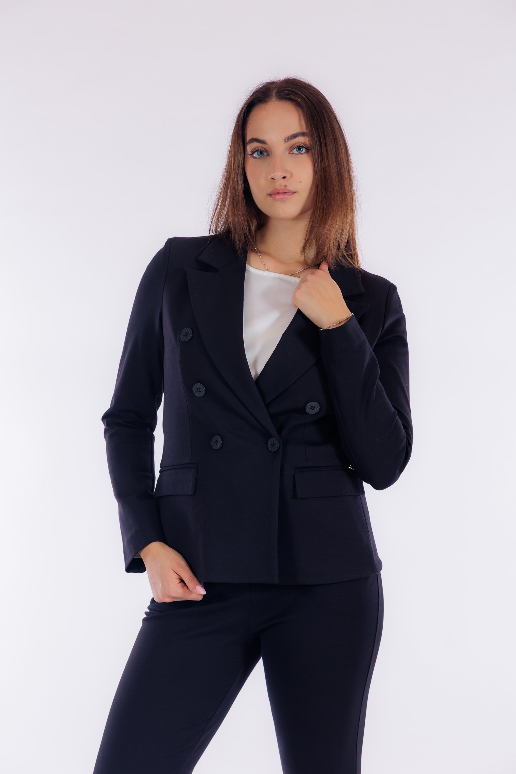 Questa giacca doppiopetto in punto milano presenta un taglio sfiancato con riprese sul seno e fianchetti laterali, garantendo una silhouette elegante e femminile. Il modello si distingue per lo scollo a V e i revers classici, mentre le finte tasche a pattina e filetto nella parte frontale aggiungono un dettaglio raffinato. Completamente sfoderata all’interno, assicura comfort e versatilità ideale per un look sofisticato e professionale.