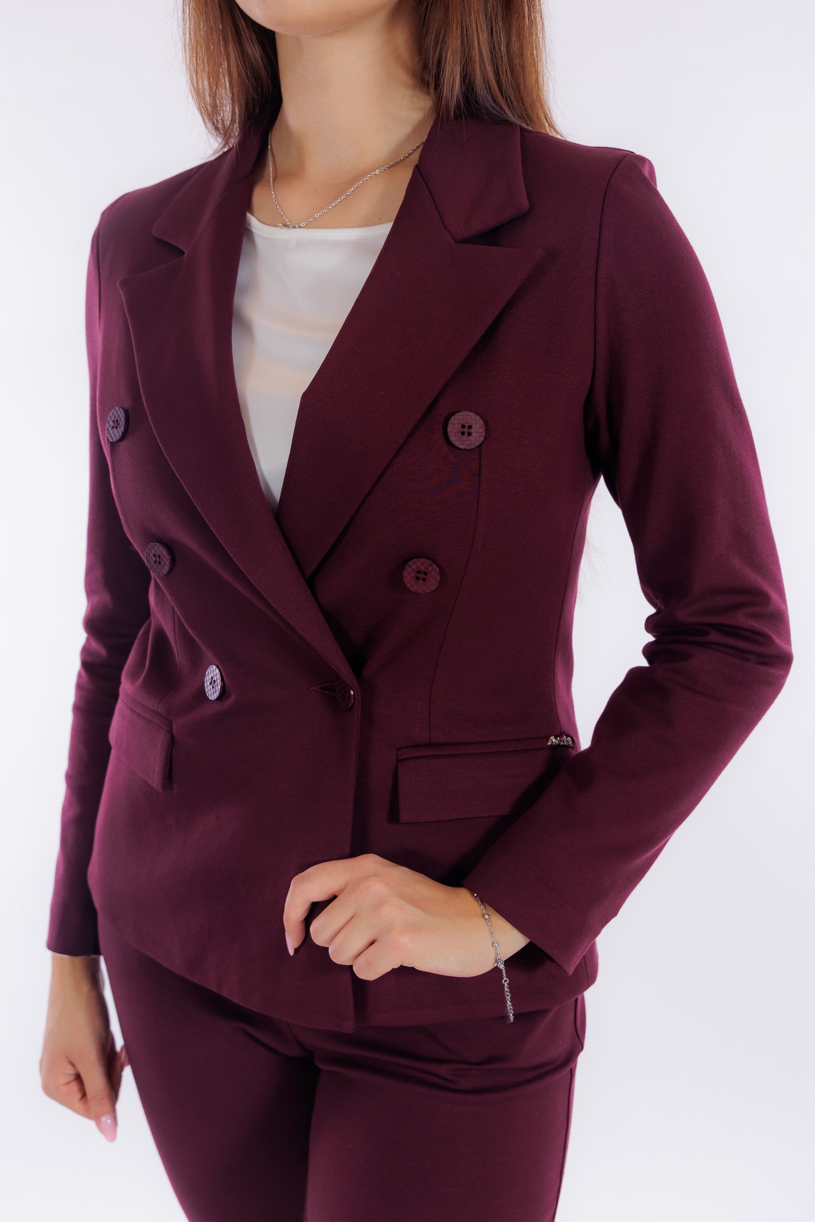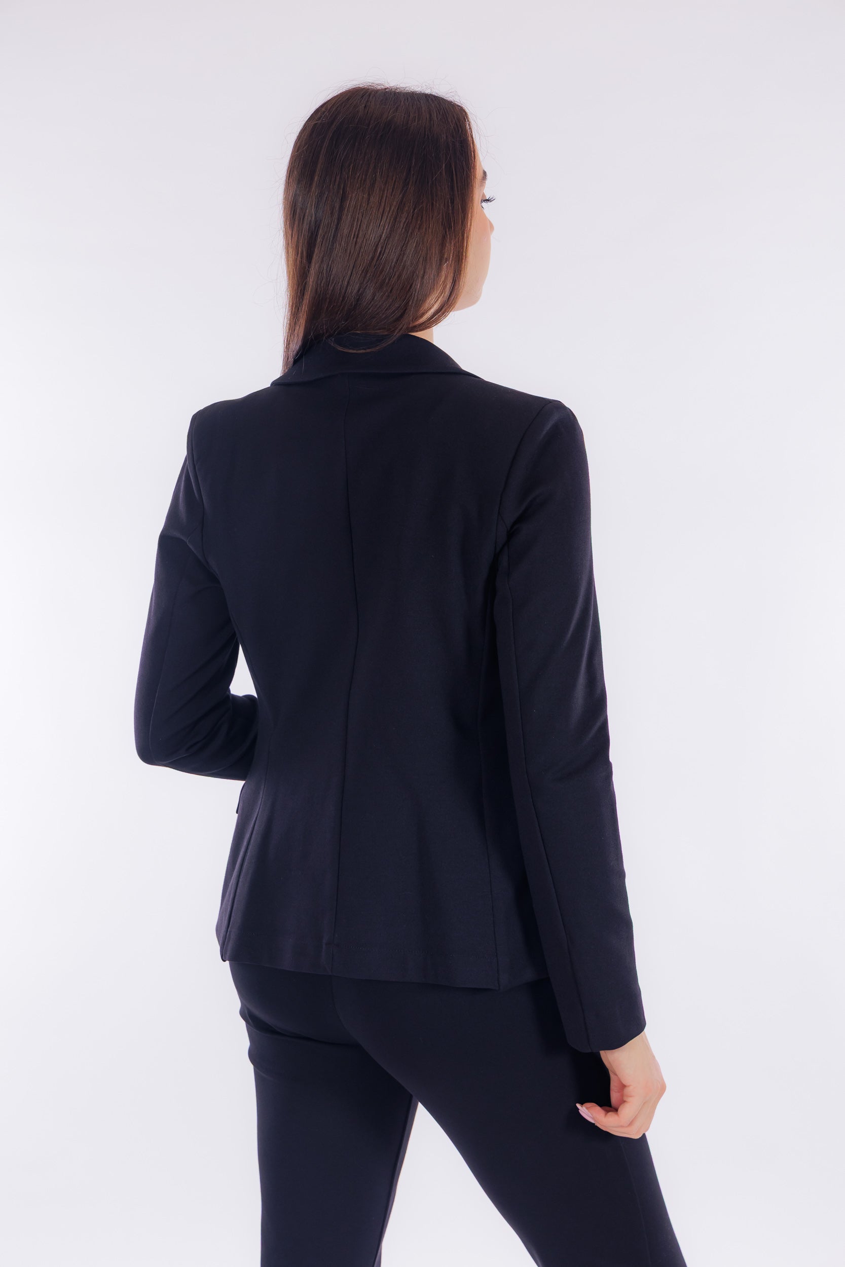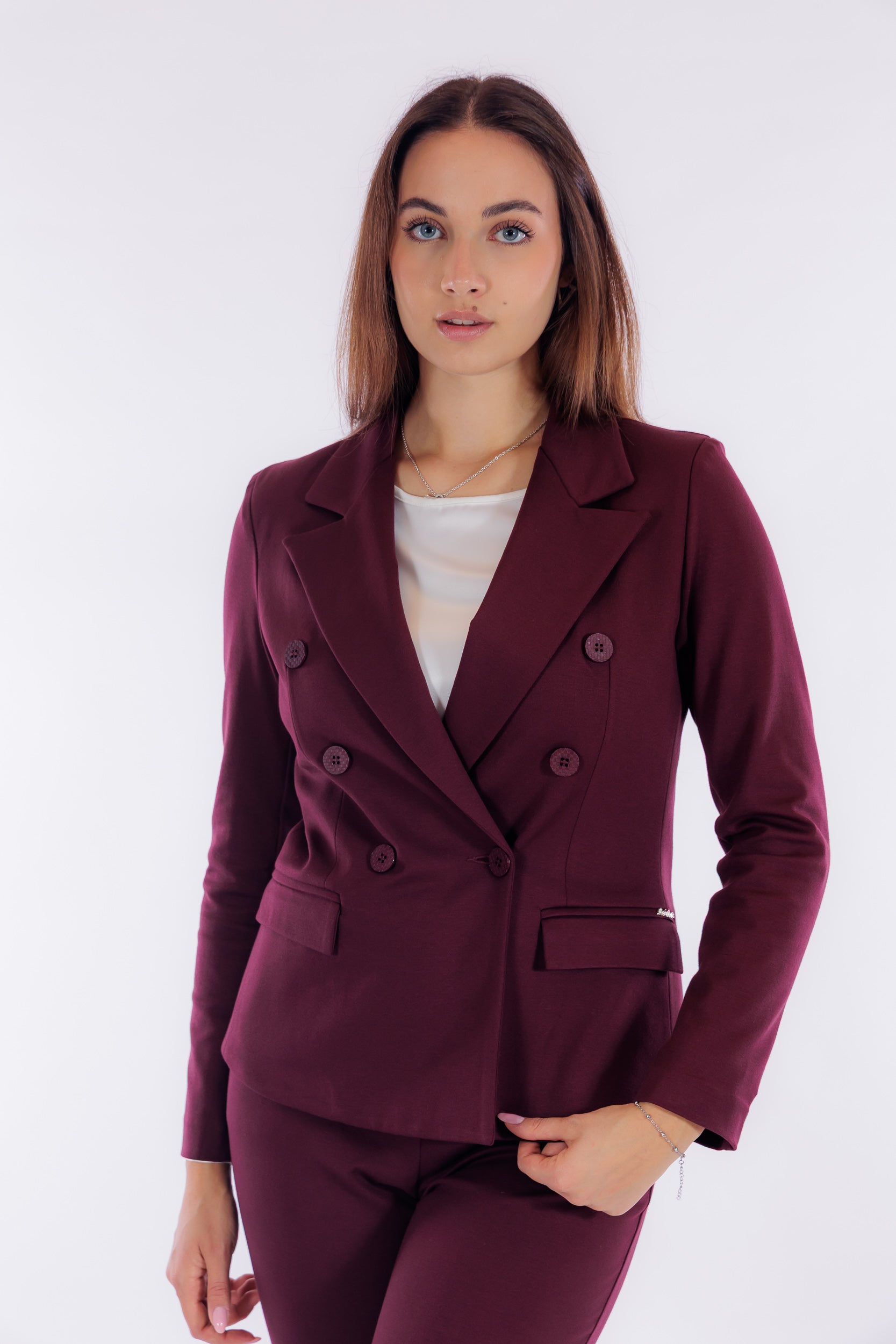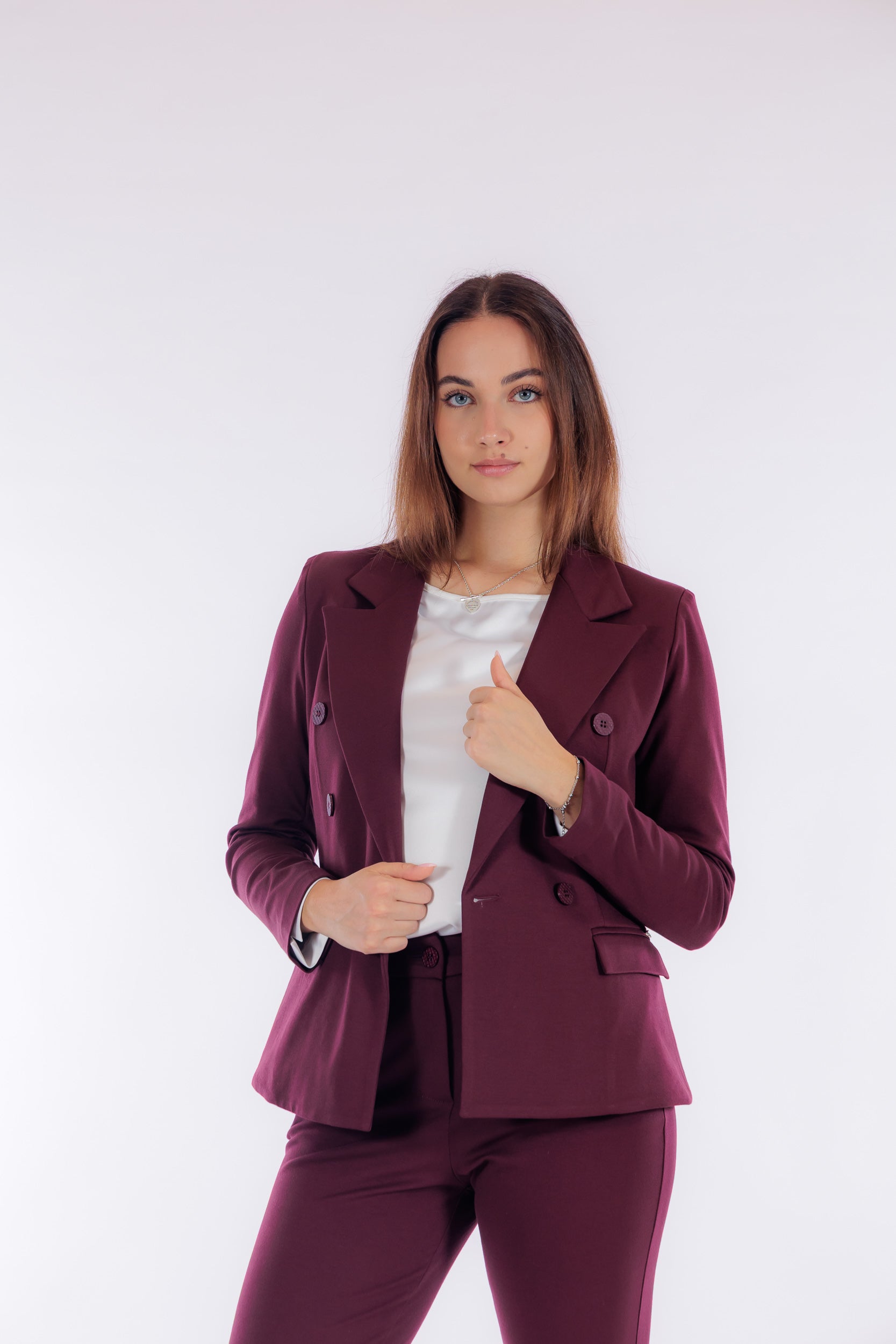 Questa giacca doppiopetto in punto milano presenta un taglio sfiancato con riprese sul seno e fianchetti laterali, garantendo una silhouette elegante e femminile. Il modello si distingue per lo scollo a V e i revers classici, mentre le finte tasche a pattina e filetto nella parte frontale aggiungono un dettaglio raffinato. Completamente sfoderata all’interno, assicura comfort e versatilità ideale per un look sofisticato e professionale.