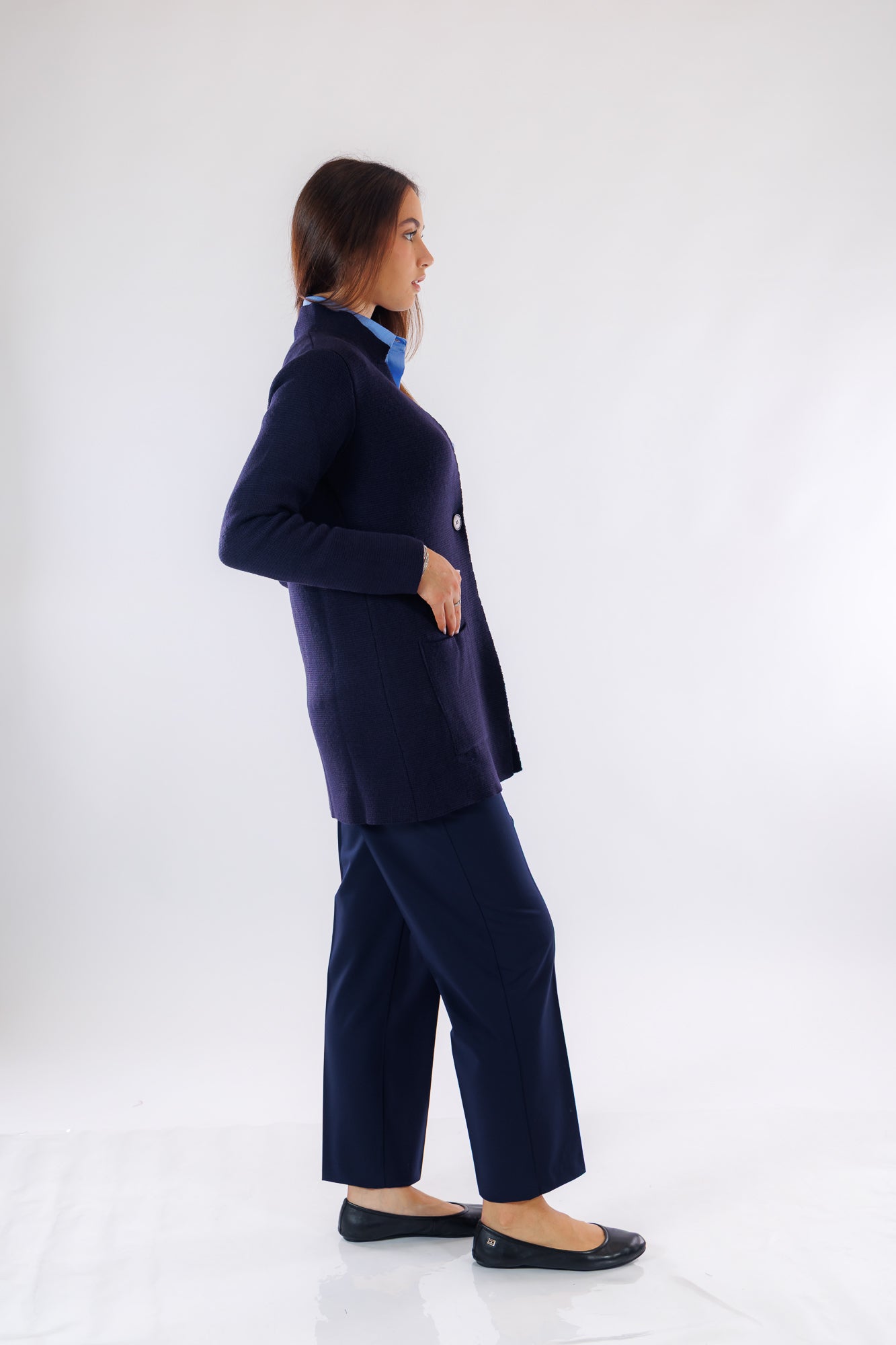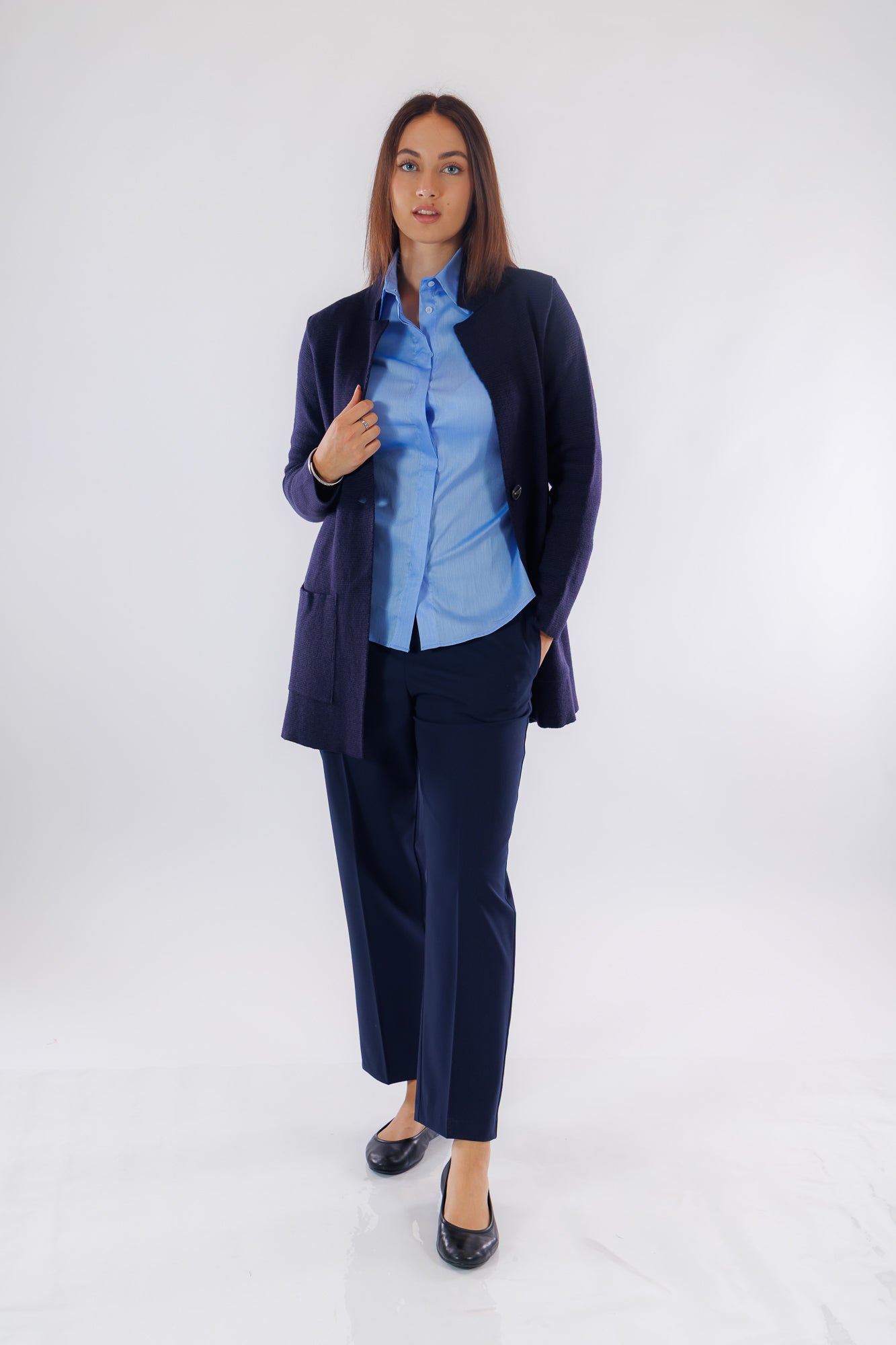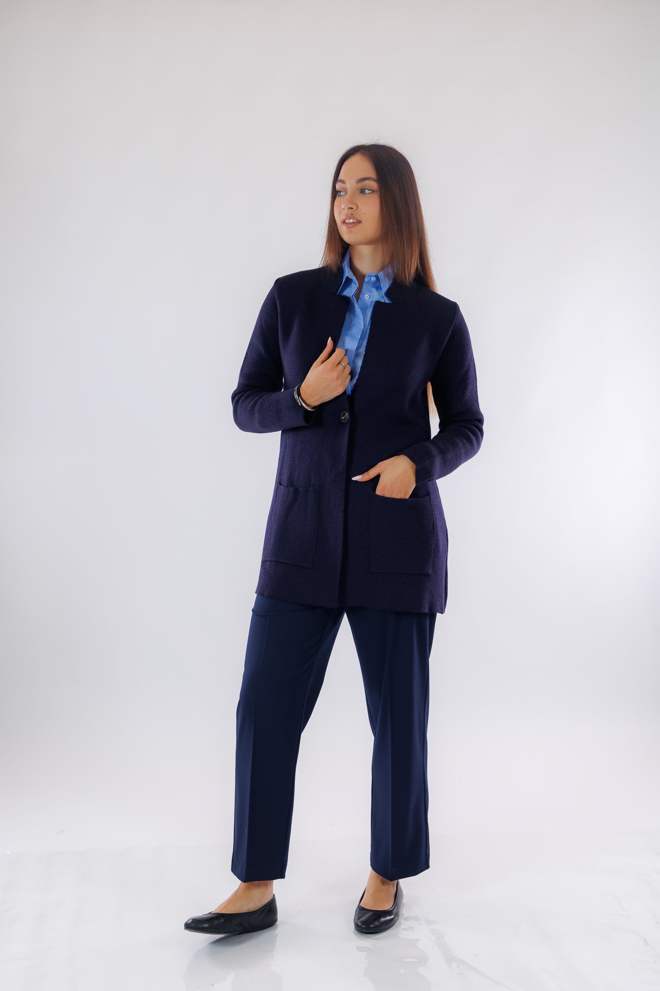 Questa giacca lunga in tessuto punto stoffa misto lana, offre una vestibilità comoda e progettata per il comfort quotidiano. Il colletto a piccoli rever e la chiusura monopetto con un bottone aggiungono un tocco di eleganza sobria, mentre la lunghezza sotto il sedere garantisce un'ottima copertura. Le maniche lunghe e le tasche a toppa completano il design, unendo funzionalità e stile in un capo raffinato adatto a diverse occasioni.