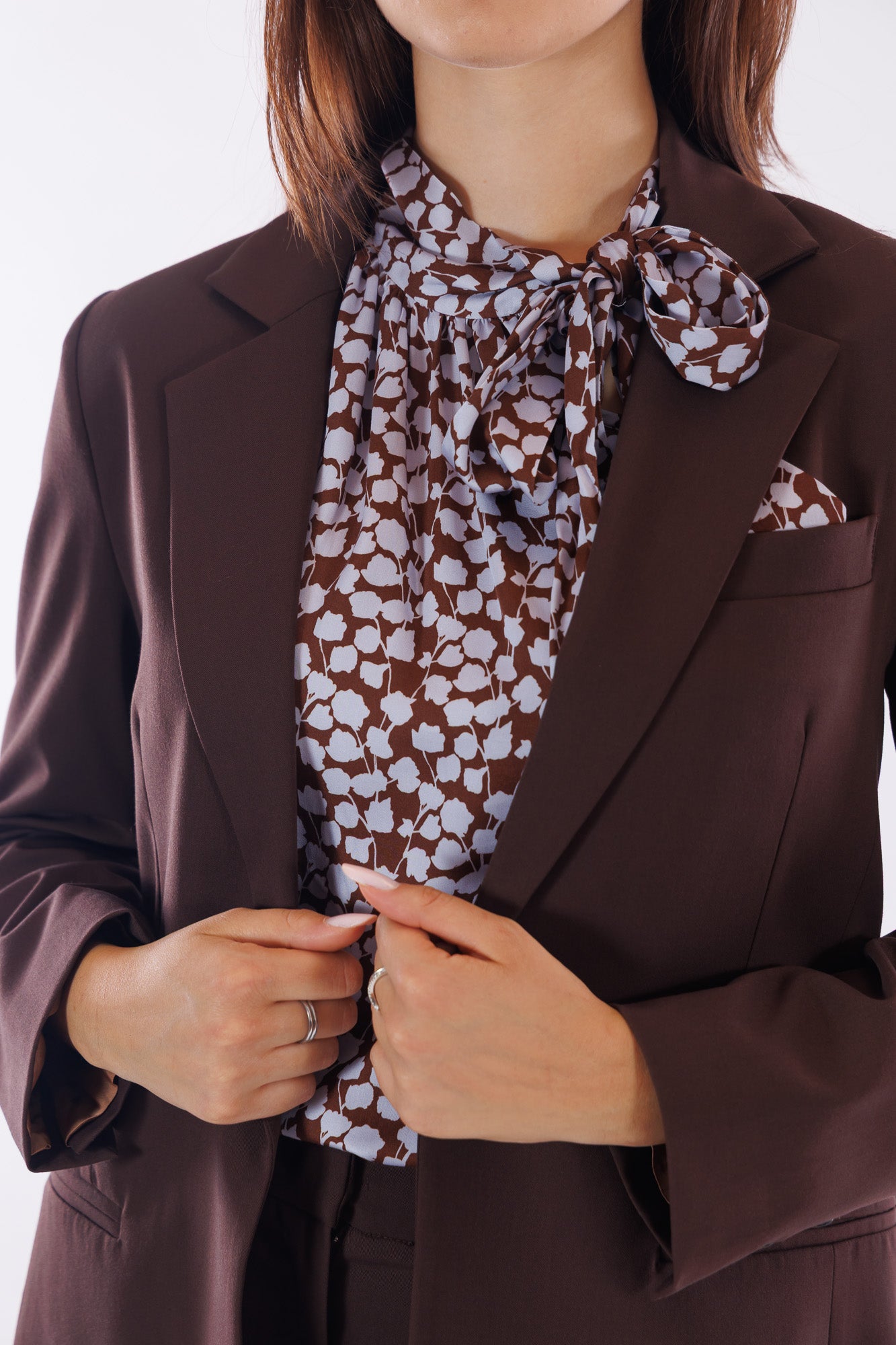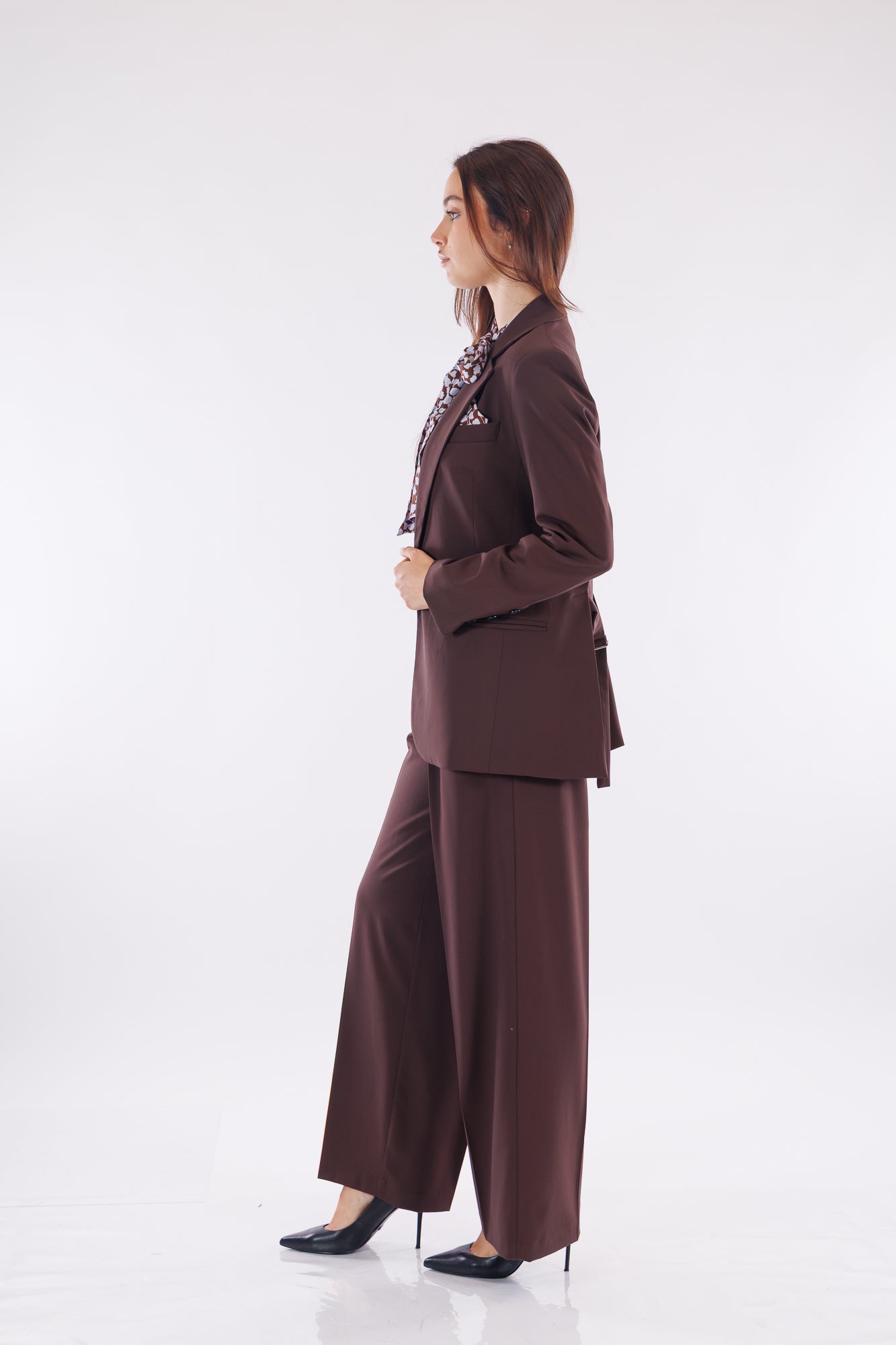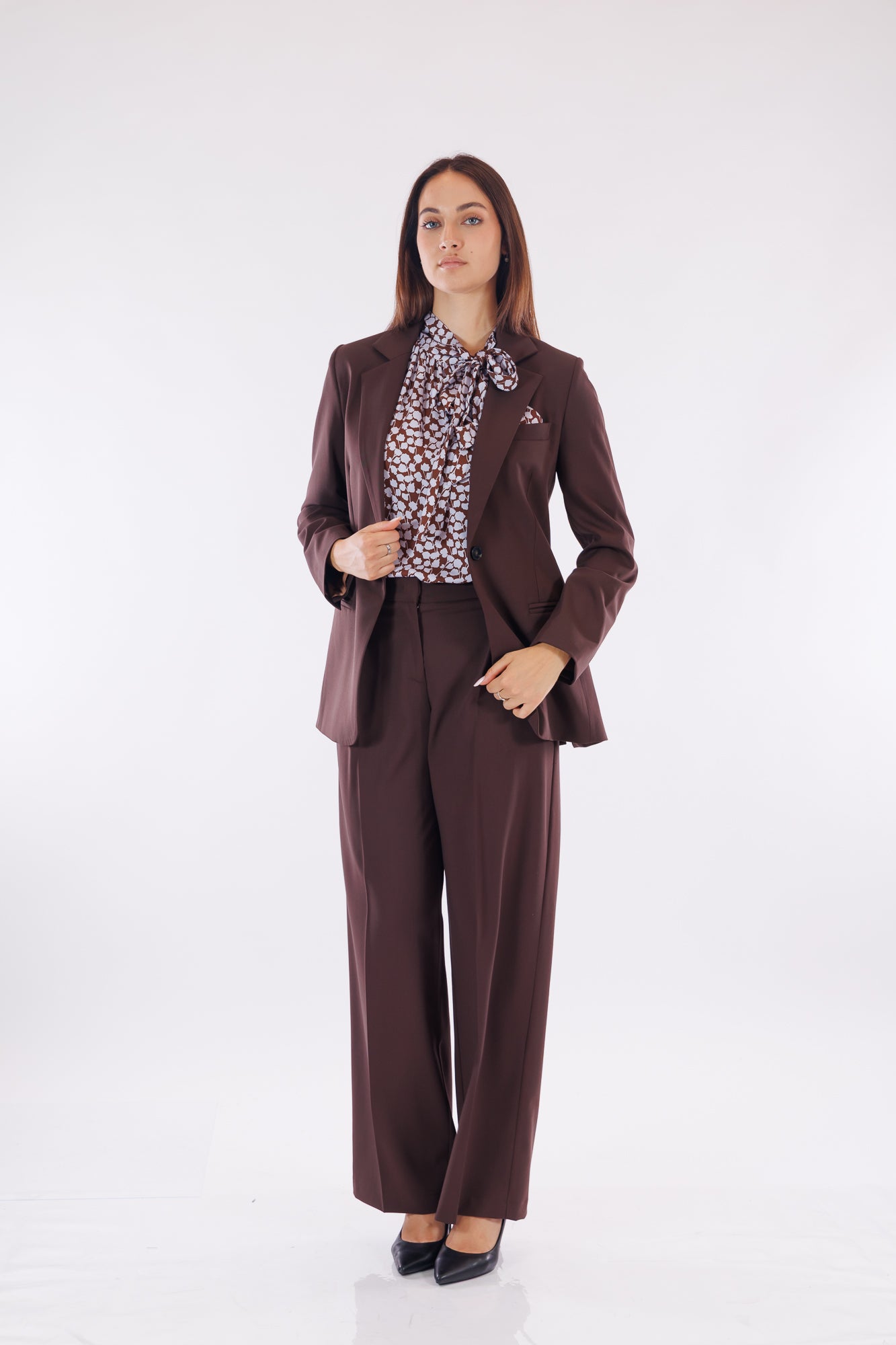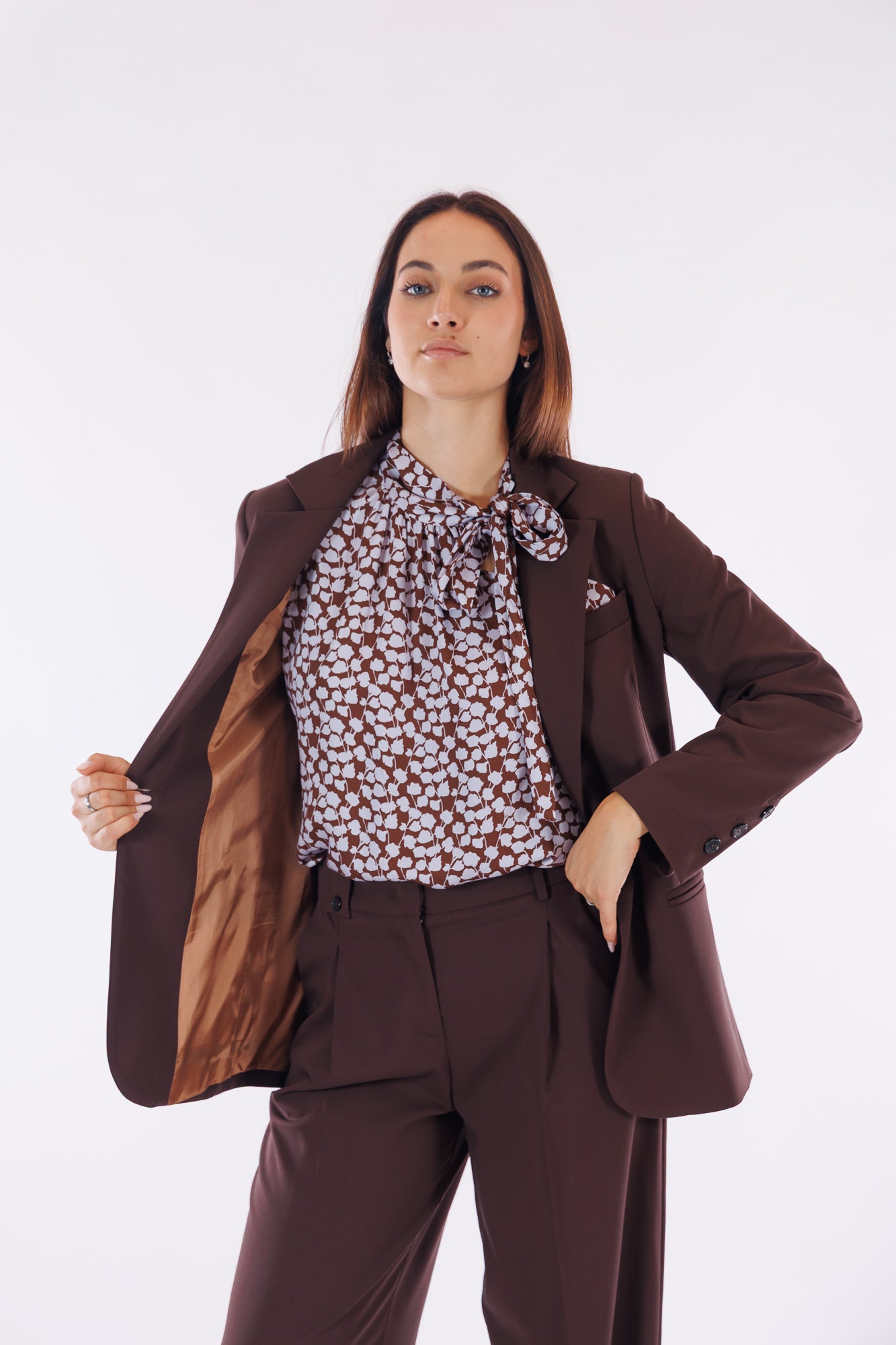 Per fare un total look Kartika, consigliamo anche il "Pantalone sartoriale misto lana" e il "Top fiocco stampa fiorellini", che riprende benissimo la fantasia del fazzoletto in petto.