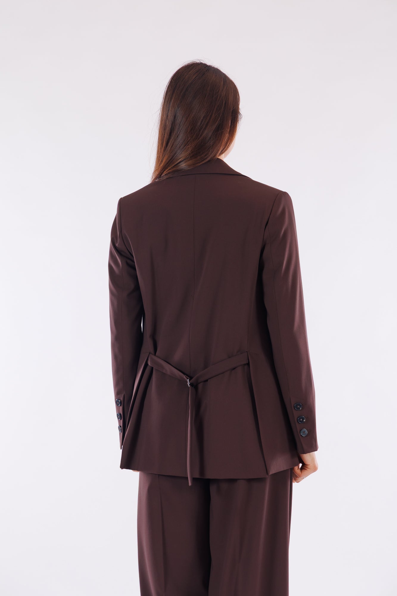 Questa giacca sartoriale in misto lana offre un design monopetto con un bottone per uno stile pulito e raffinato. Il taschino sul petto, impreziosito da un fazzoletto fantasia, aggiunge un tocco distintivo. I polsini presentano tre bottoni, mentre le due tasche a filetto davanti sono finte per mantenere linee essenziali. Il retro è caratterizzato da una cinturina regolabile che assicura una vestibilità sfiancata e due spacchi, ideali per garantire comfort e libertà di movimento.