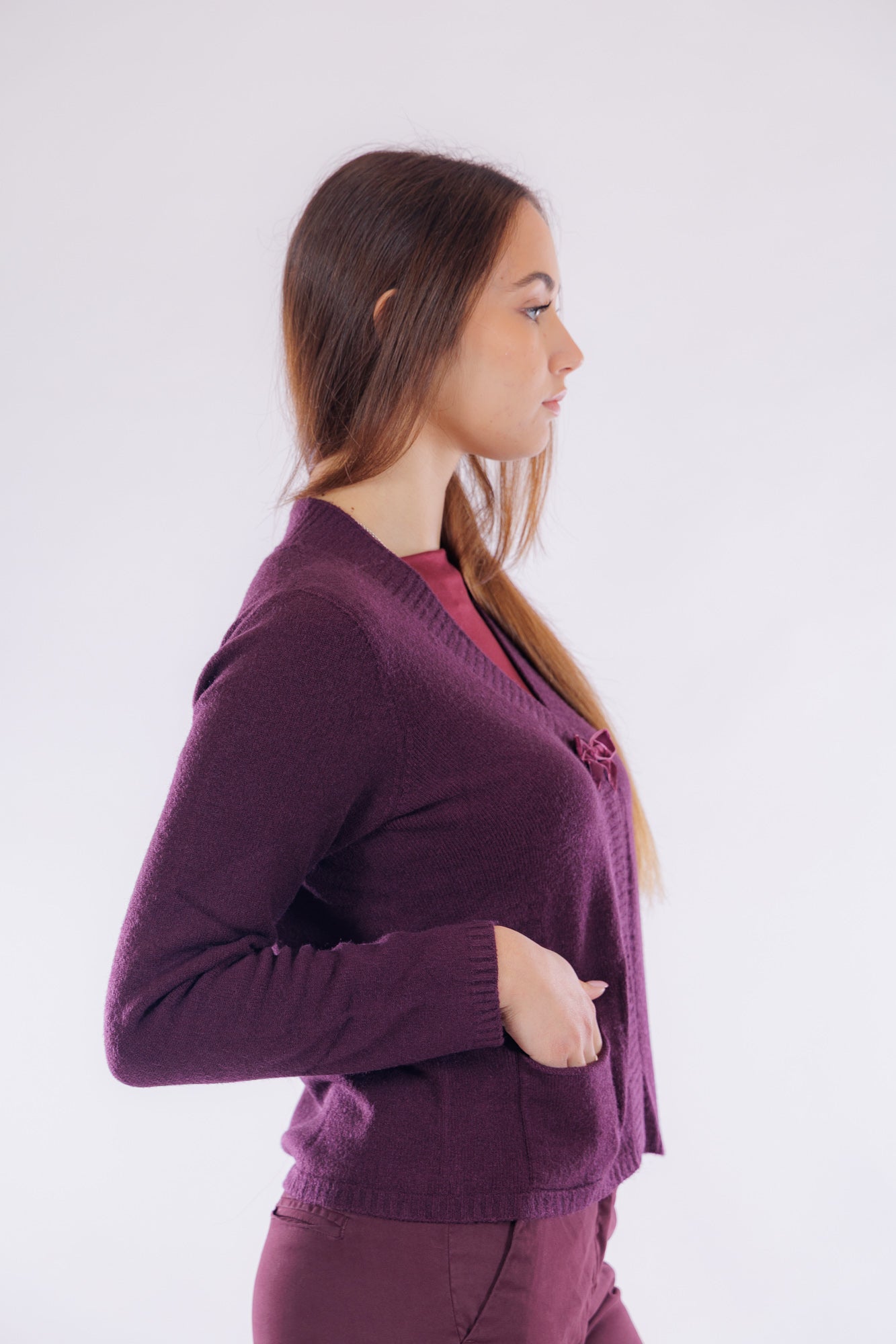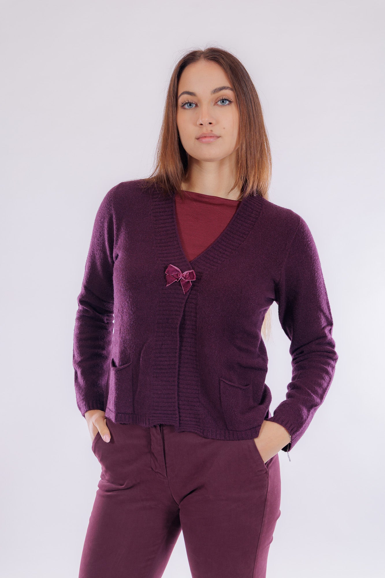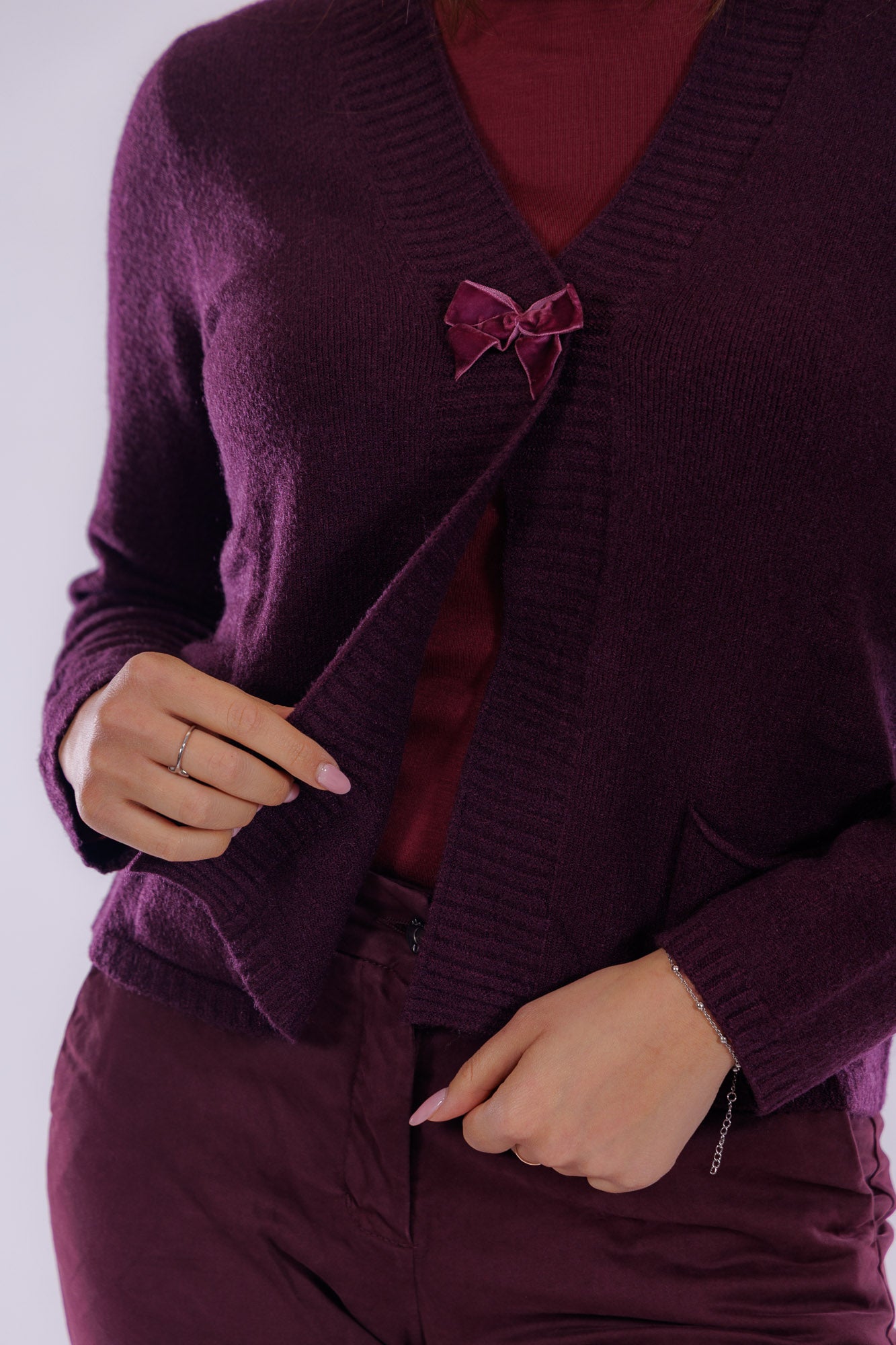 La giacchina fiocco è il perfetto capo di maglieria per completare il tuo look elegante. Con uno scollo a V e un fiocchetto in velluto al centro del petto, sarà una scelta sofisticata e alla moda. La vestibilità asciutta e le taschine applicate davanti offrono comfort e funzionalità. Lunghezza al bacino per un tocco extra di stile.