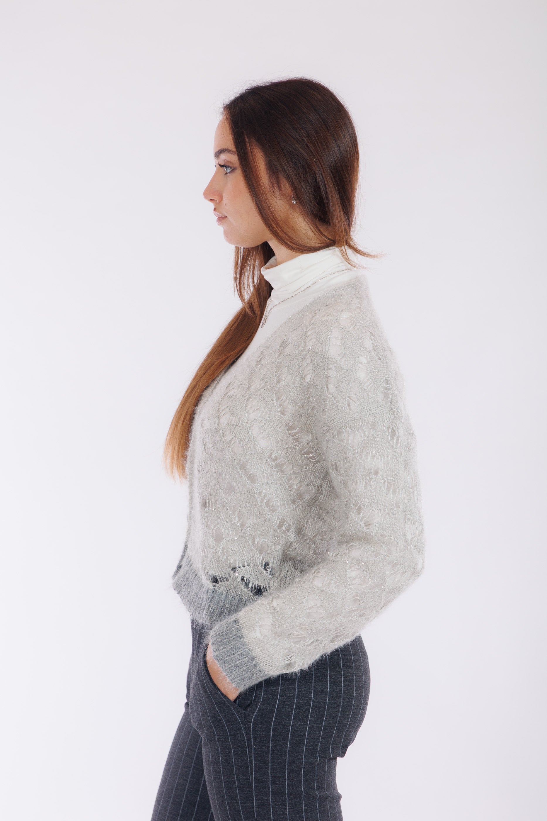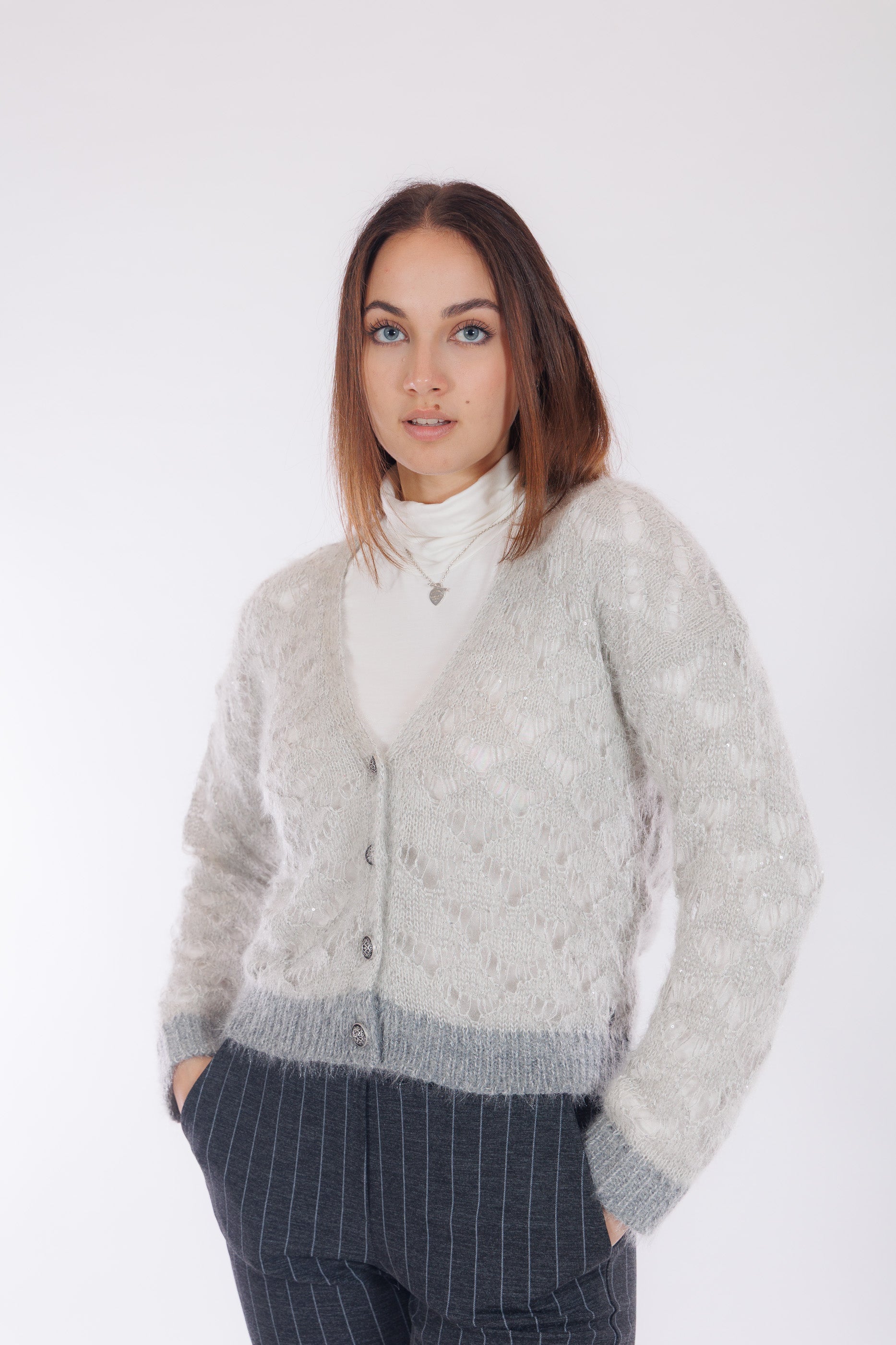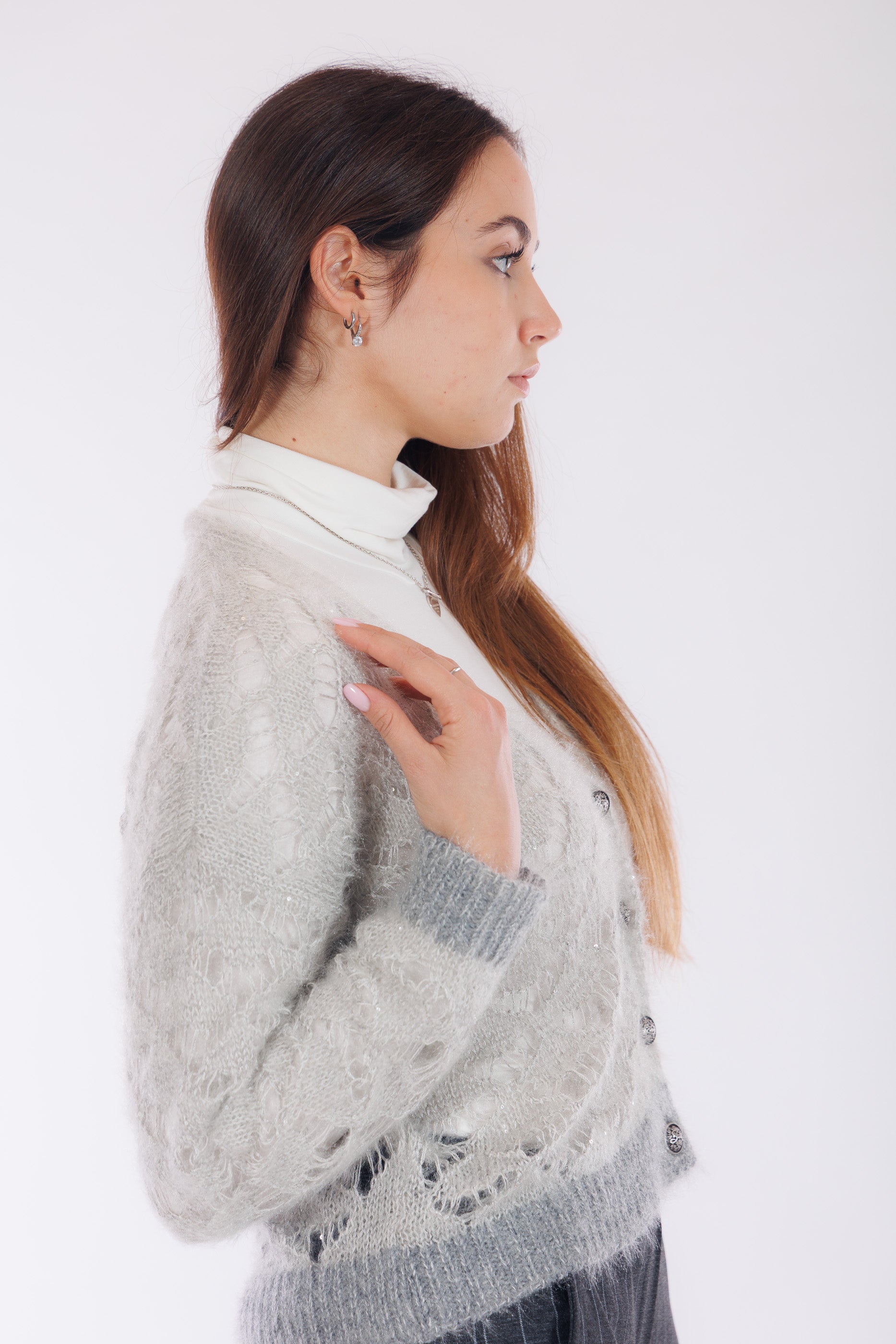 Questa giacchina corta al bacino presenta una lavorazione traforata a rombi che crea un effetto semitrasparente, valorizzando l’eleganza della trama con micro paillettes. Lo scollo a V e l’apertura centrale con grandi bottoni grigi decorati aggiungono carattere, mentre le maniche lunghe e la vestibilità asciutta garantiscono una silhouette raffinata e moderna. La mano pelosetta dona una sensazione di morbidezza, rendendo questo capo perfetto per un tocco sofisticato e chic nel guardaroba.