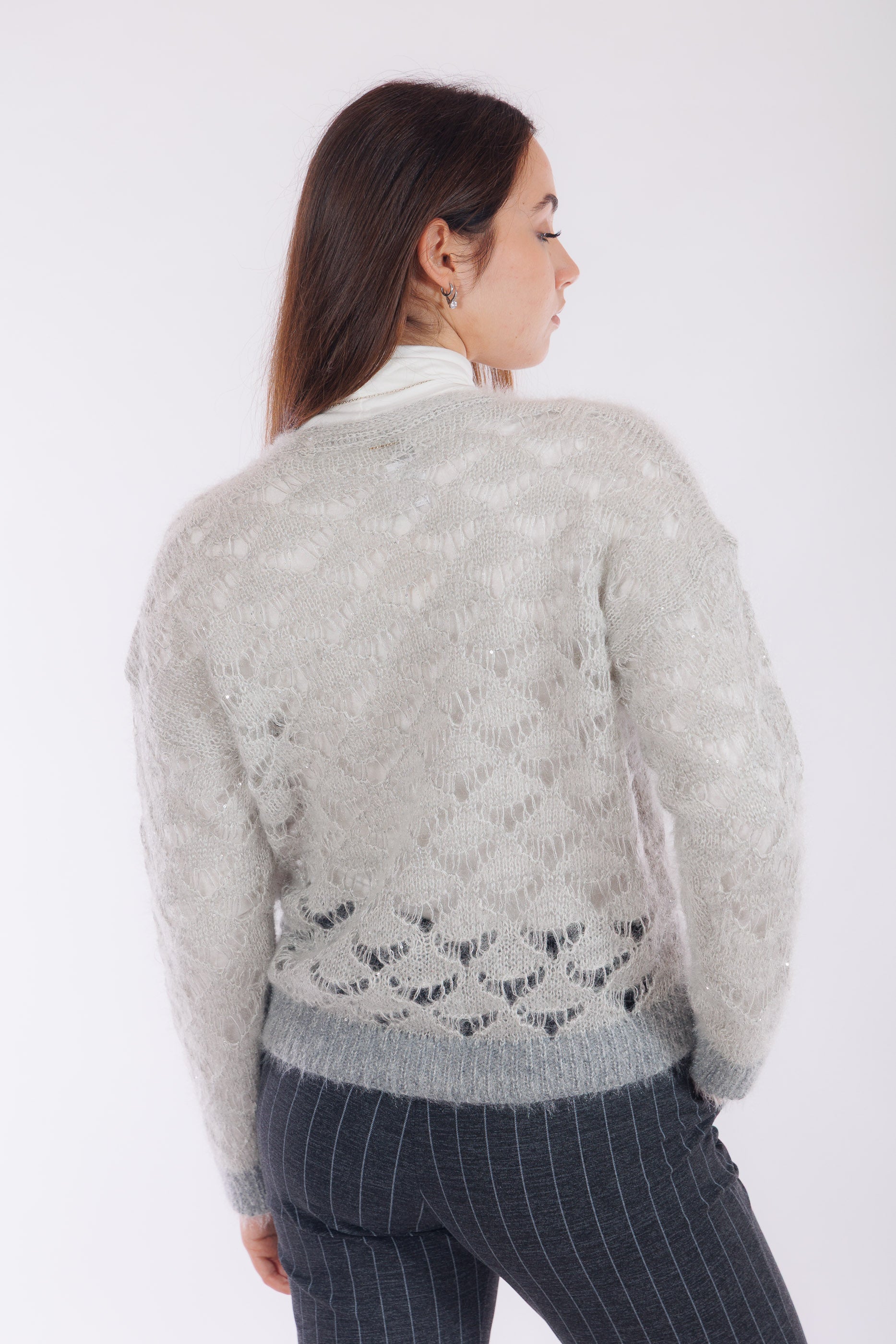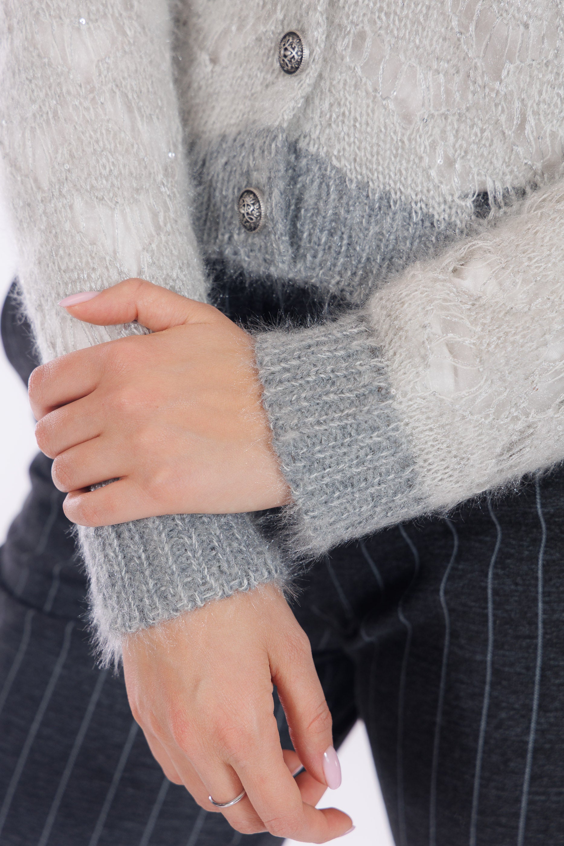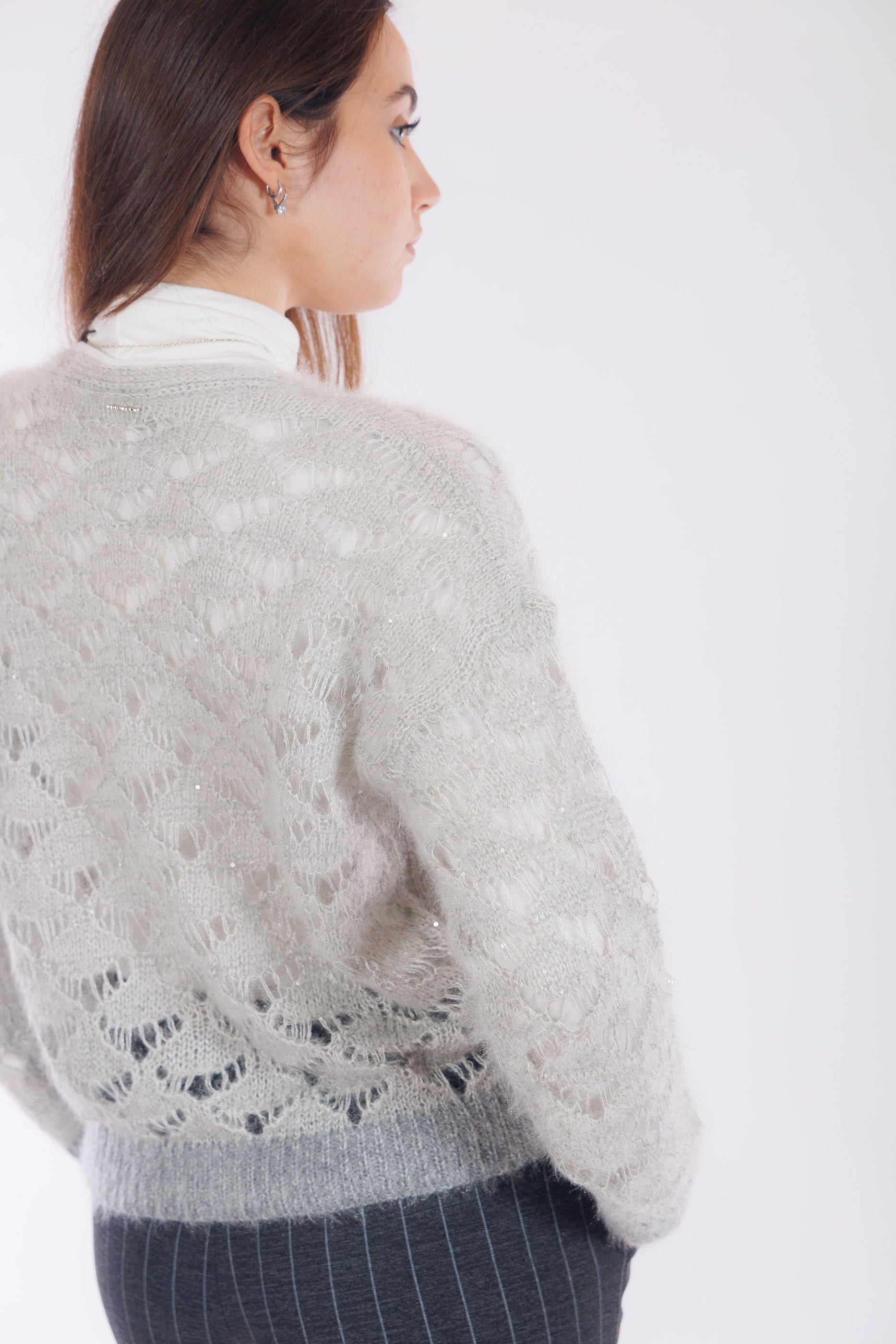 Questa giacchina corta al bacino presenta una lavorazione traforata a rombi che crea un effetto semitrasparente, valorizzando l’eleganza della trama con micro paillettes. Lo scollo a V e l’apertura centrale con grandi bottoni grigi decorati aggiungono carattere, mentre le maniche lunghe e la vestibilità asciutta garantiscono una silhouette raffinata e moderna. La mano pelosetta dona una sensazione di morbidezza, rendendo questo capo perfetto per un tocco sofisticato e chic nel guardaroba.