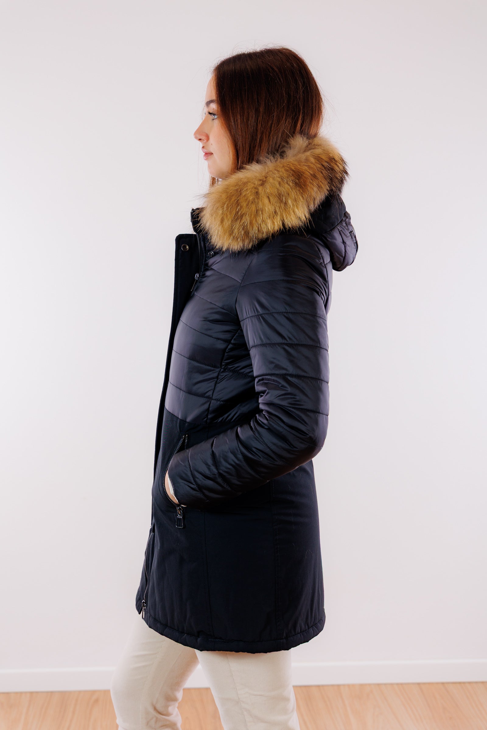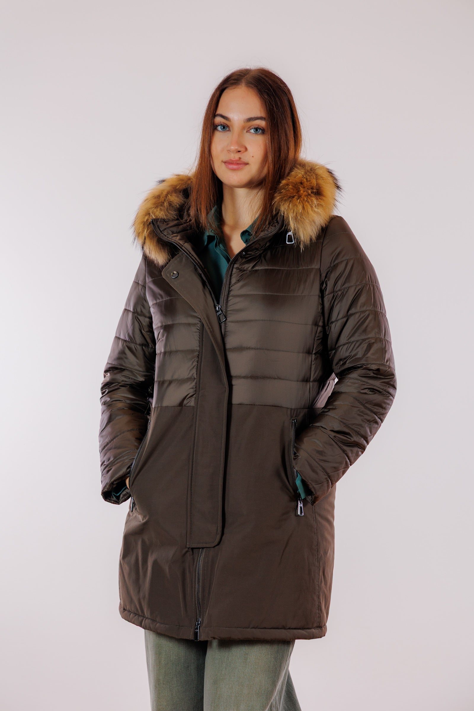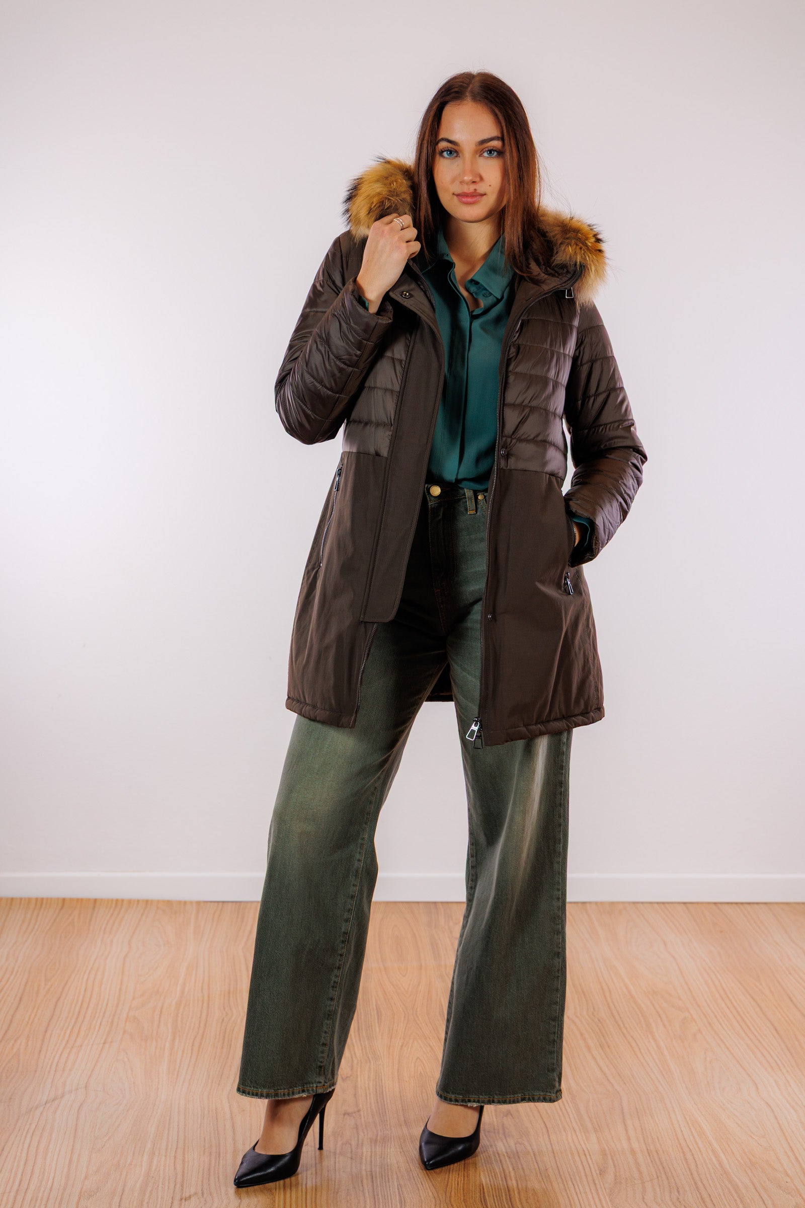 Giaccone in bitessuto, piumino imbottito nella parte superiore e nelle maniche e tessuto liscio nella parte inferiore. Imbottitura in eco-piuma, cappuccio staccabile e bordo in pelliccia staccabile.