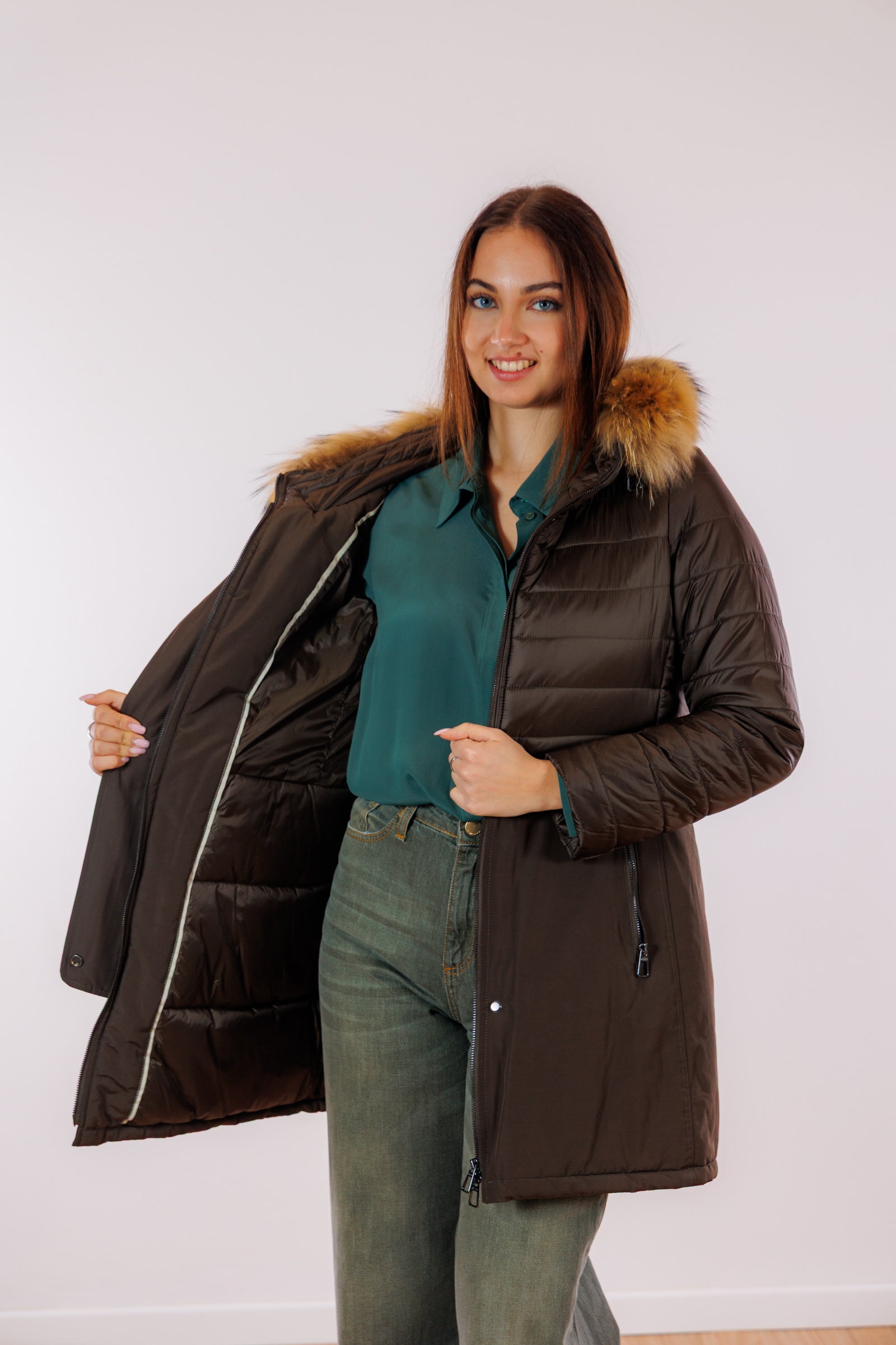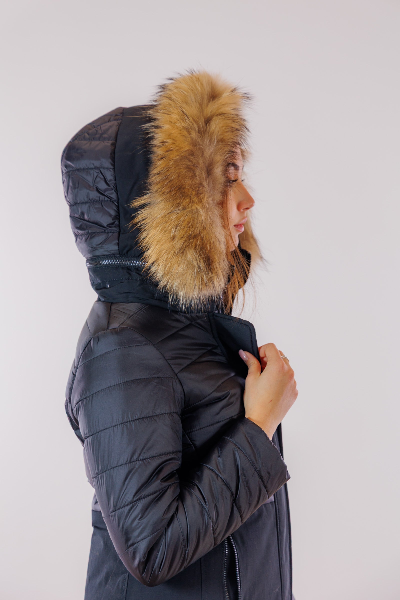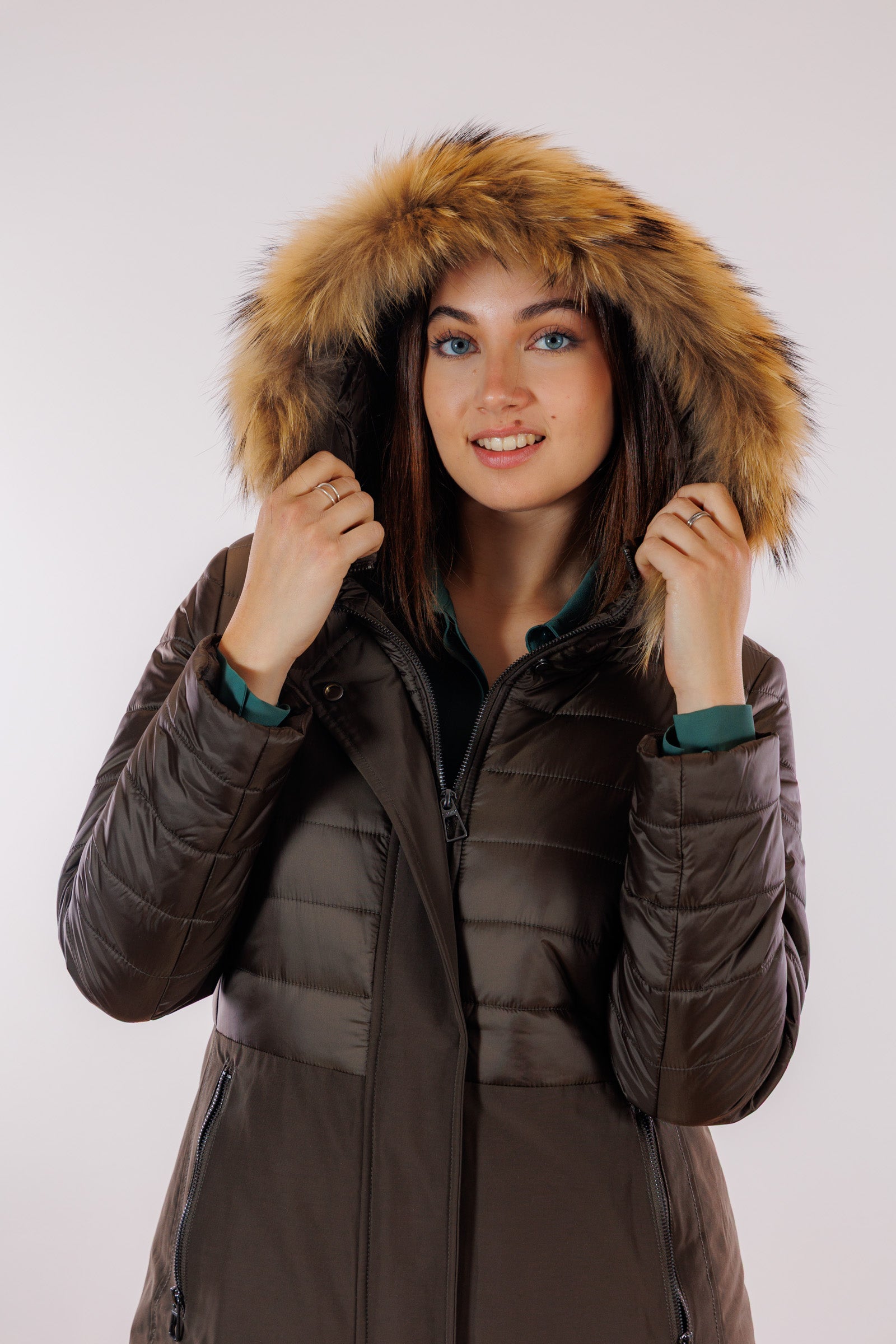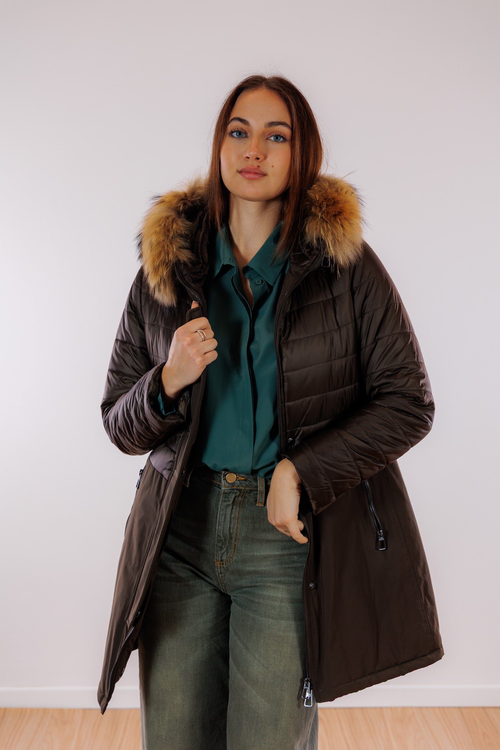 Giaccone in bitessuto, piumino imbottito nella parte superiore e nelle maniche e tessuto liscio nella parte inferiore. Imbottitura in eco-piuma, cappuccio staccabile e bordo in pelliccia staccabile.