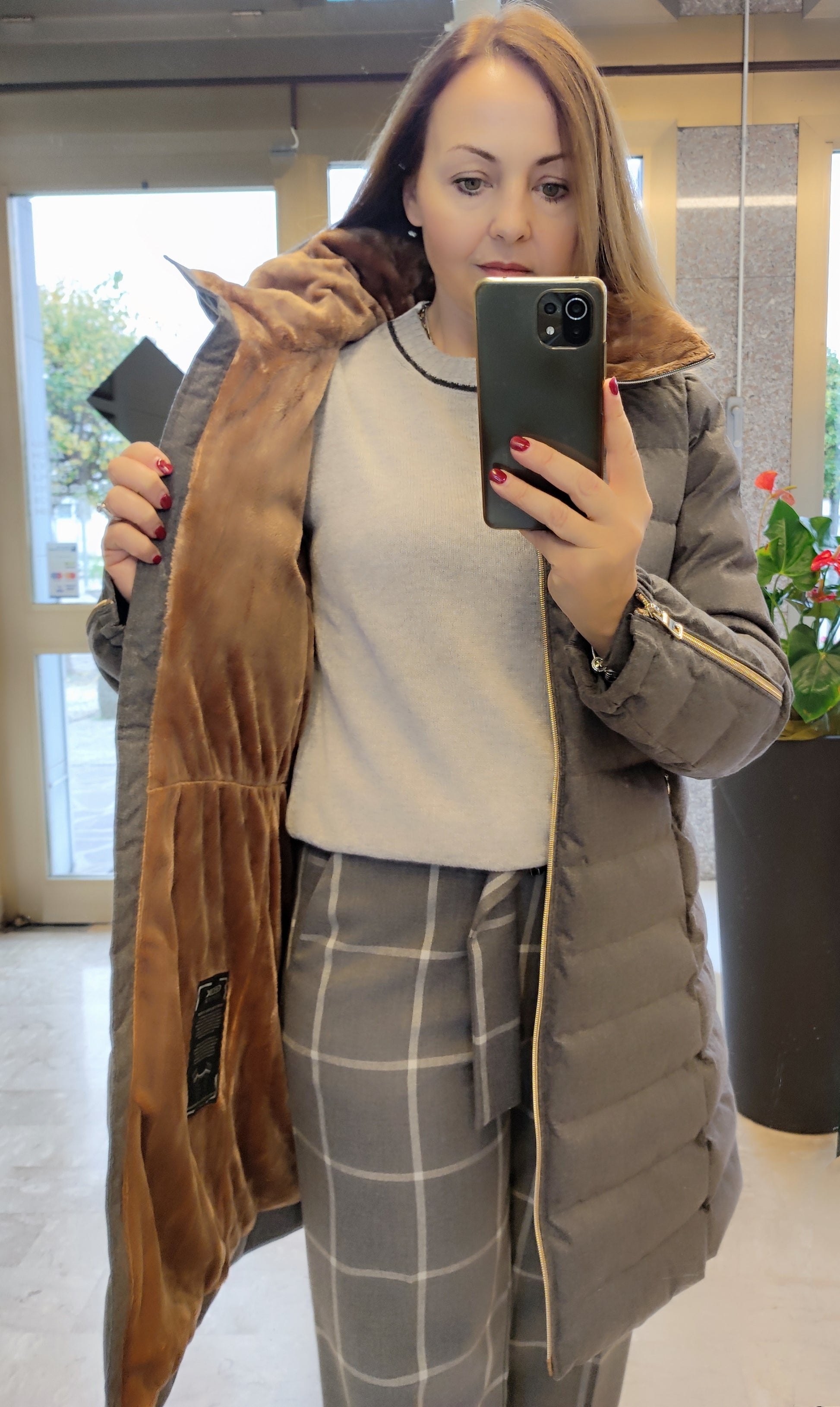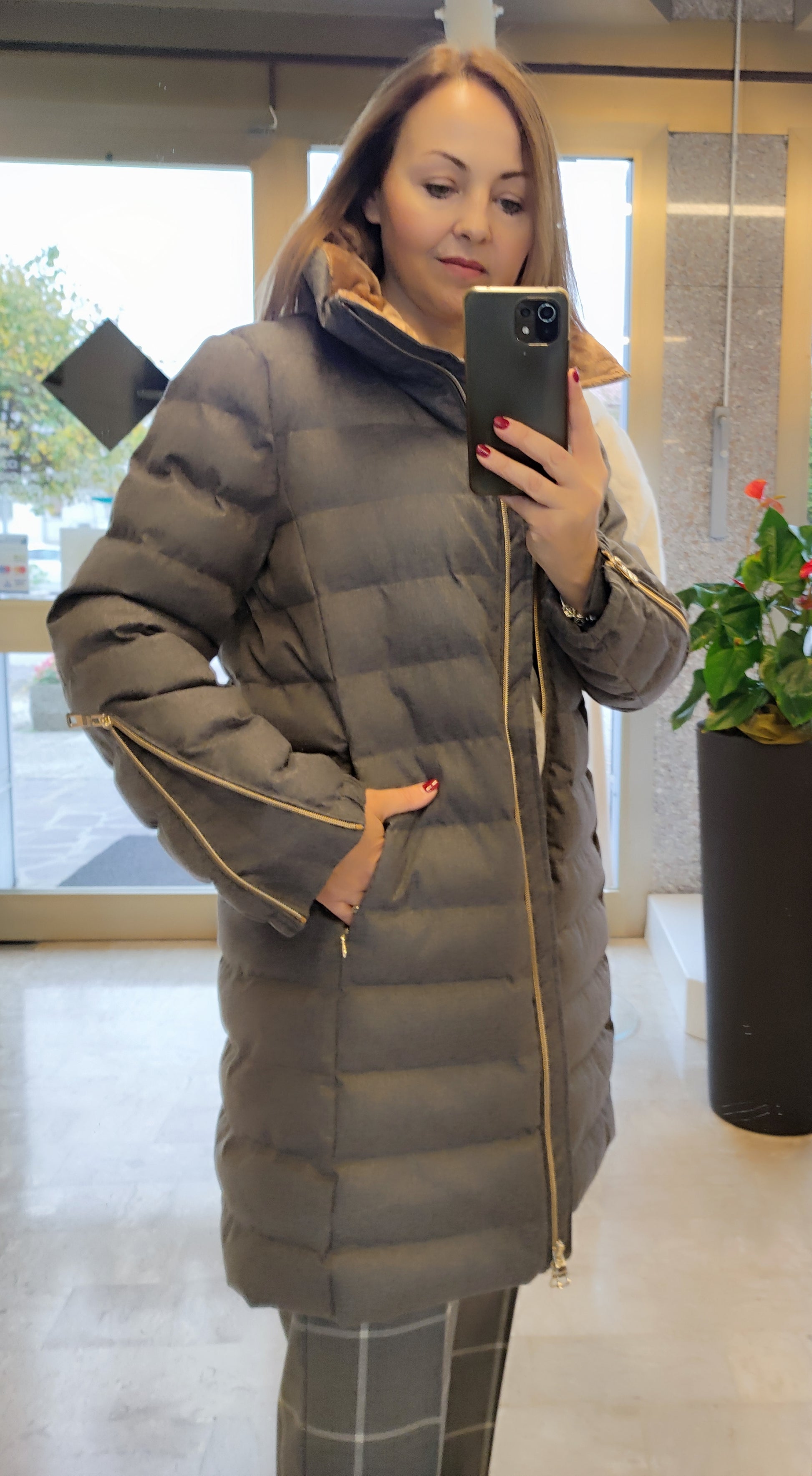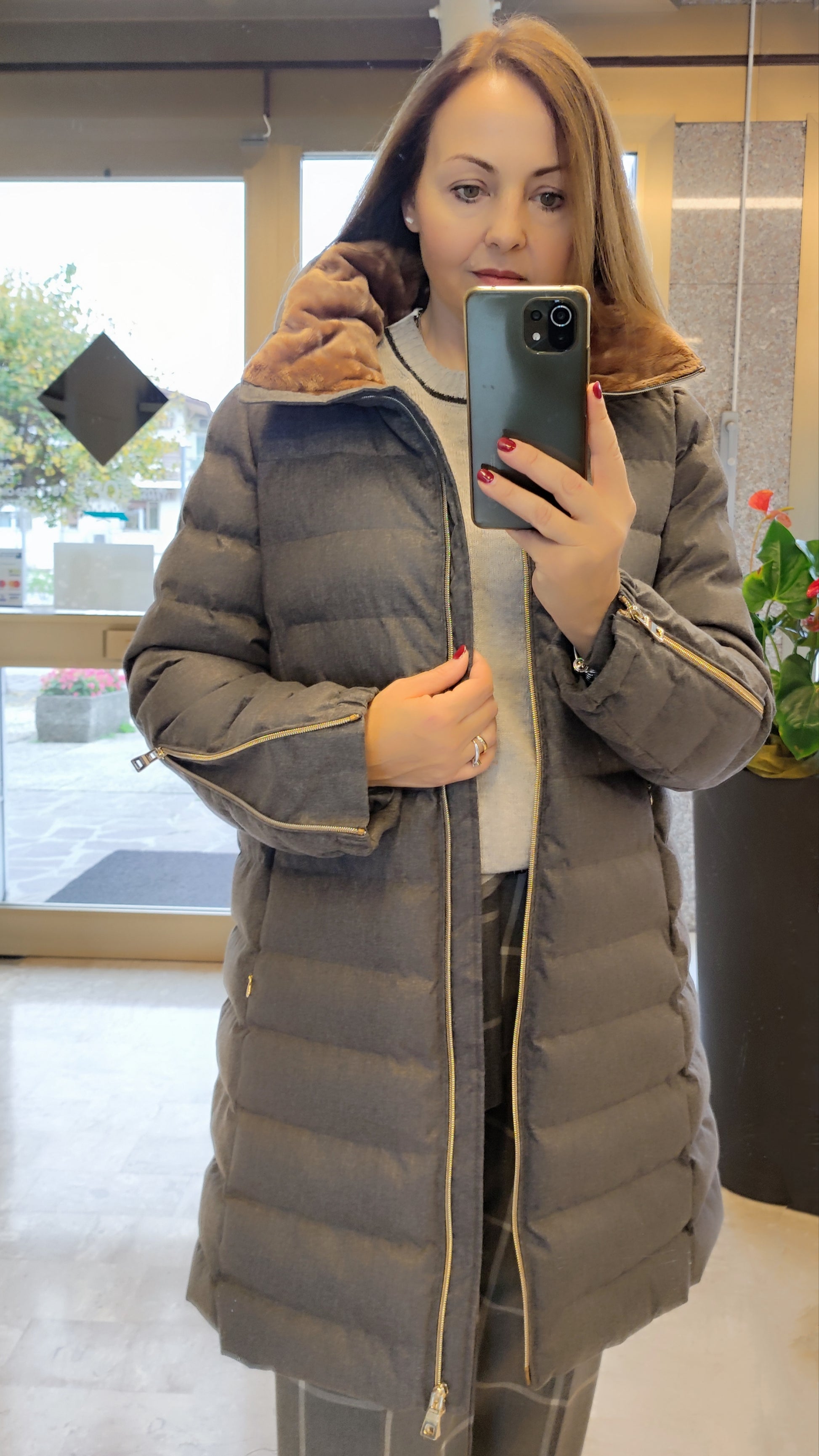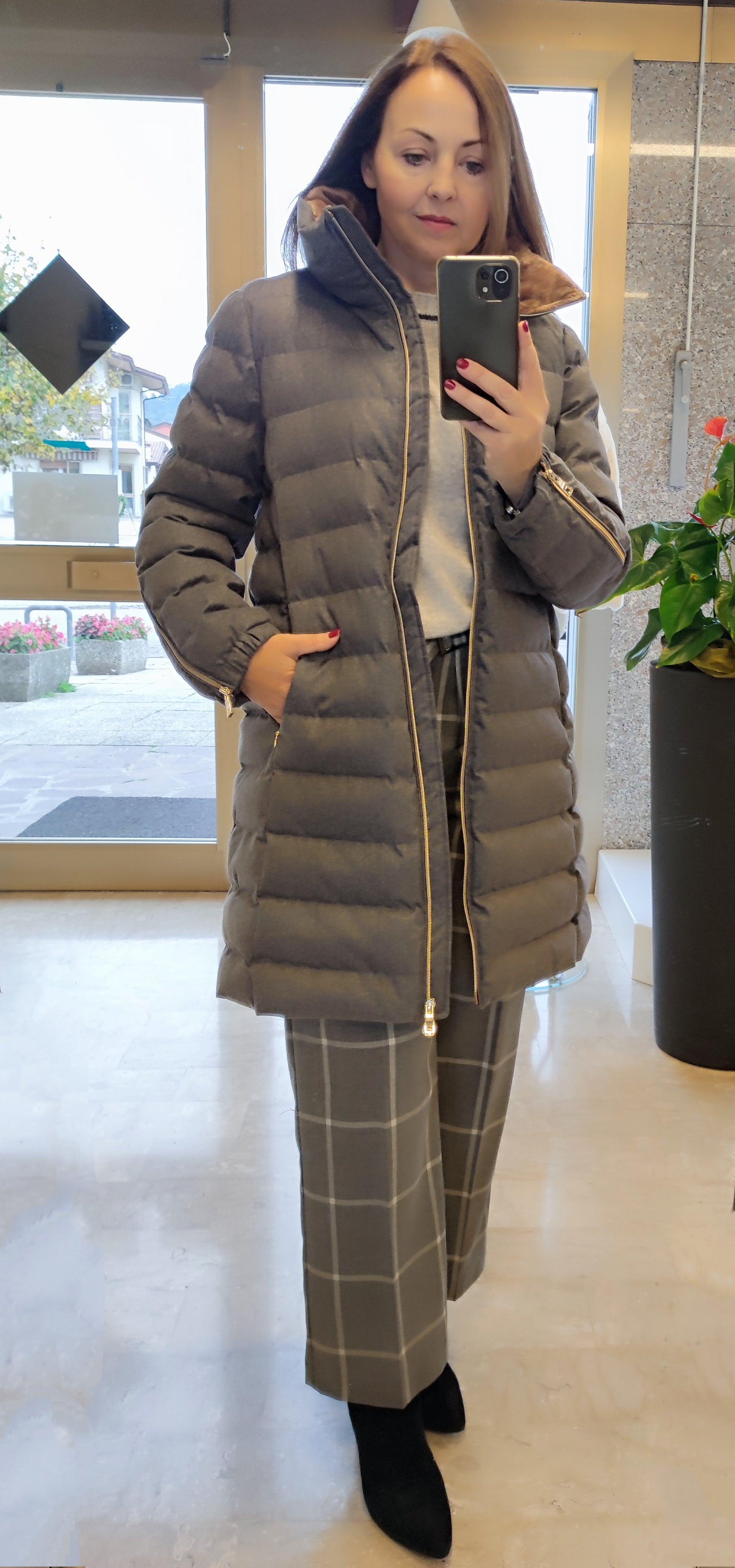 Giaccone lungo, modello ad A con collo a vulcano. Interno traspirante, rivestito in morbido velluto. Chiusura con zip argentata, taschine laterali nascoste e zip lungo le maniche. Indice di isolamento termico: Medio. Vestibilità morbida.