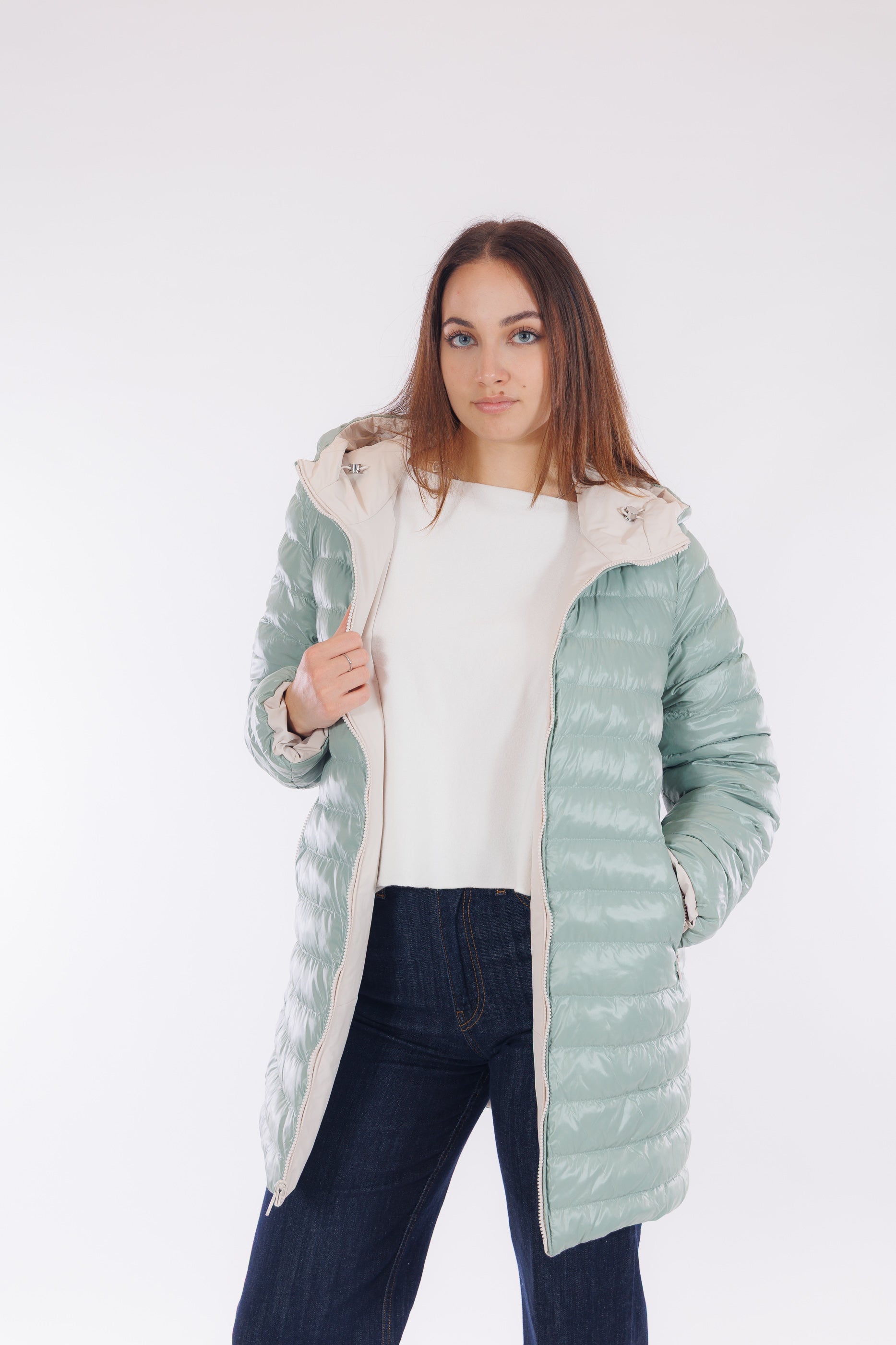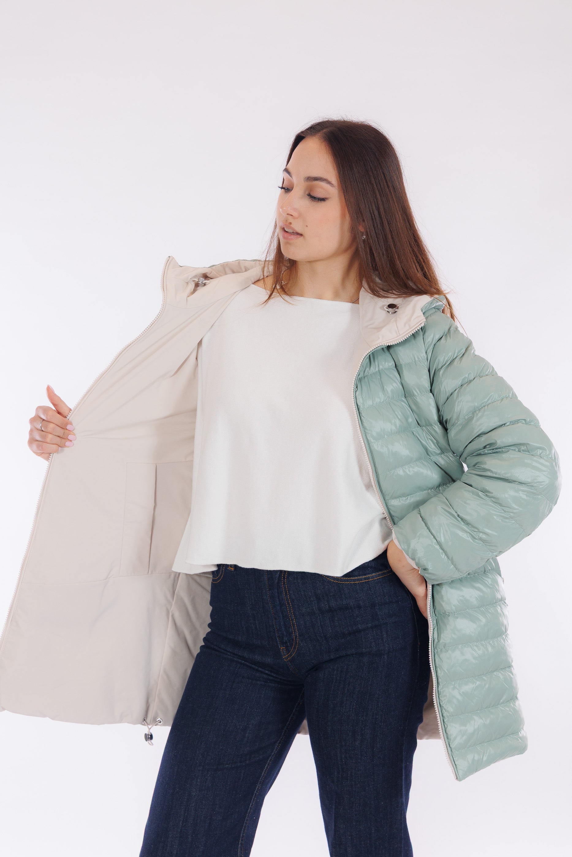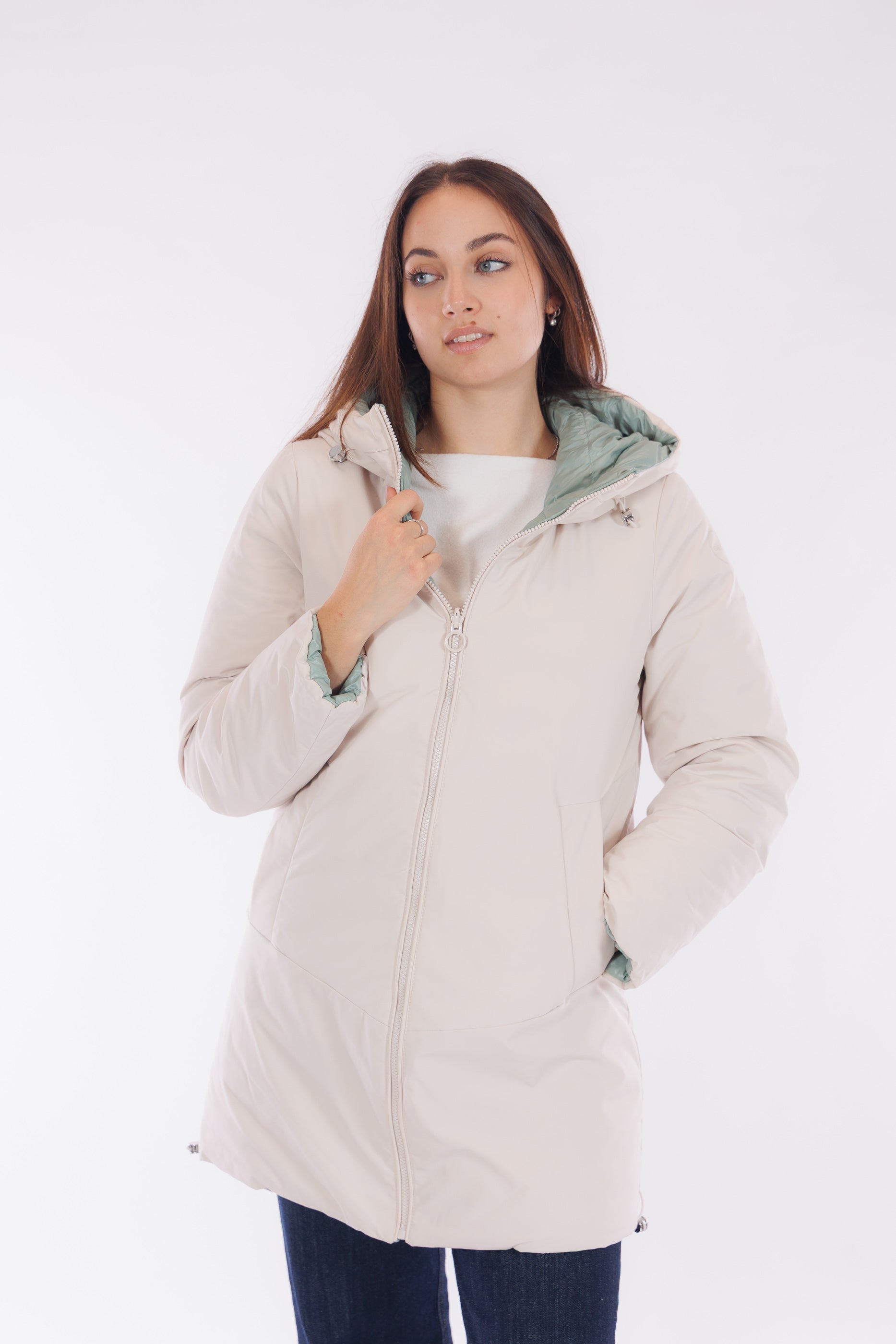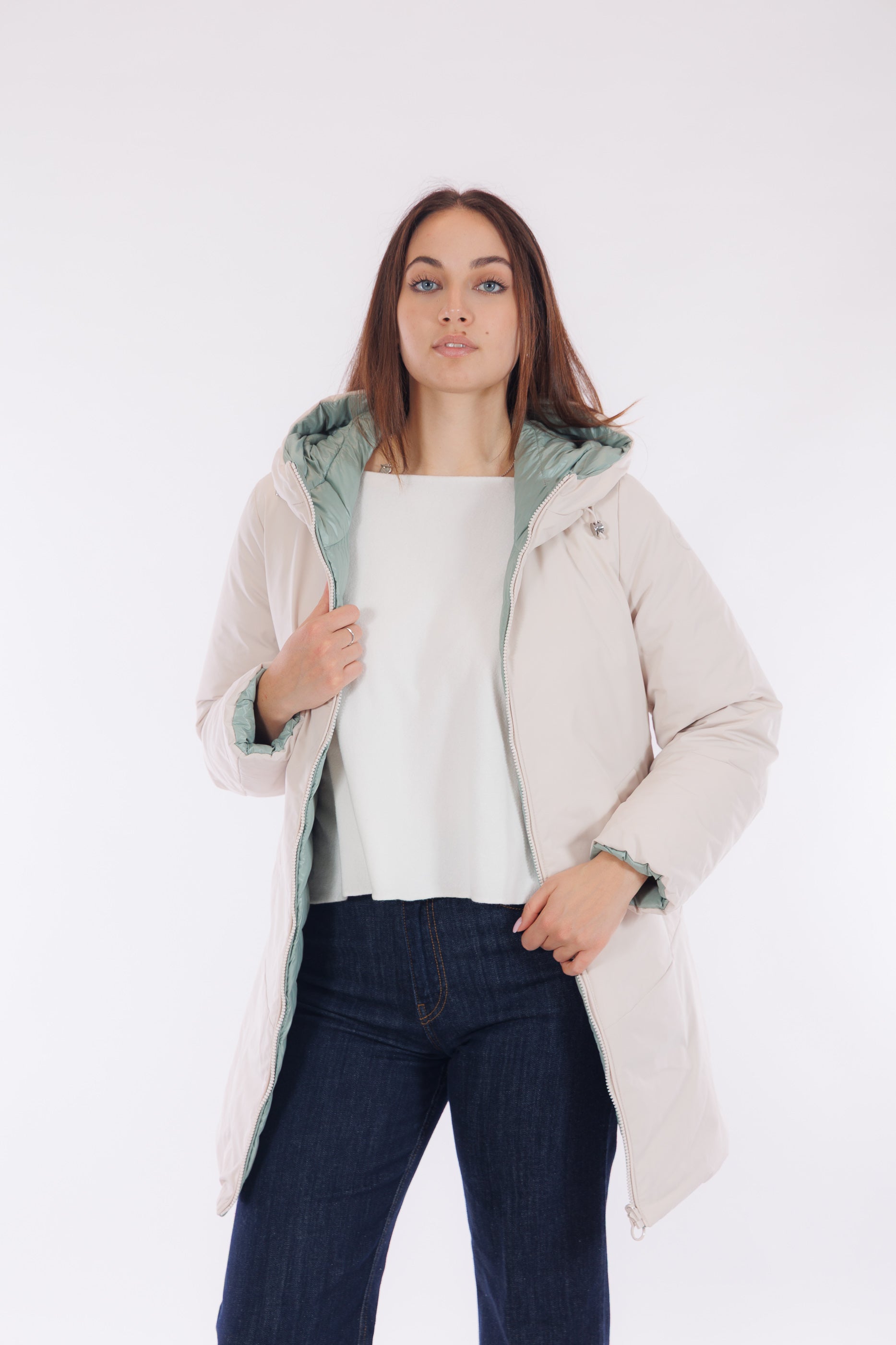 Il giaccone Spherica di Geox è un capo double face versatile e tecnico. Il lato più chiaro, in tessuto tecnico impermeabile e liscio, presenta profonde tasche oblique, cappuccio con coulisse regolabile, che si ripete anche sul fondo del giaccone, per un fit personalizzato e un effetto leggermente bombato. L'altro lato, imbottito in un elegante tono Acqua Marina, offre tasche profonde chiuse da zip per maggiore praticità. Con lunghezza a metà coscia e dotato del "Breathing System" di Geox, che garantisce traspirabilità ottimale mantenendo il corpo asciutto da umidità e sudore. Una scelta funzionale e distintiva per affrontare le condizioni meteo con stile.