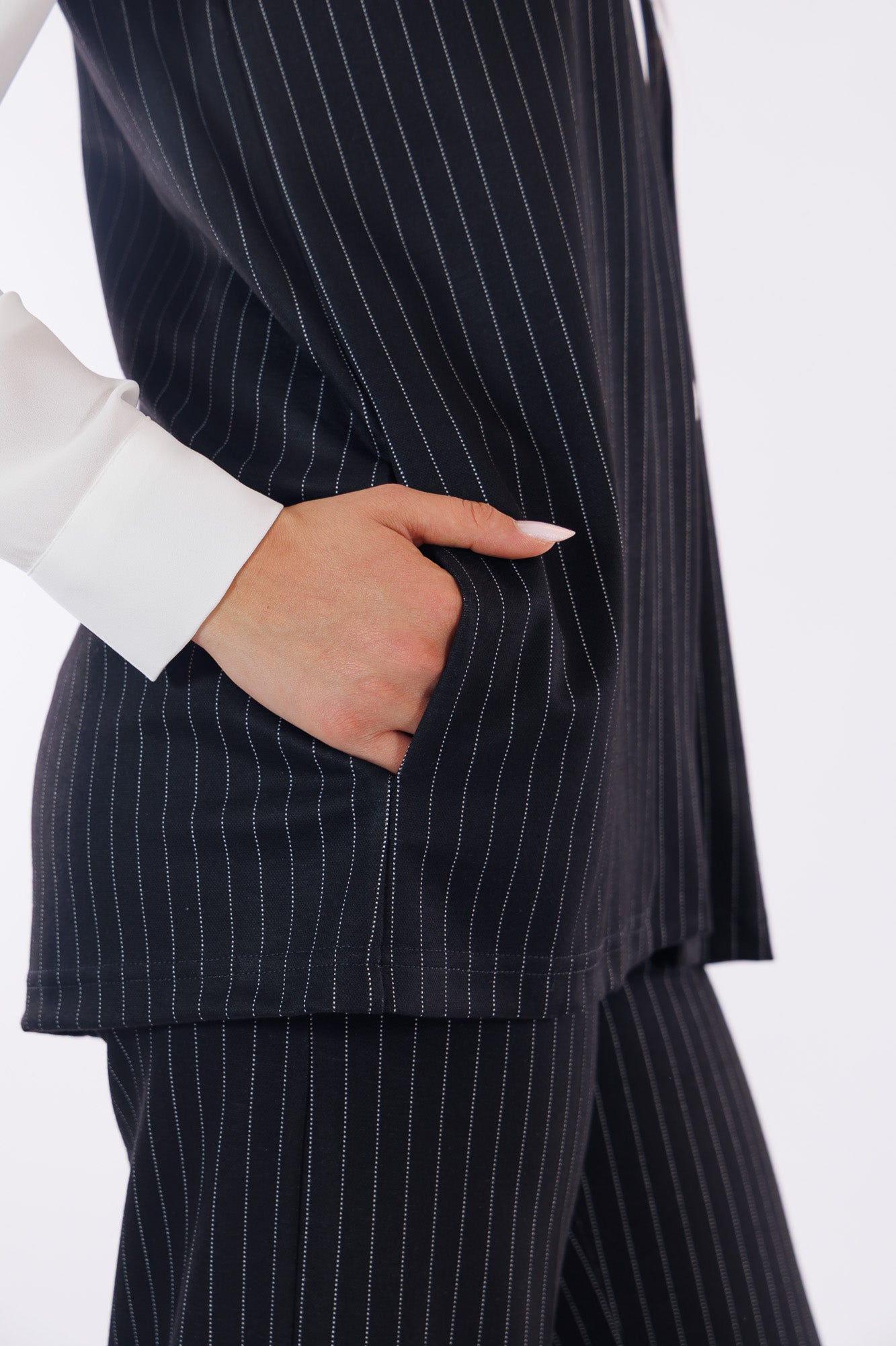 Questo gilet gessato è realizzato senza maniche, né bottoni, per un look elegante e pulito. La sua lunghezza si estende fino a coprire i fianchi, offrendo una copertura perfetta e una silhouette lineare. Le tasche laterali aggiungono funzionalità senza interrompere il design minimalista.