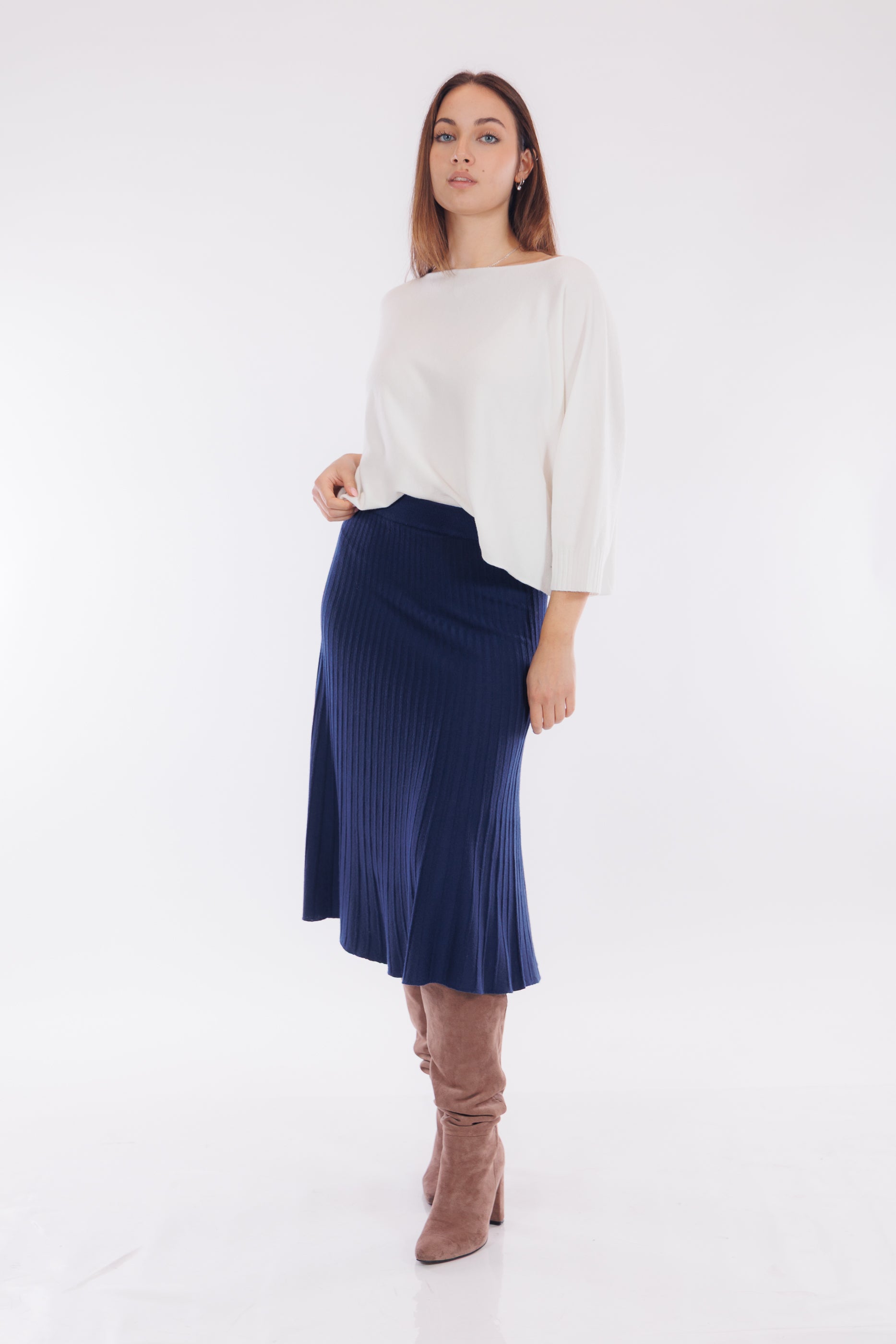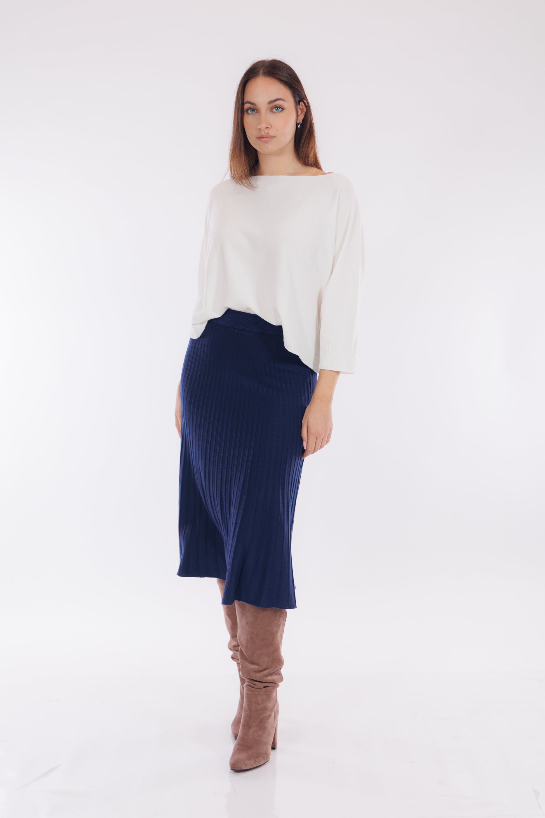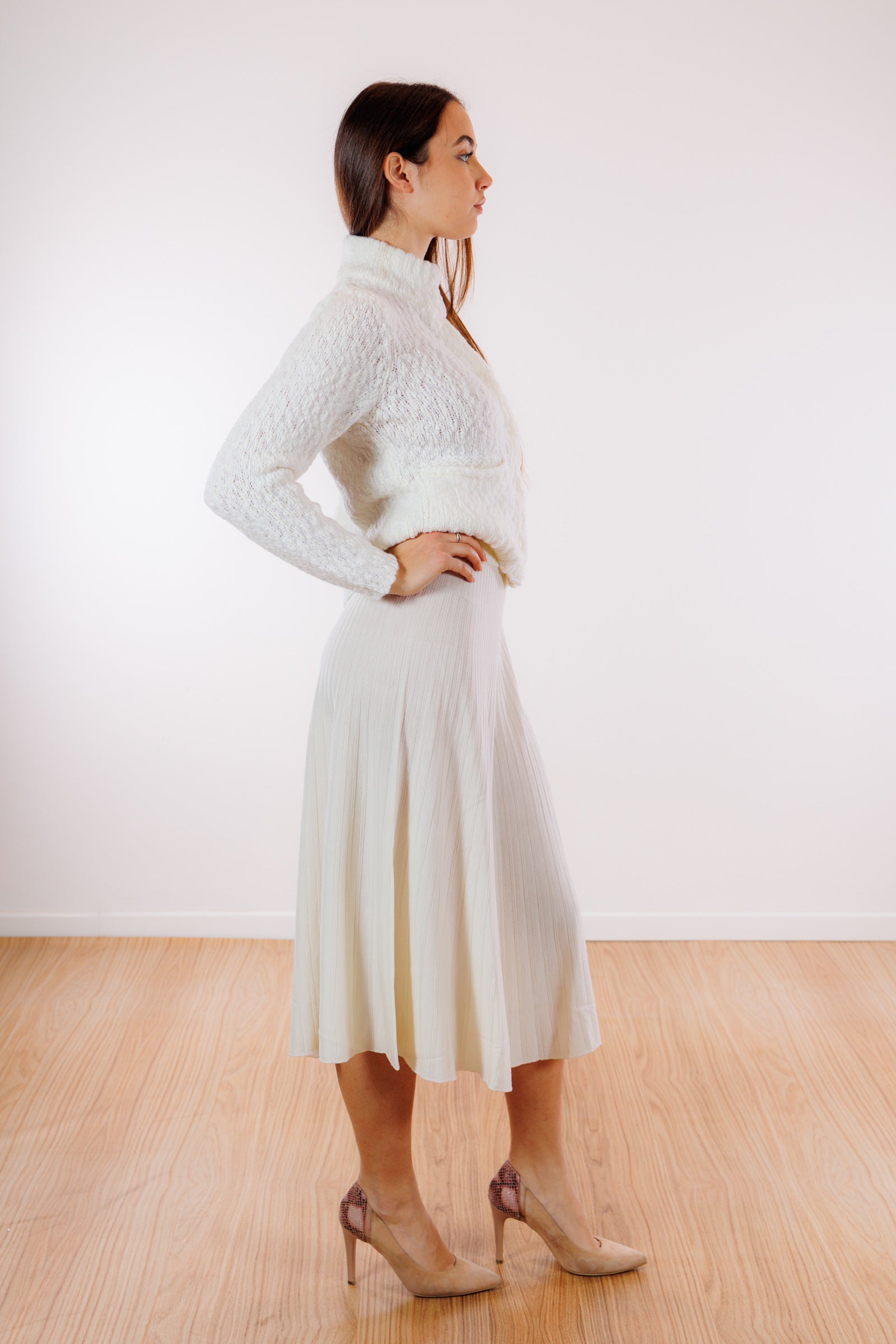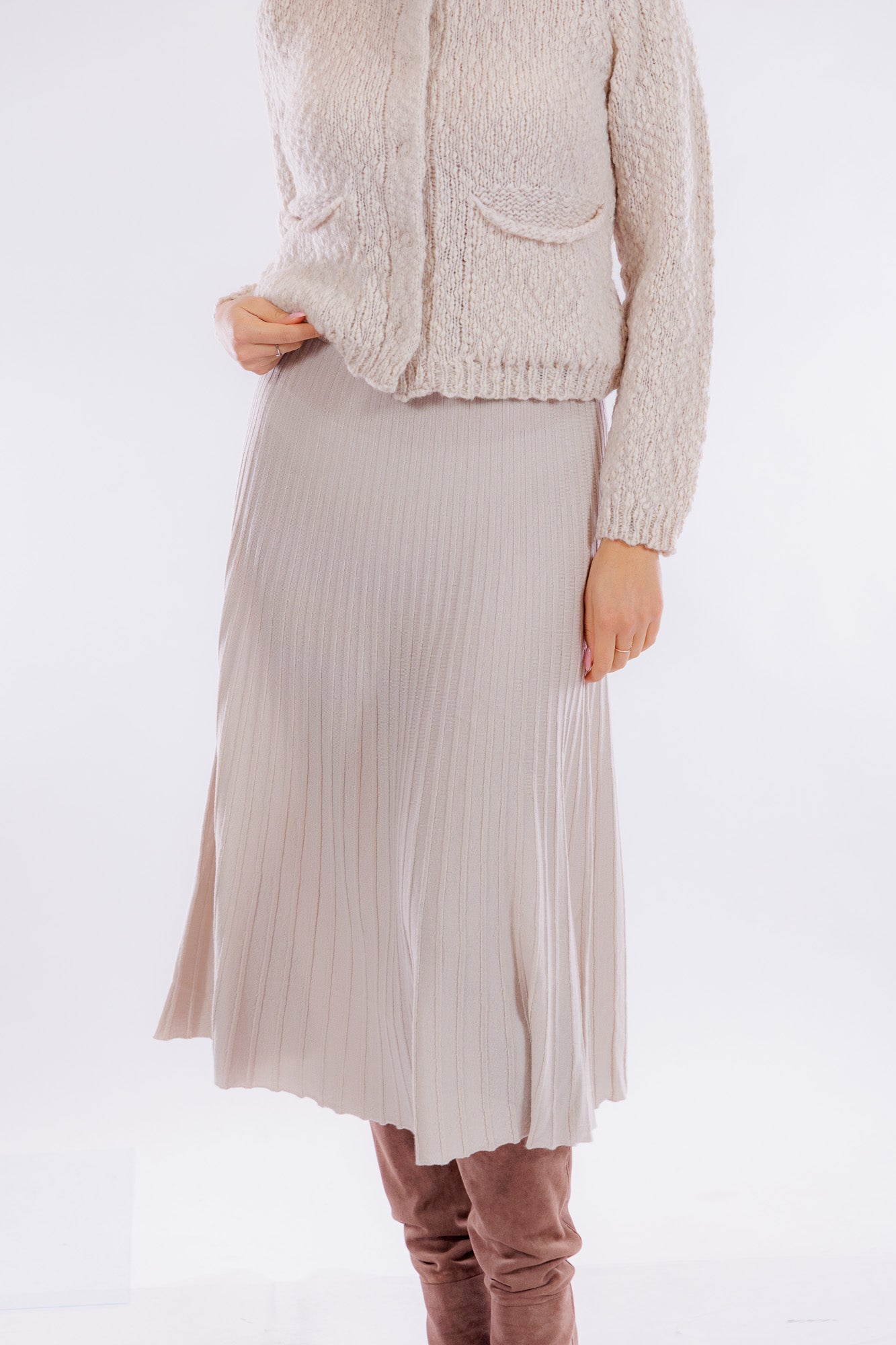 Realizzata in morbida maglia plissé e completa con un cinturino elastico in vita, questa gonna midi di lana merinos extrafine è la scelta perfetta per le fredde giornate invernali. Con la sua lunghezza a metà polpaccio, ti terrà al caldo e alla moda in ogni occasione.