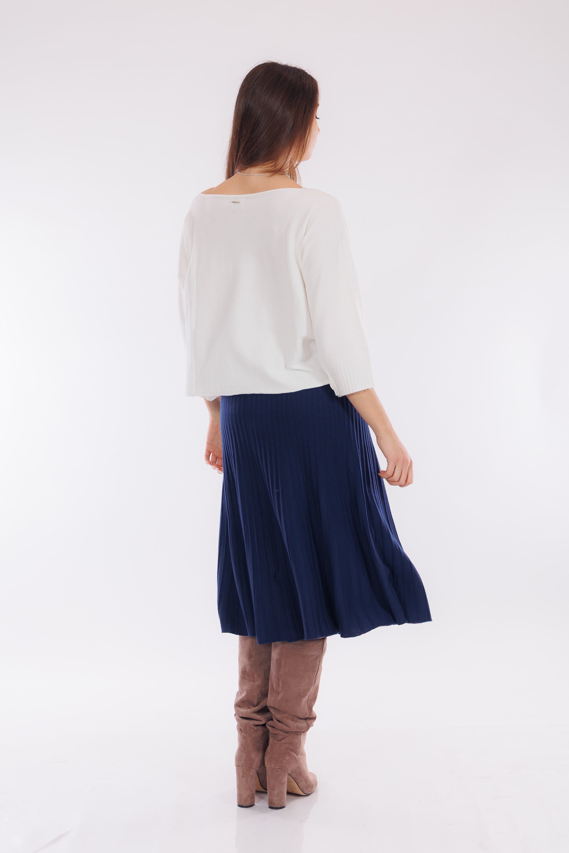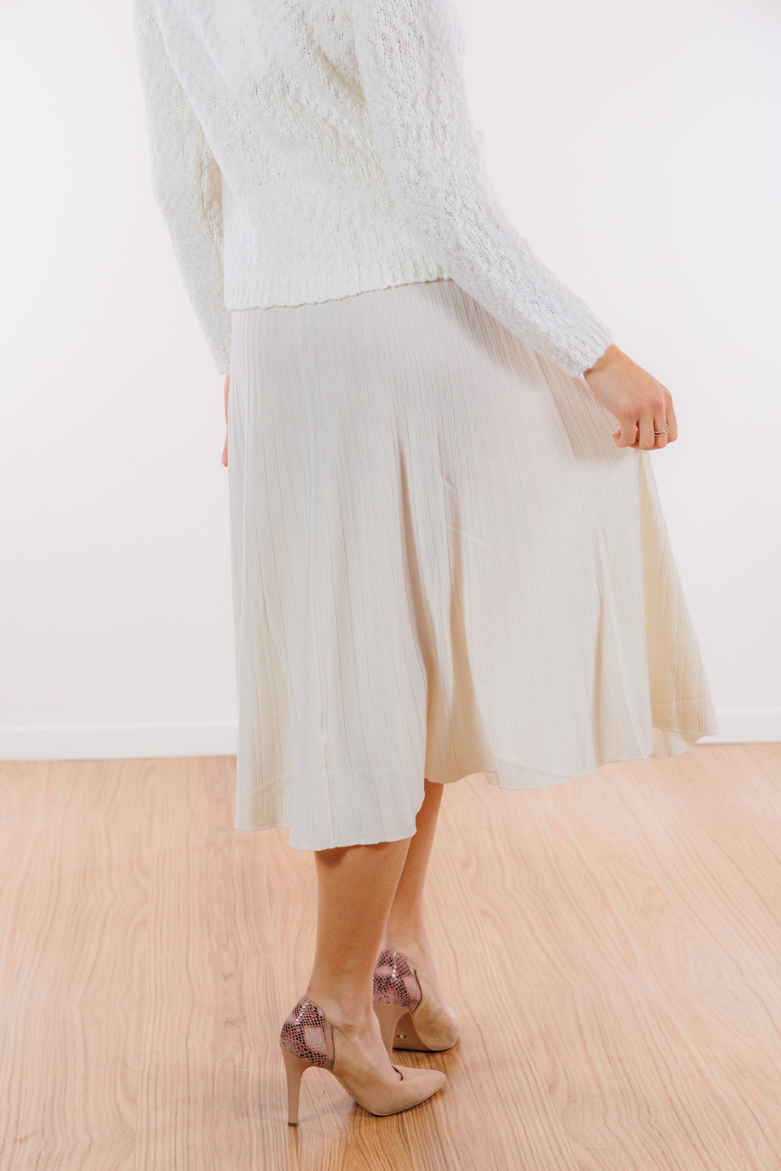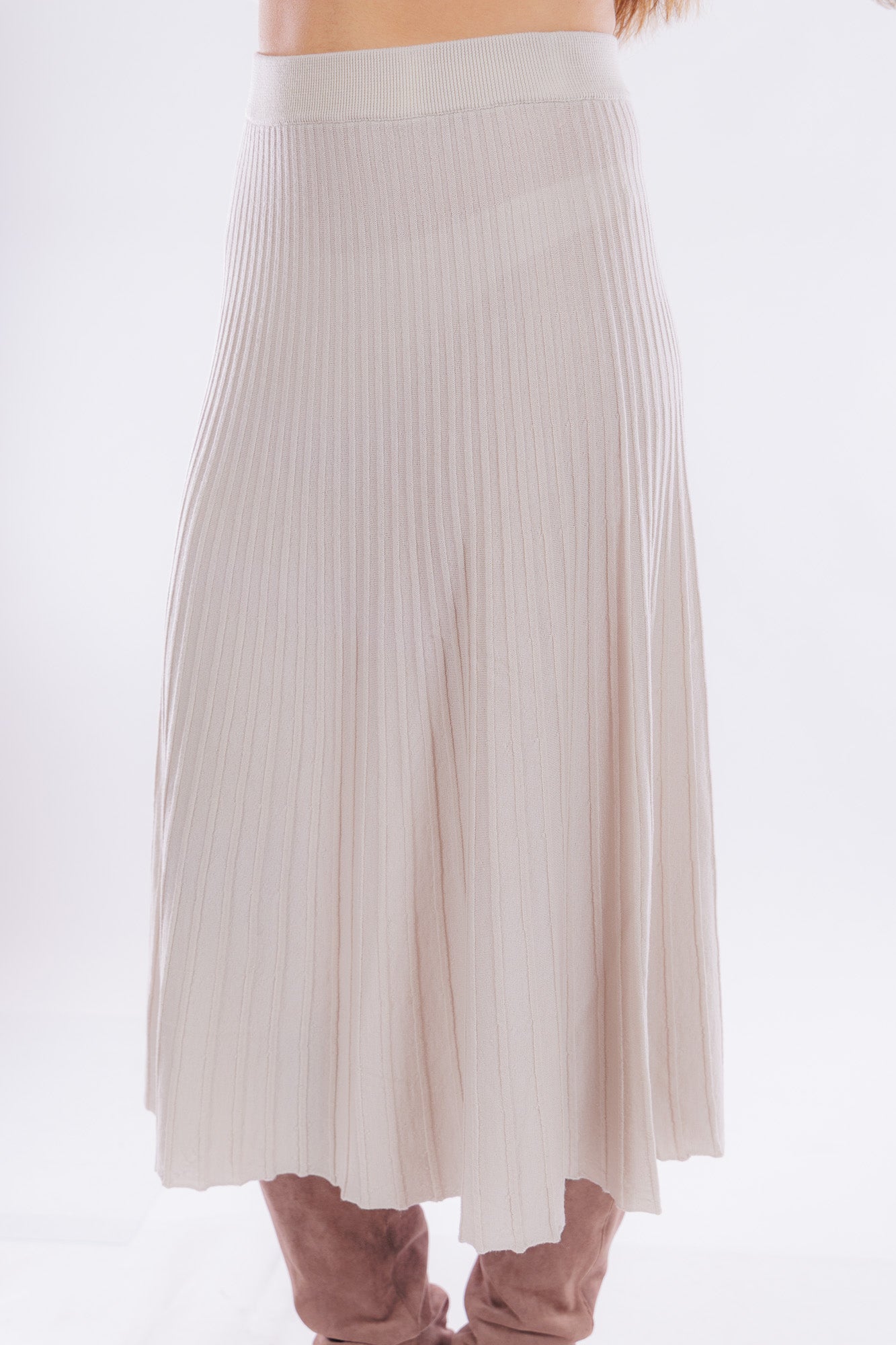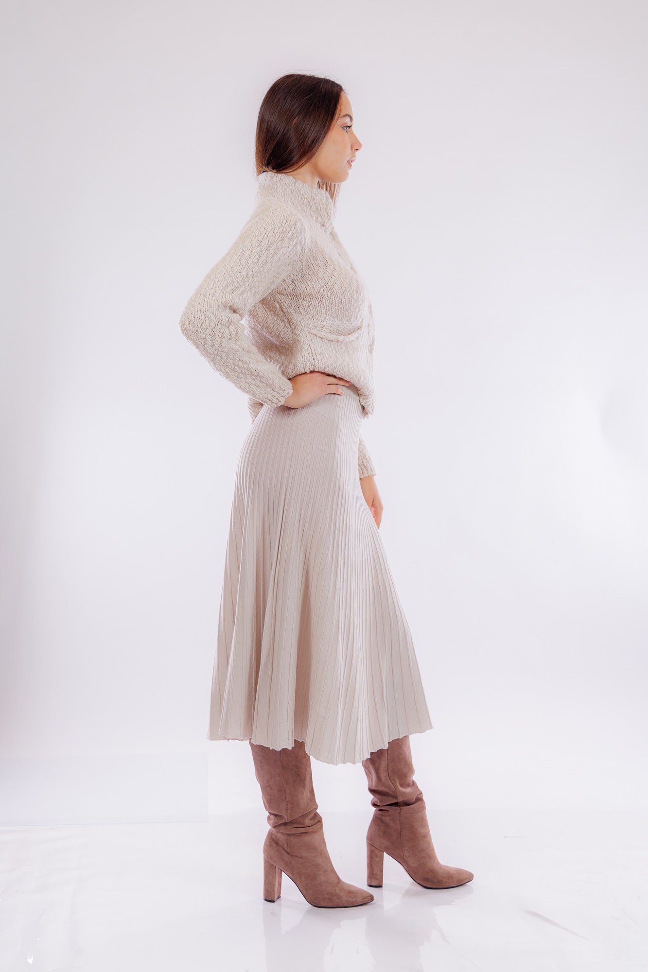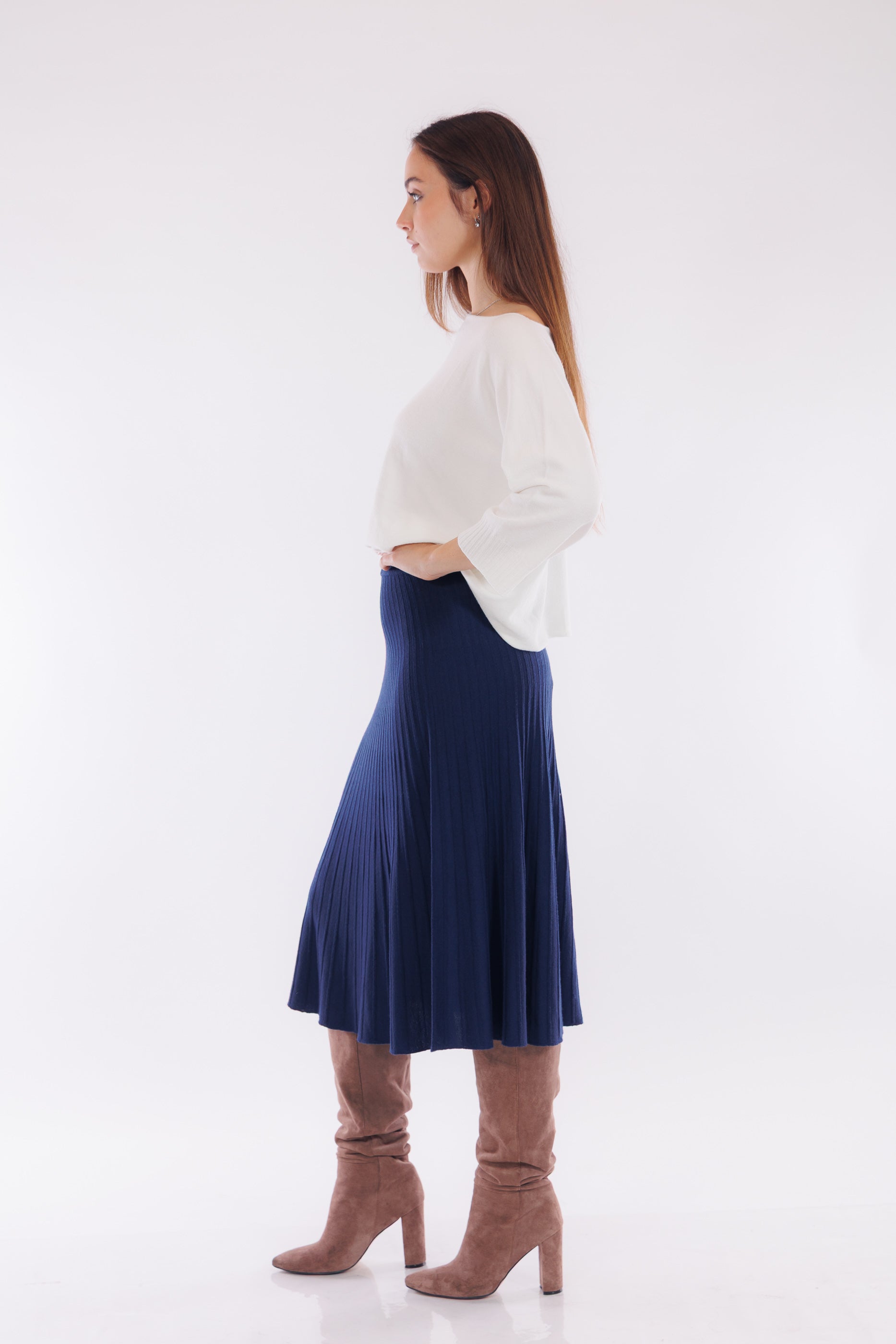 Realizzata in morbida maglia plissé e completa con un cinturino elastico in vita, questa gonna midi di lana merinos extrafine è la scelta perfetta per le fredde giornate invernali. Con la sua lunghezza a metà polpaccio, ti terrà al caldo e alla moda in ogni occasione.