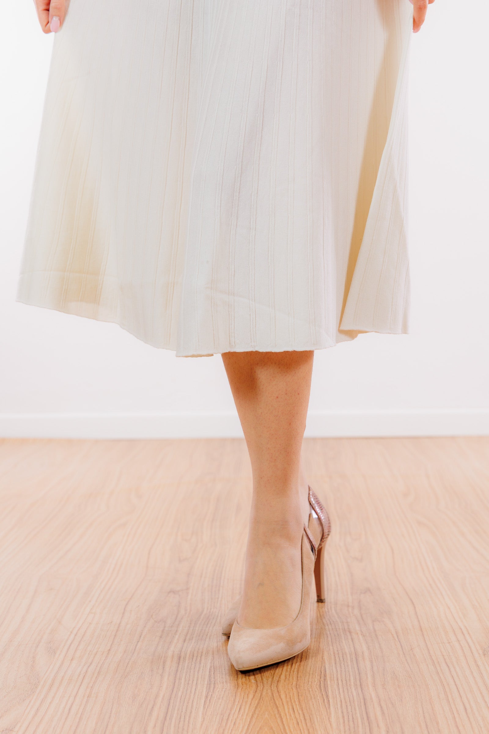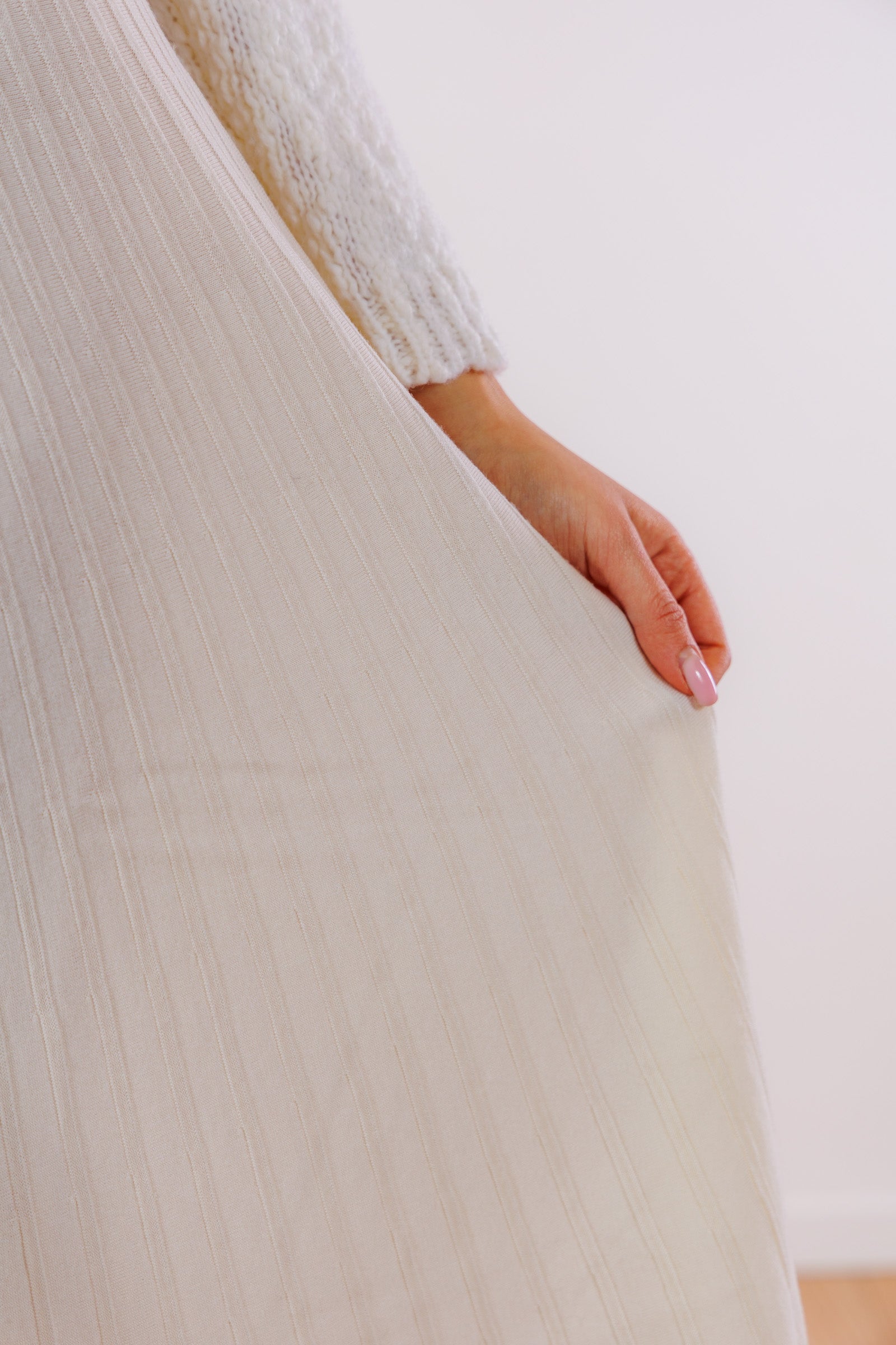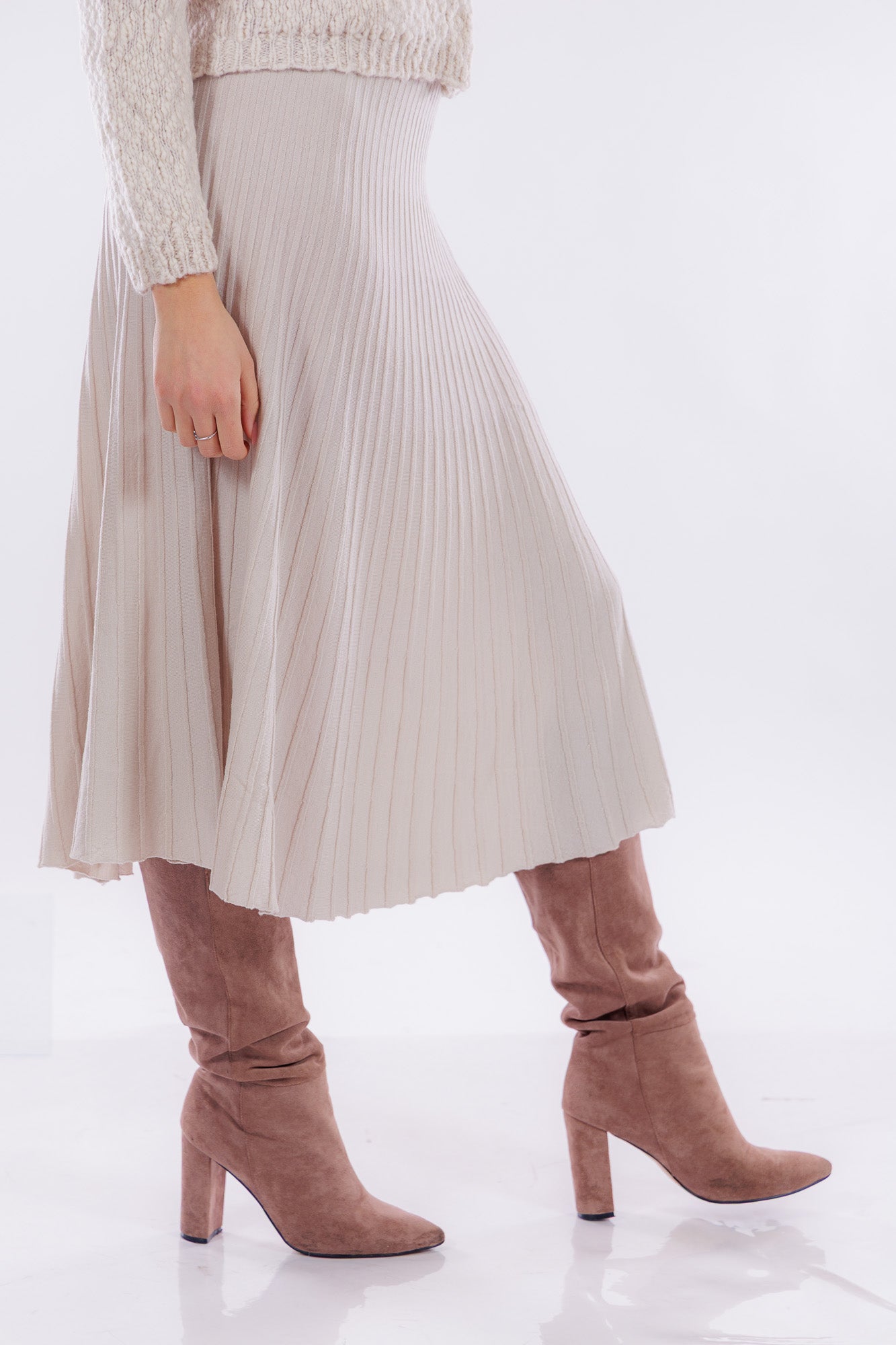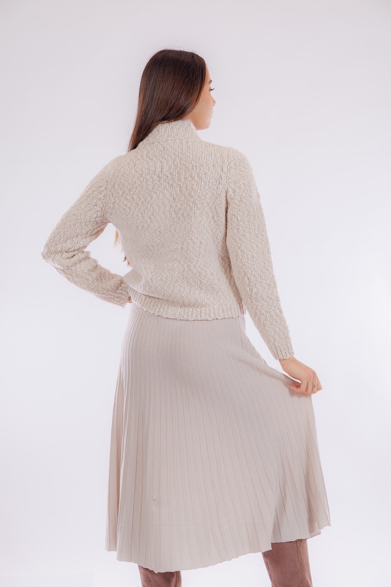 Realizzata in morbida maglia plissé e completa con un cinturino elastico in vita, questa gonna midi di lana merinos extrafine è la scelta perfetta per le fredde giornate invernali. Con la sua lunghezza a metà polpaccio, ti terrà al caldo e alla moda in ogni occasione.