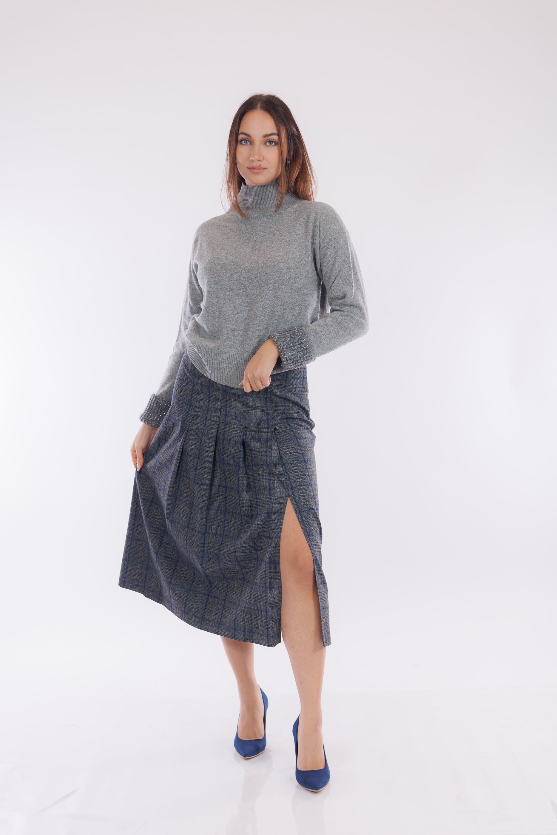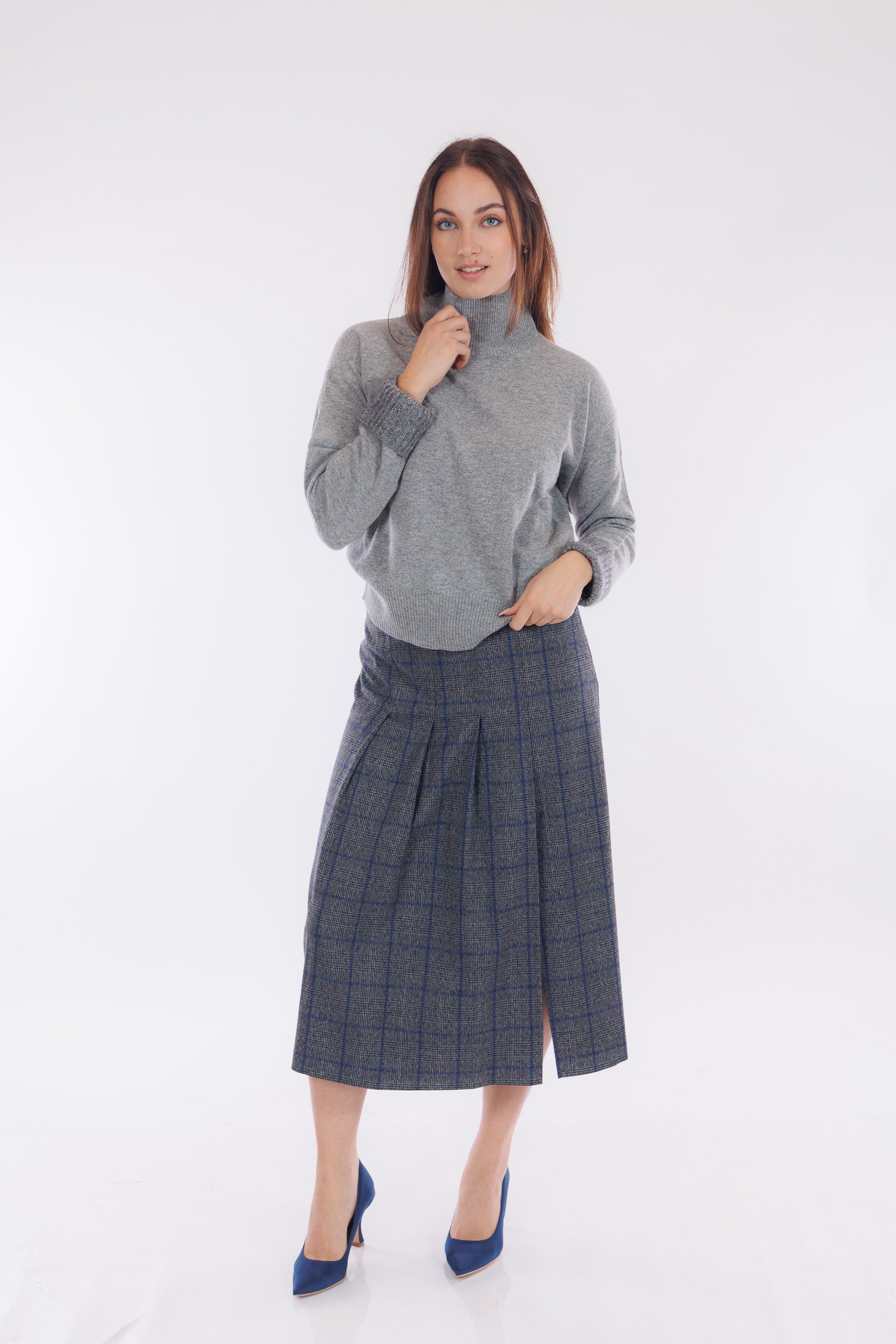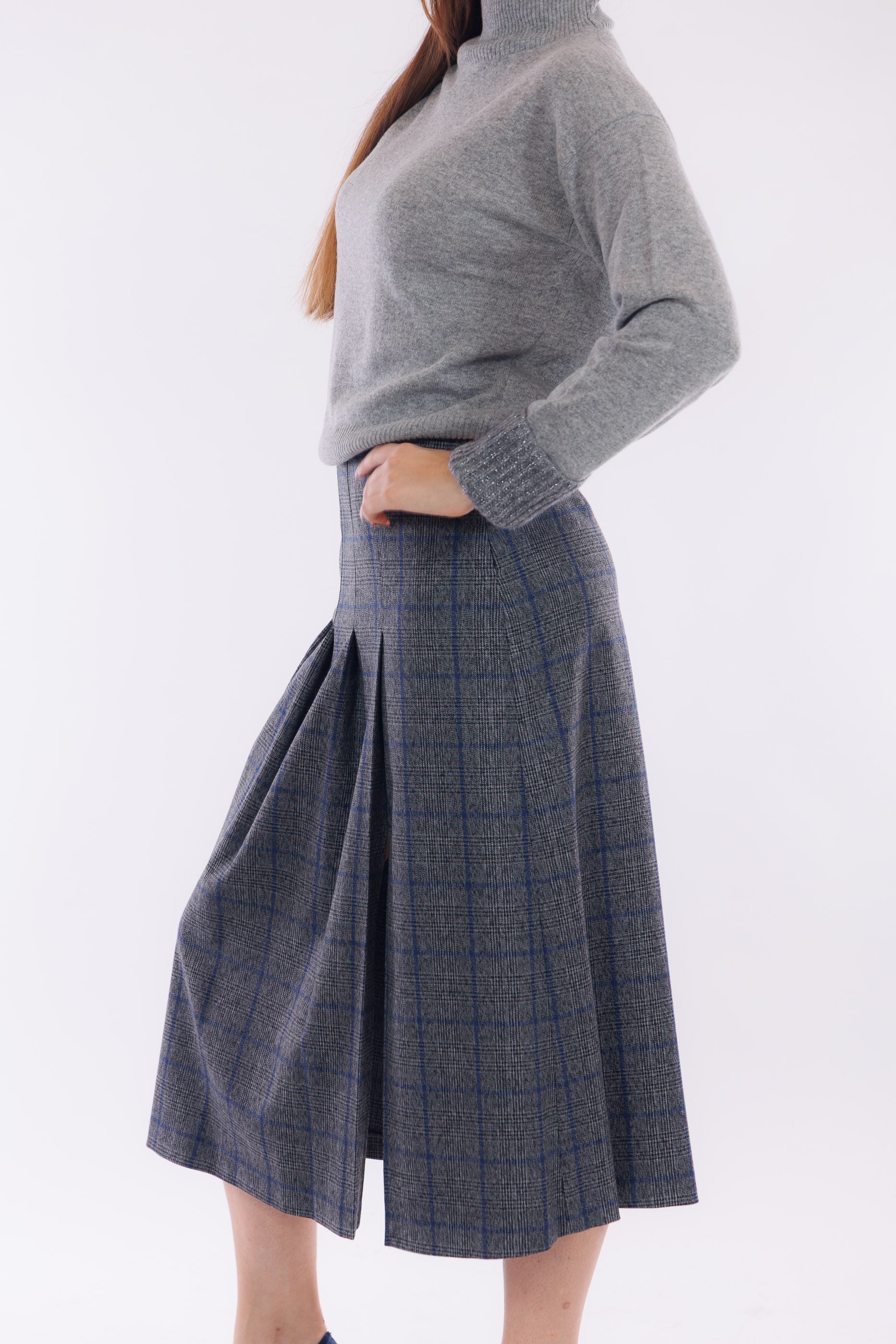 Questa gonna in tessuto principe di Galles combina eleganza e funzionalità con il suo design a pieghe frontali e uno spacco laterale che facilita il movimento. La zip sul fianco garantisce una chiusura perfetta, mentre la lunghezza a metà polpaccio e la vita alta valorizzano la silhouette con raffinata modernità. Ideale per un look professionale e sofisticato.