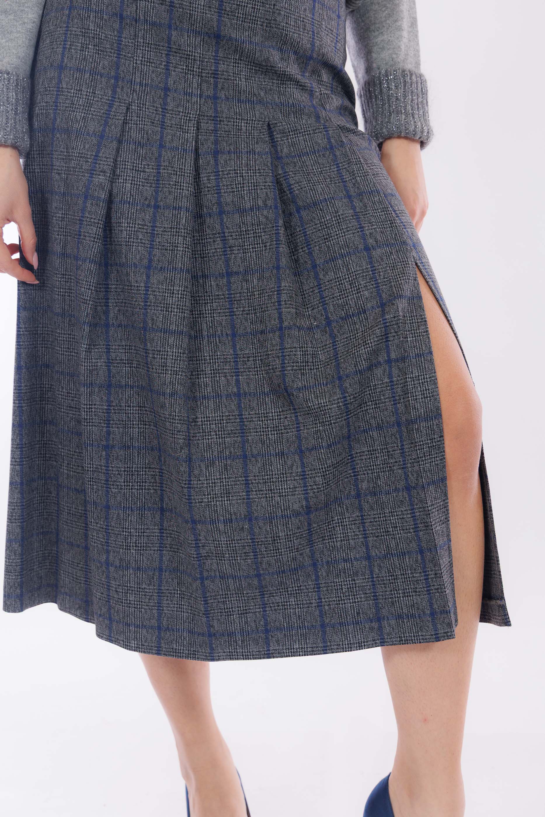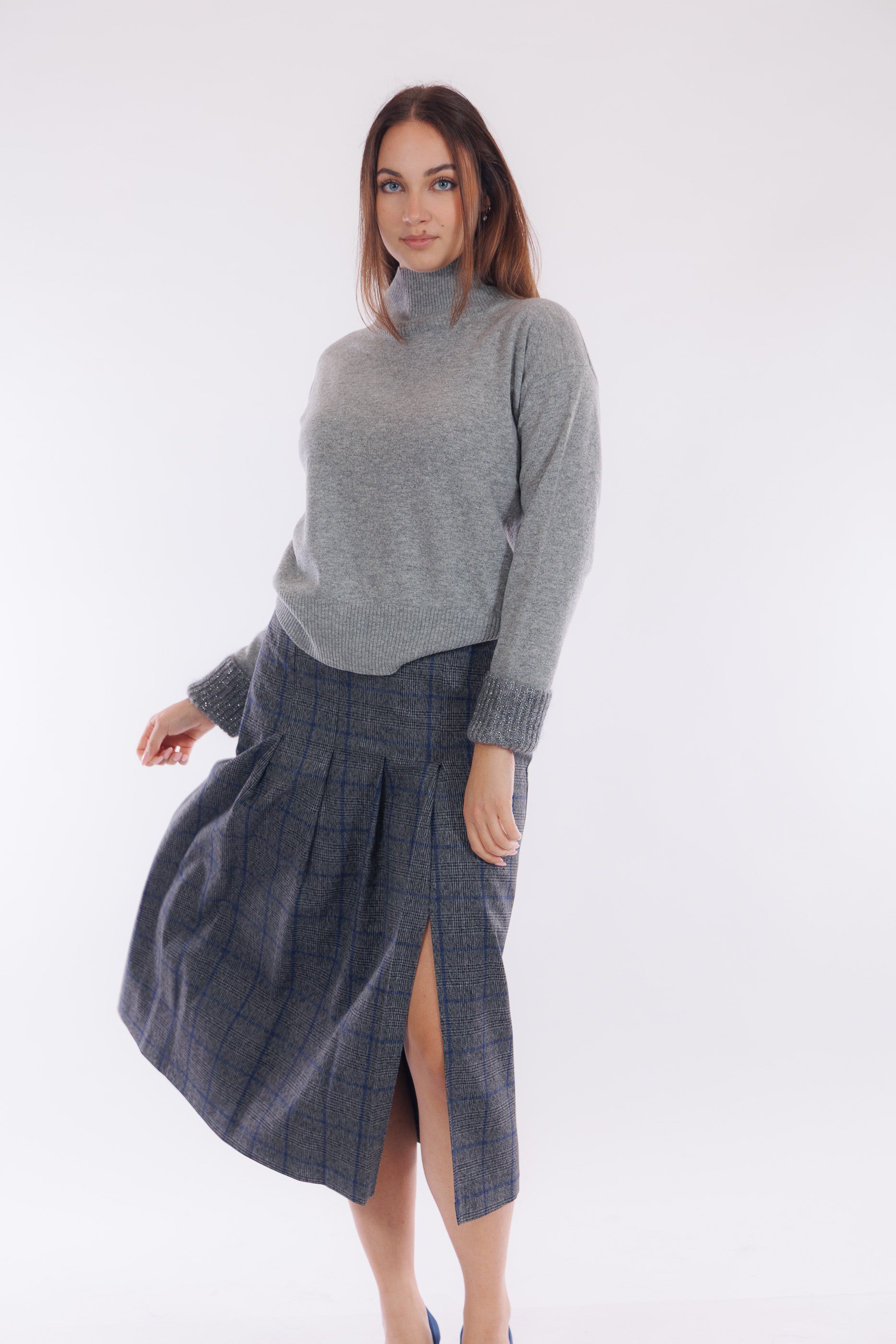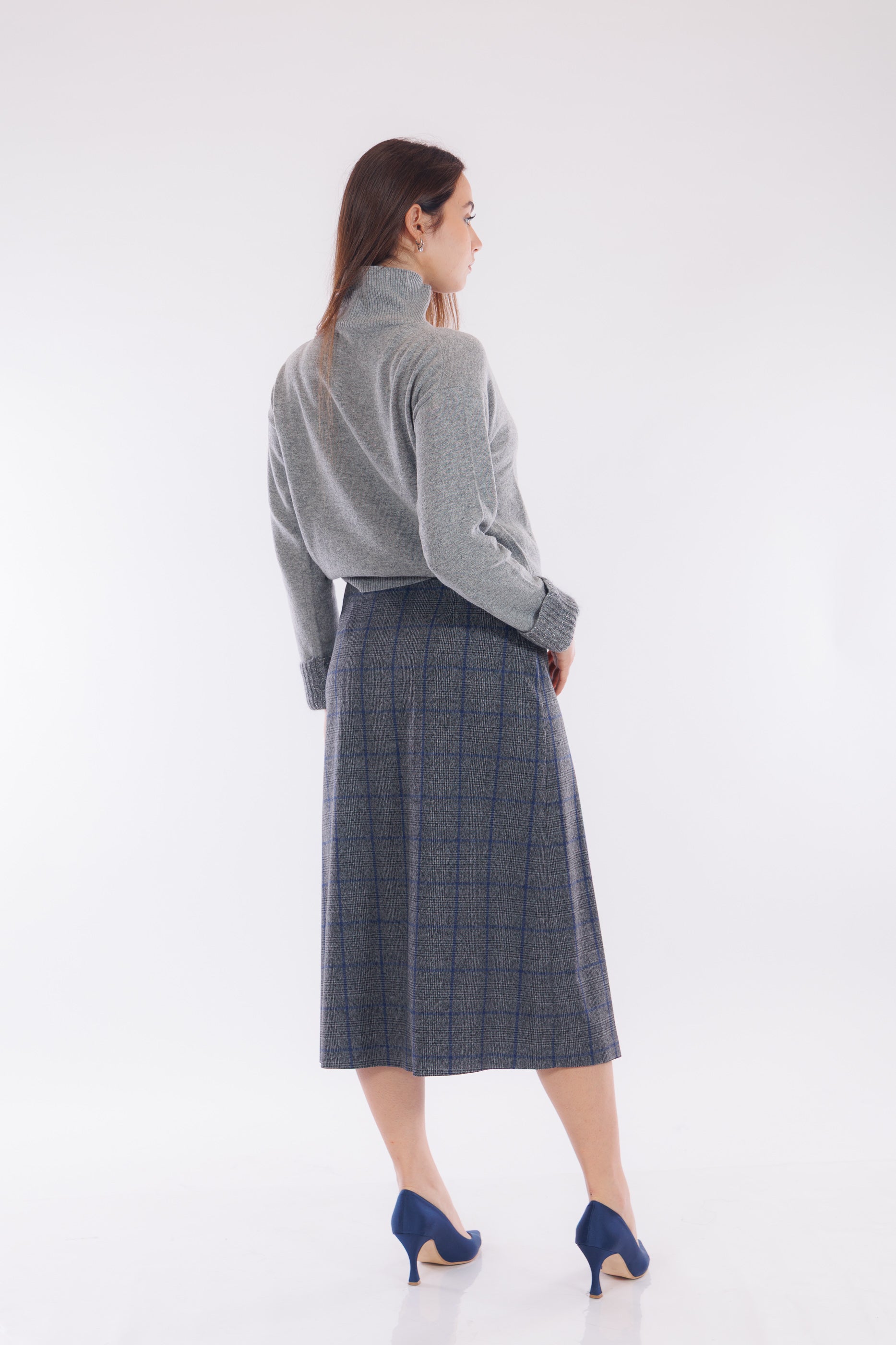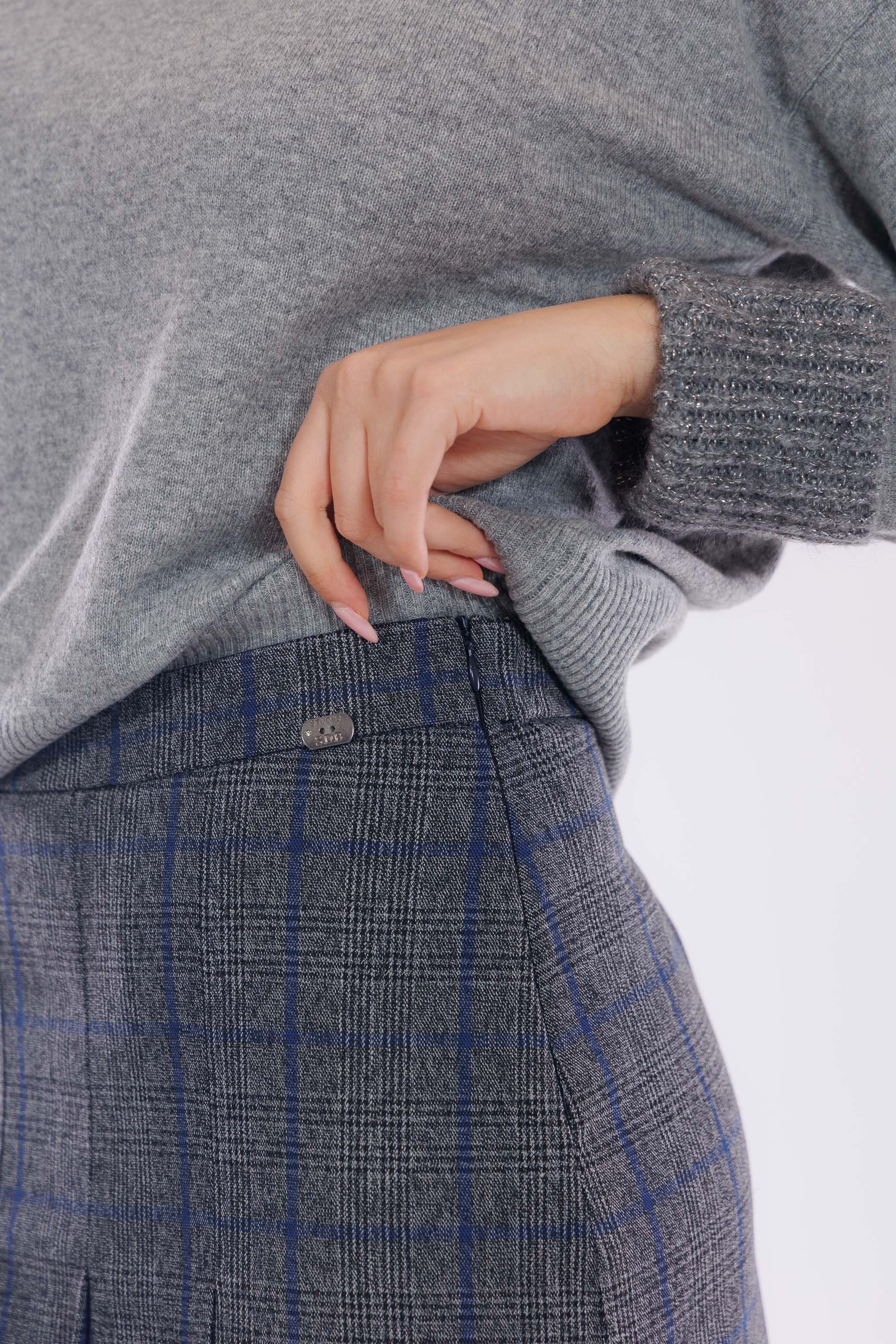 Questa gonna in tessuto principe di Galles combina eleganza e funzionalità con il suo design a pieghe frontali e uno spacco laterale che facilita il movimento. La zip sul fianco garantisce una chiusura perfetta, mentre la lunghezza a metà polpaccio e la vita alta valorizzano la silhouette con raffinata modernità. Ideale per un look professionale e sofisticato.