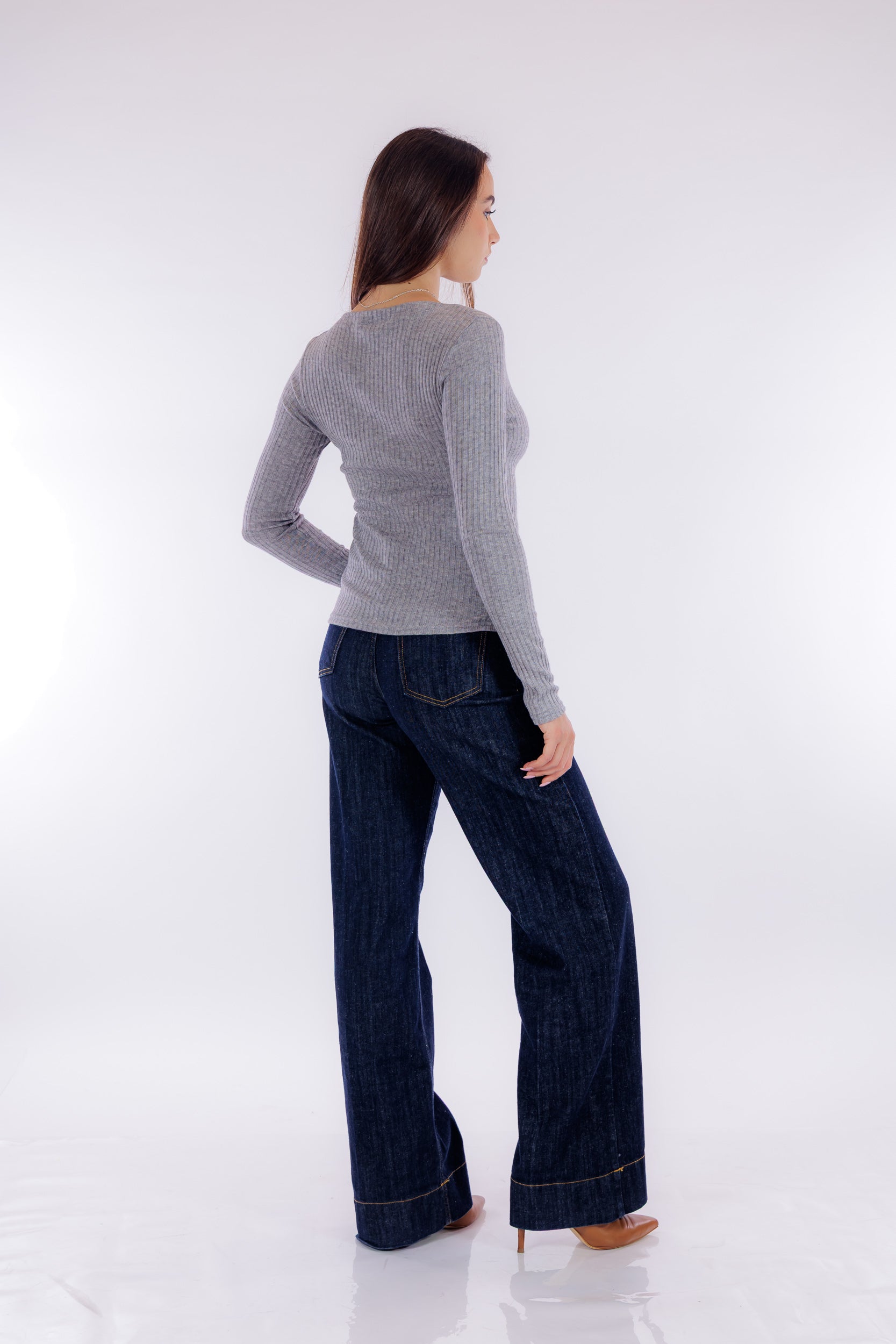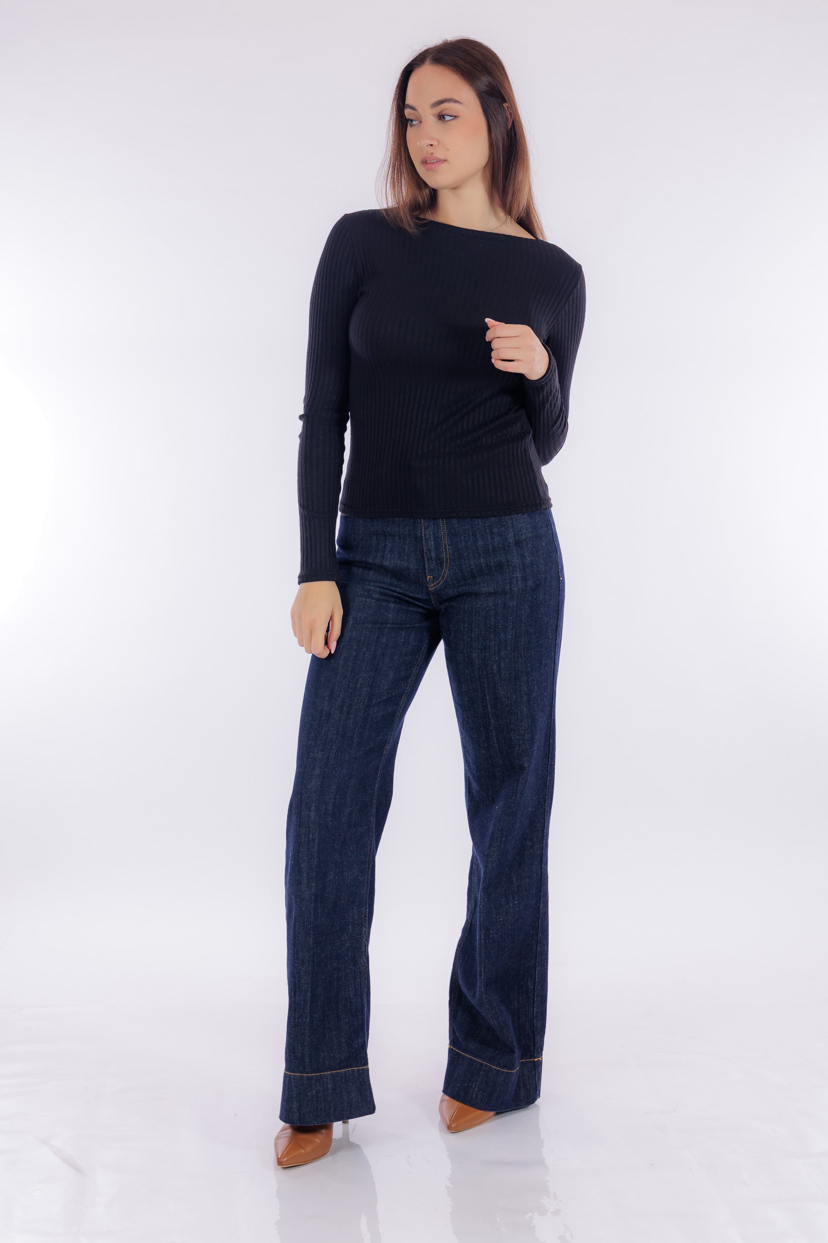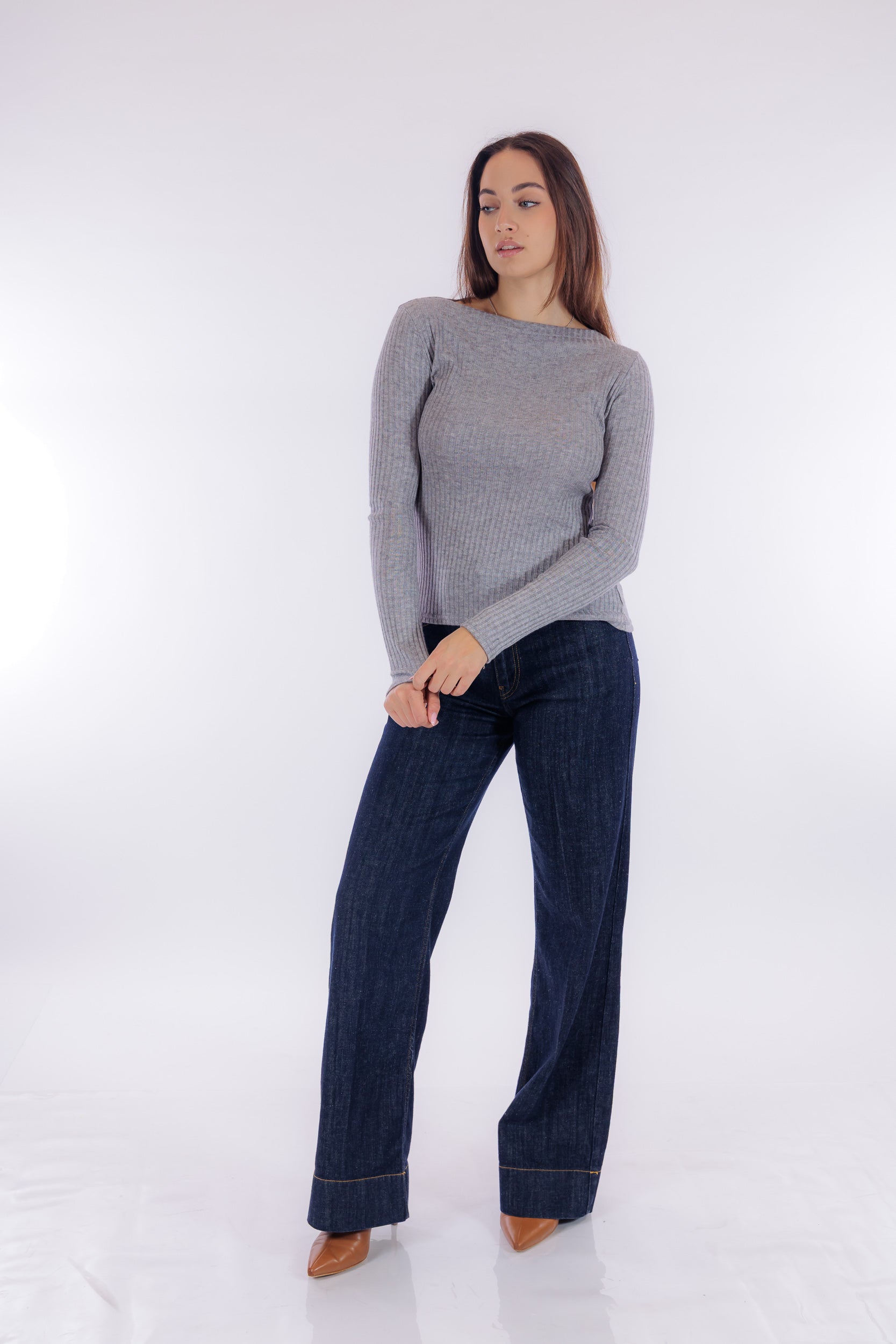 Questa maglia basica a costine con scollo a barchetta offre una vestibilità aderente che valorizza la silhouette. La lunghezza al bacino e le maniche lunghe la rendono versatile, perfetta da indossare da sola o come sottogiacca per un layering raffinato e funzionale. Un capo essenziale e di qualità per ogni guardaroba.