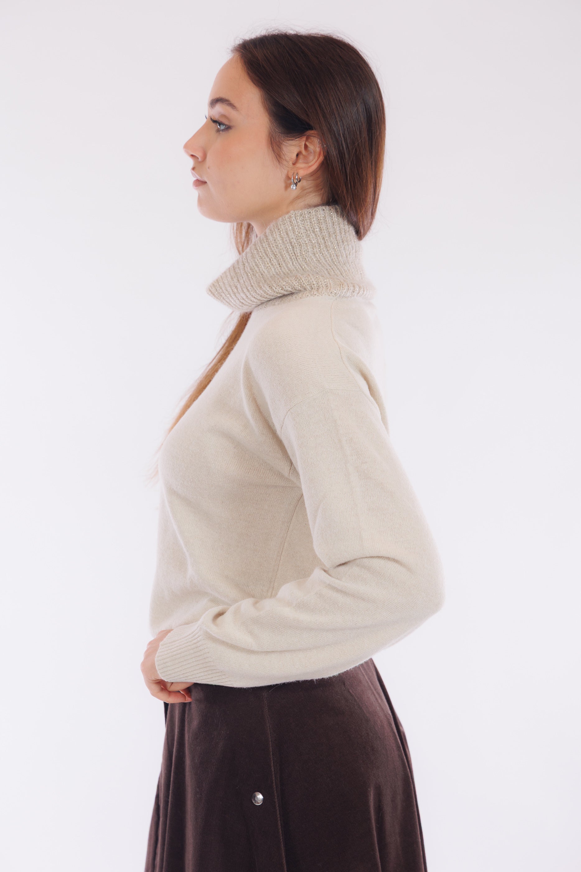 Questa maglia a collo alto ad anello unisce eleganza e comfort grazie al tessuto lurex arricchito da un misto lana vergine e cashmere, che garantisce una mano morbida e una calda vestibilità. Il fondo e i polsi presentano coste inglesi per una finitura accurata, mentre la linea morbida e la lunghezza al bacino assicurano un fit comodo e raffinato, ideale per look sofisticati e confortevoli durante i mesi più freddi.