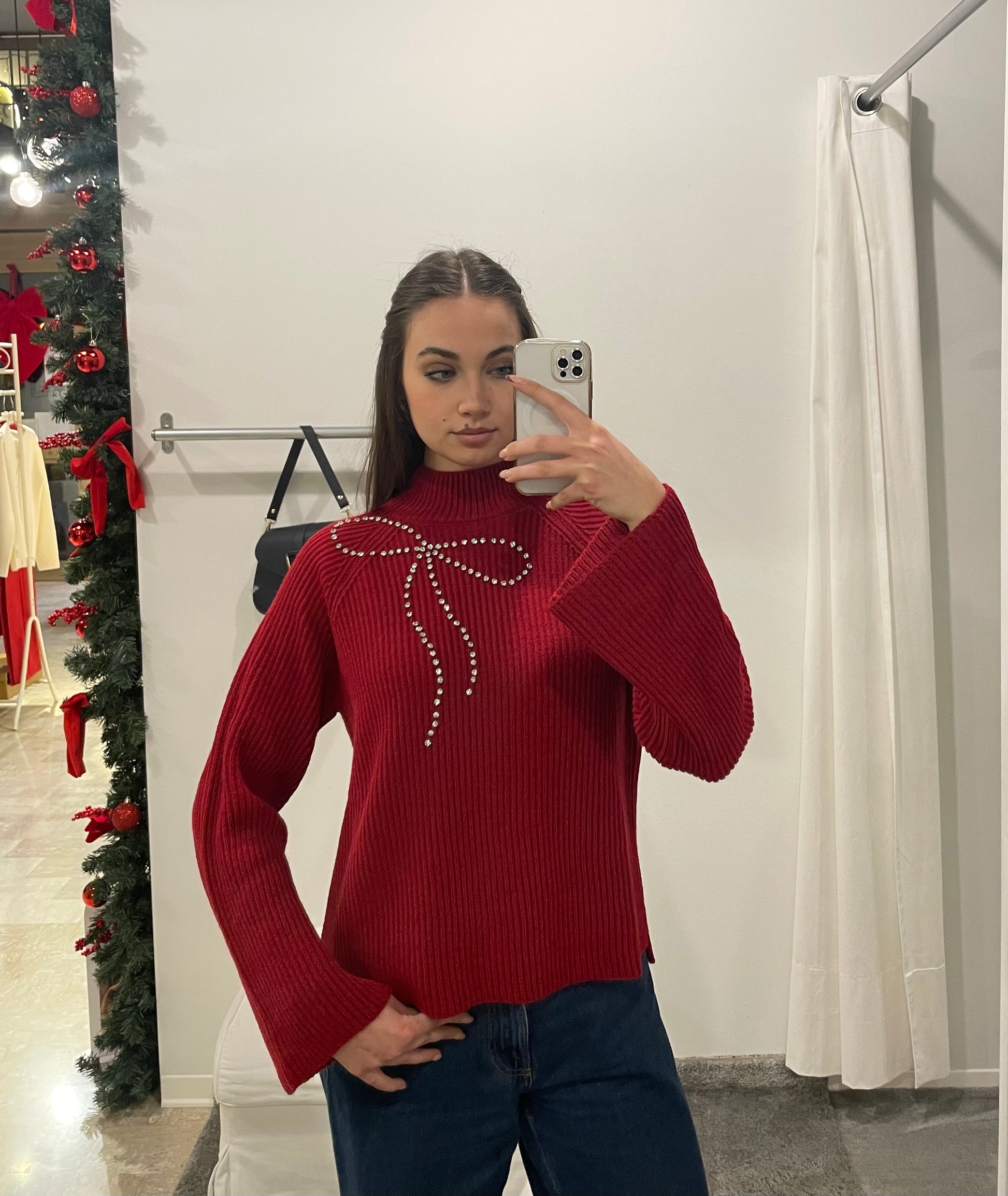 Maglione modello scatolina, lavorato con costa inglese. Realizzato con collo alto e maniche ampie, ma il tocco di originalità è dato da un grande fiocco di strass posto sul fronte della maglia. Spacchetti laterali sul fondo; il dietro è un po' più lungo del davanti.