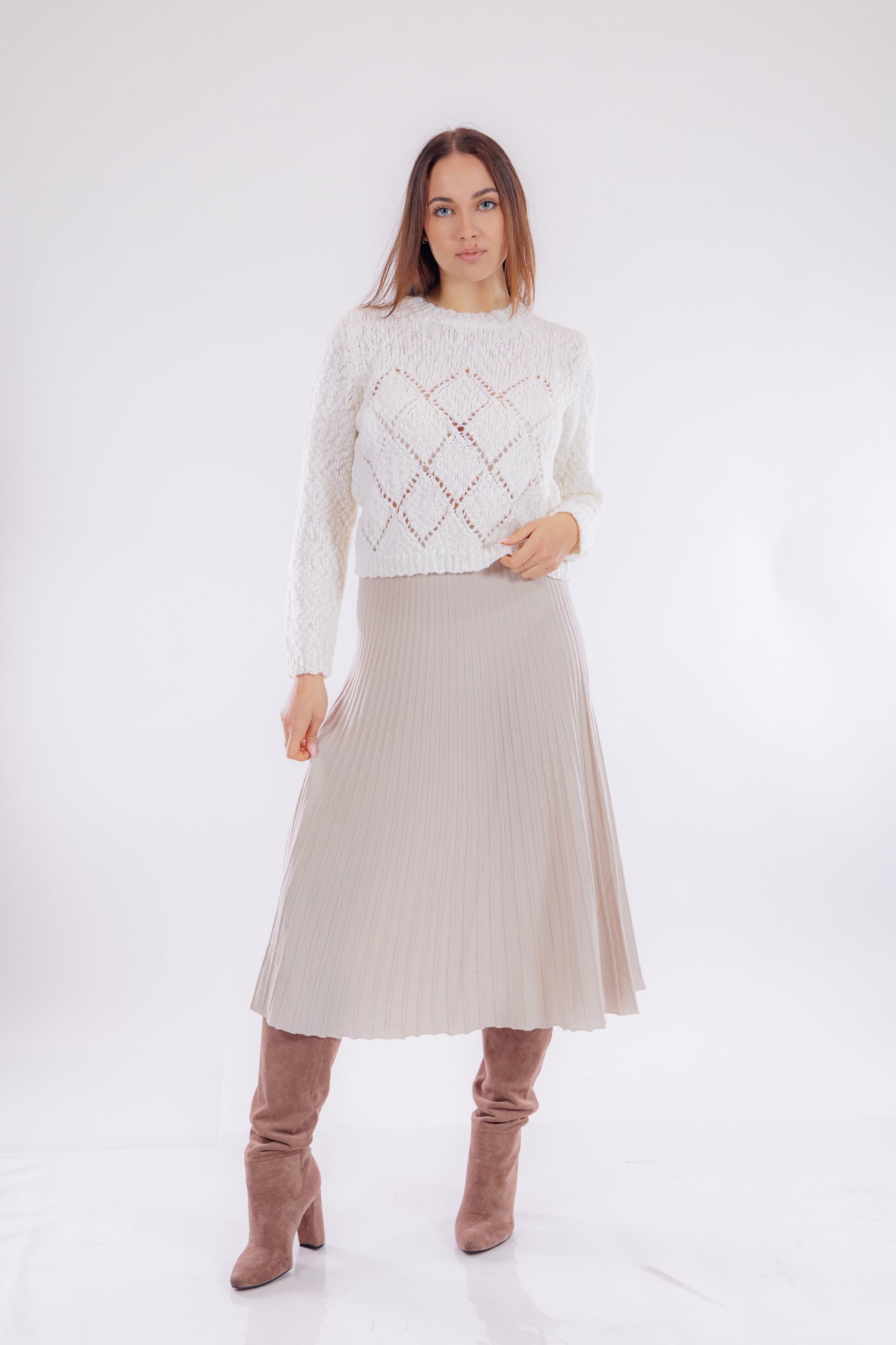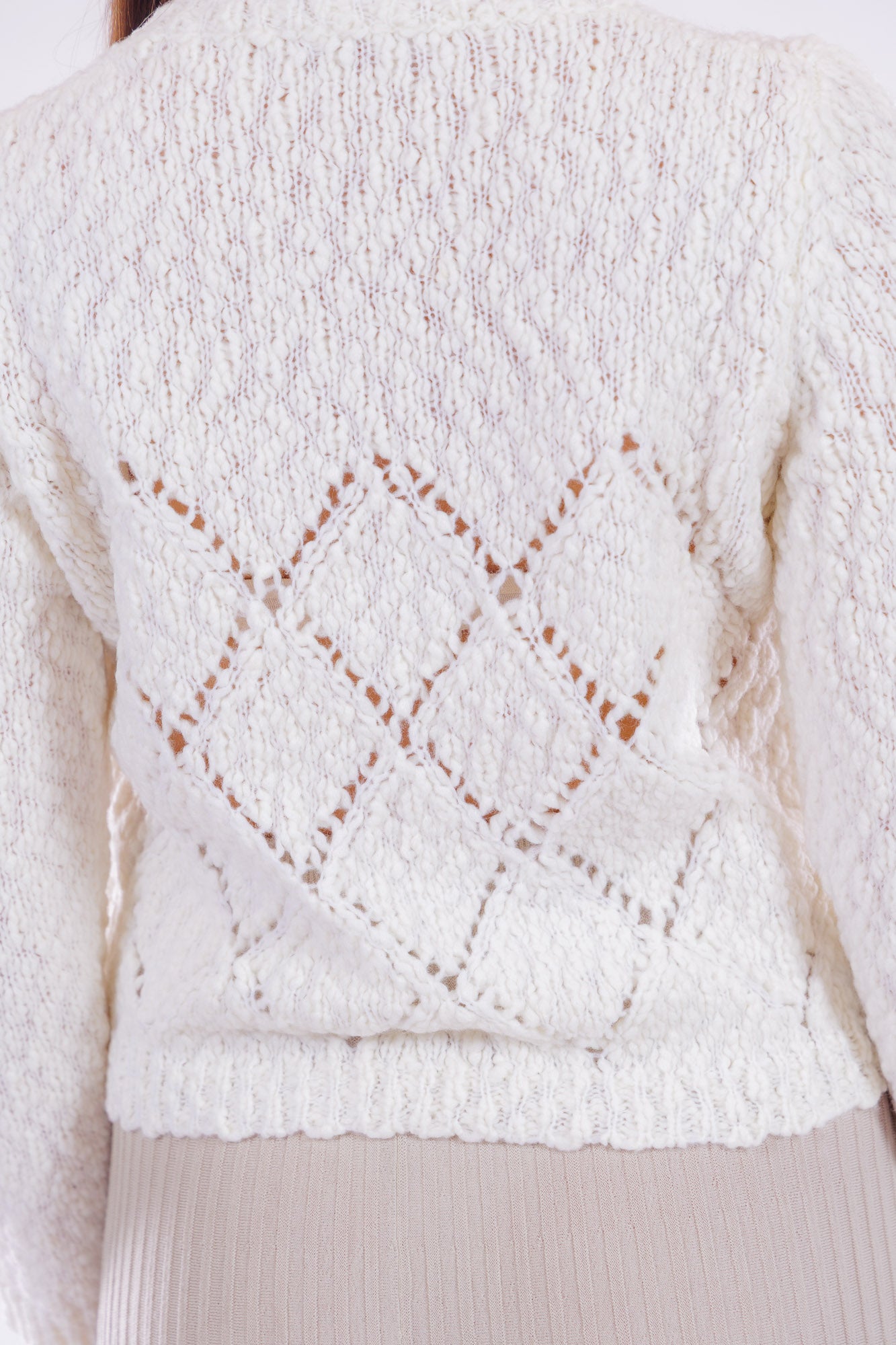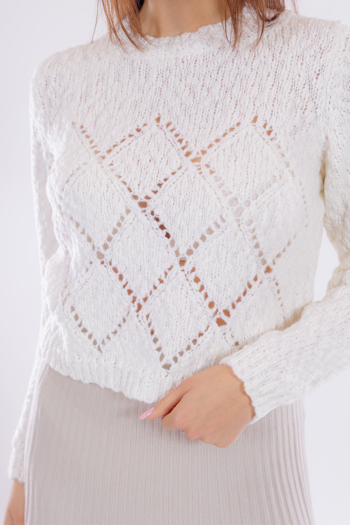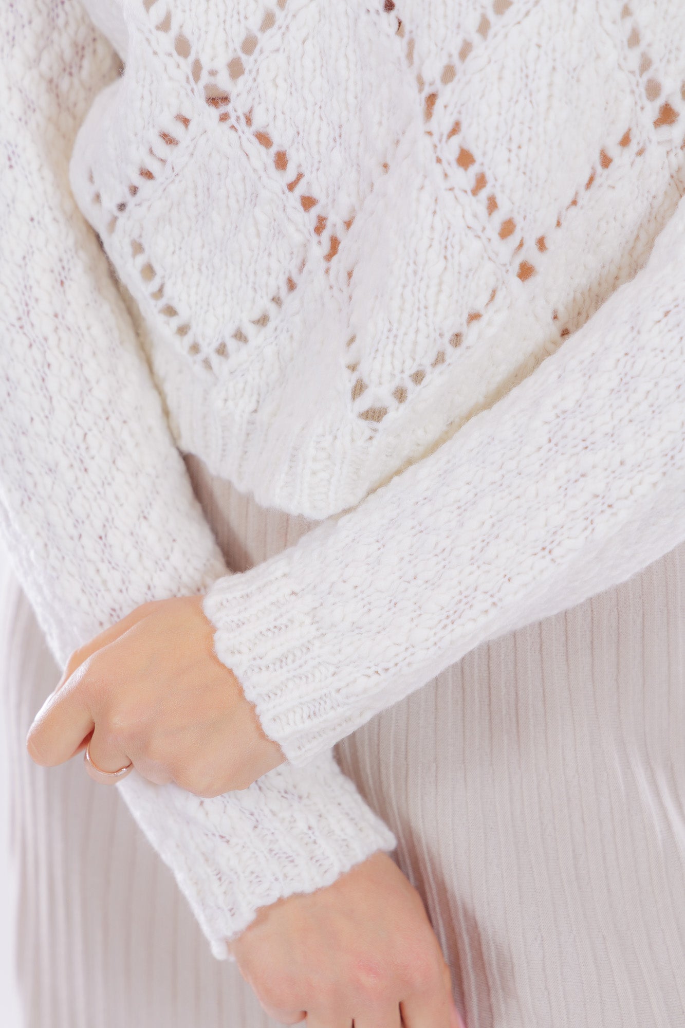 Maglia punzonata a rombi dalla vestibilità morbida e lunghezza corta che poggia sul bacino. Il tessuto misto lana vergine merinos extrafine la rende calda e confortevole. Il suo design con rombi davanti e dietro aggiunge un tocco di stile alla classica maglia girocollo.