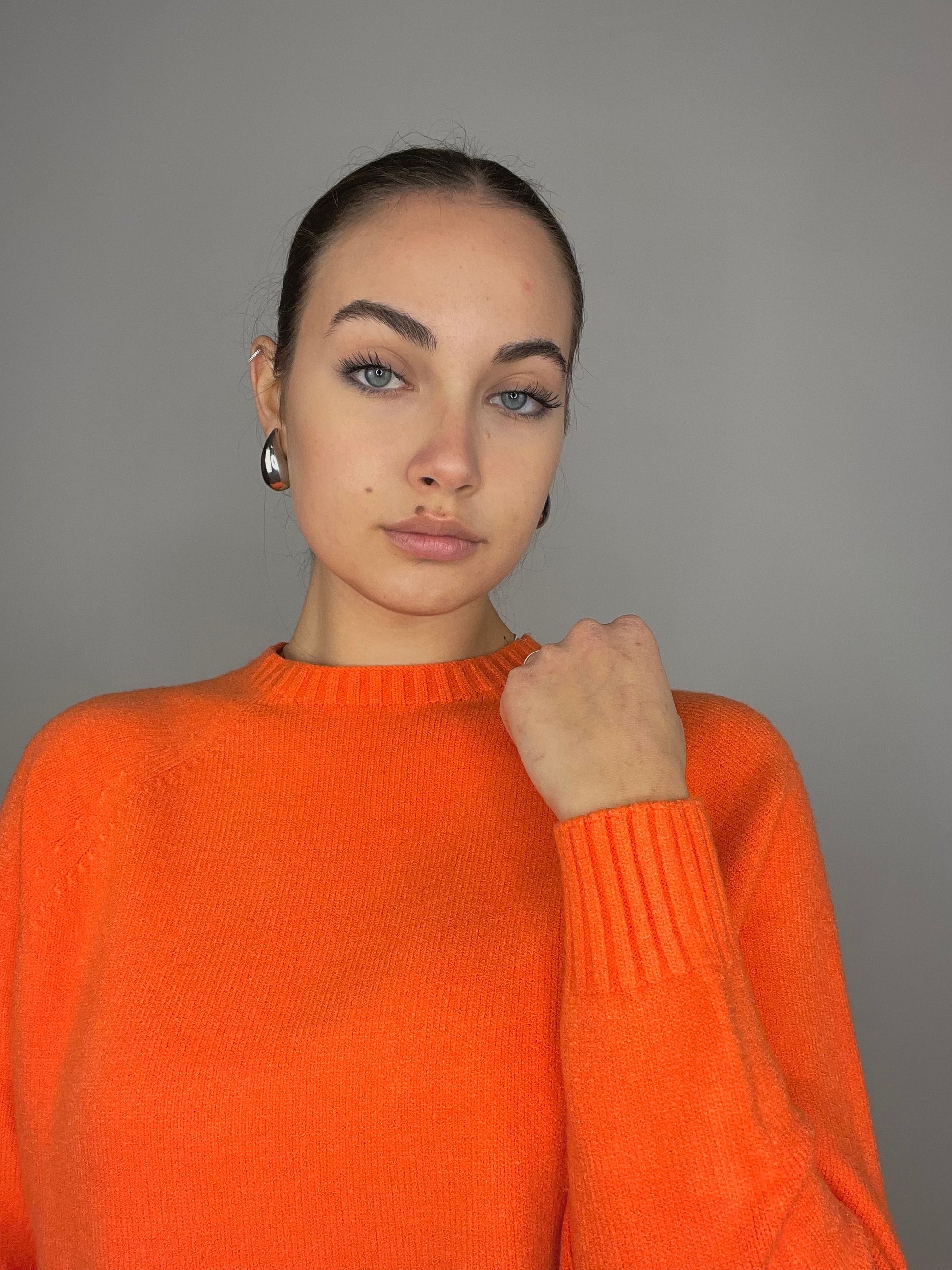 Questa calda maglia a girocollo è resa particolare dai sui spacchetti laterali sul fondo. Il modello è over, le maniche sono a raglan e i lati di questi capi sono caratterizzati da una graziosa lavorazione a trecce.
