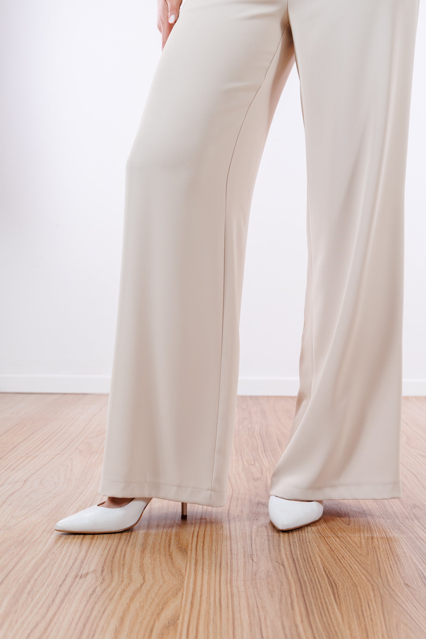 Pantalone palazzo in cady fluido che unisce eleganza e comfort. Vita media con chiusura zip e bottone, passanti in vita per una vestibilità sicura. La gamba ampia crea una silhouette sofisticata e moderna. Tasche funzionali sui fianchi davanti, retro liscio per un profilo pulito. Il tessuto cady garantisce una caduta naturale e una sensazione di leggerezza, perfetto per occasioni formali e outfit quotidiani raffinati.