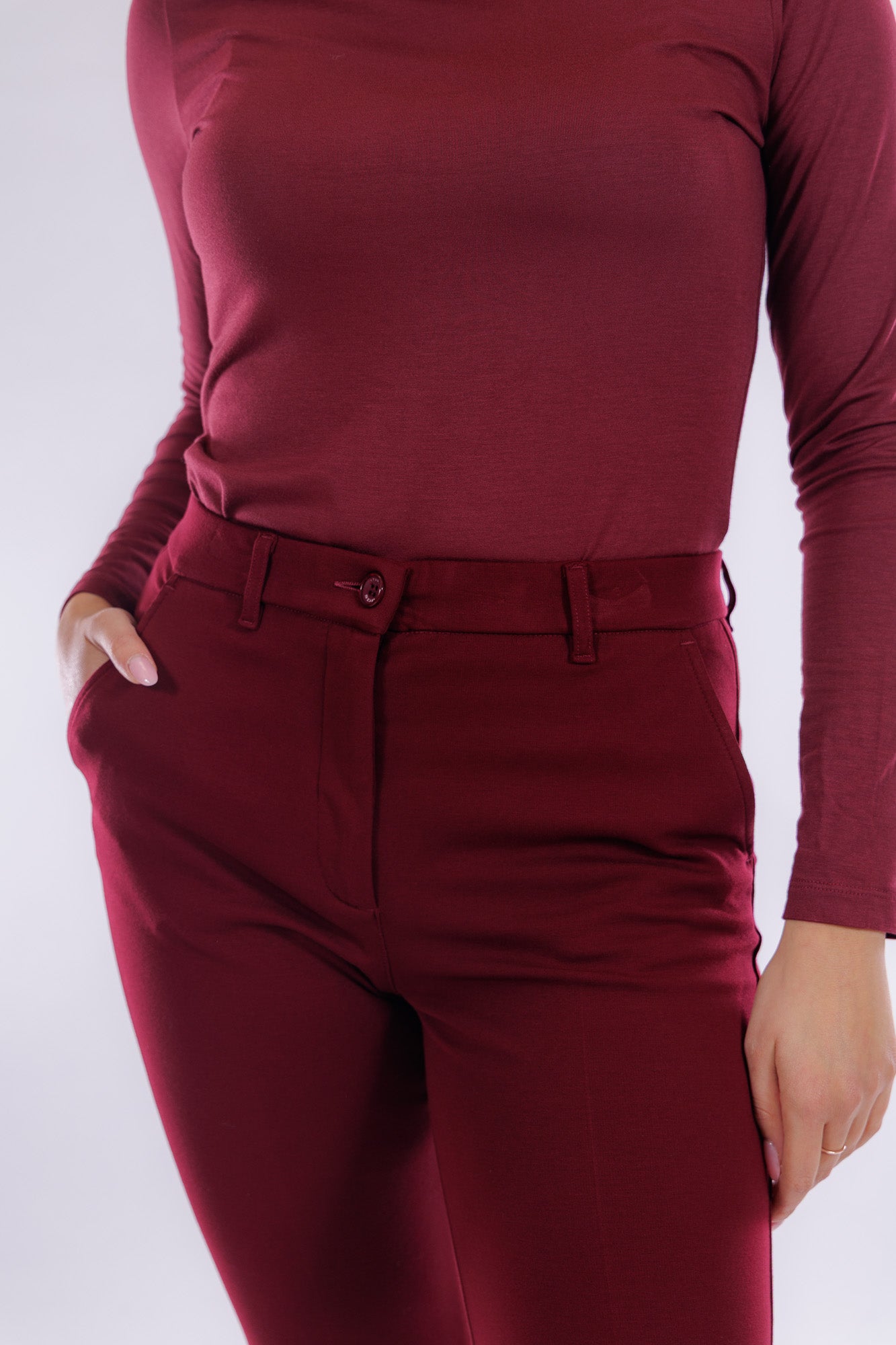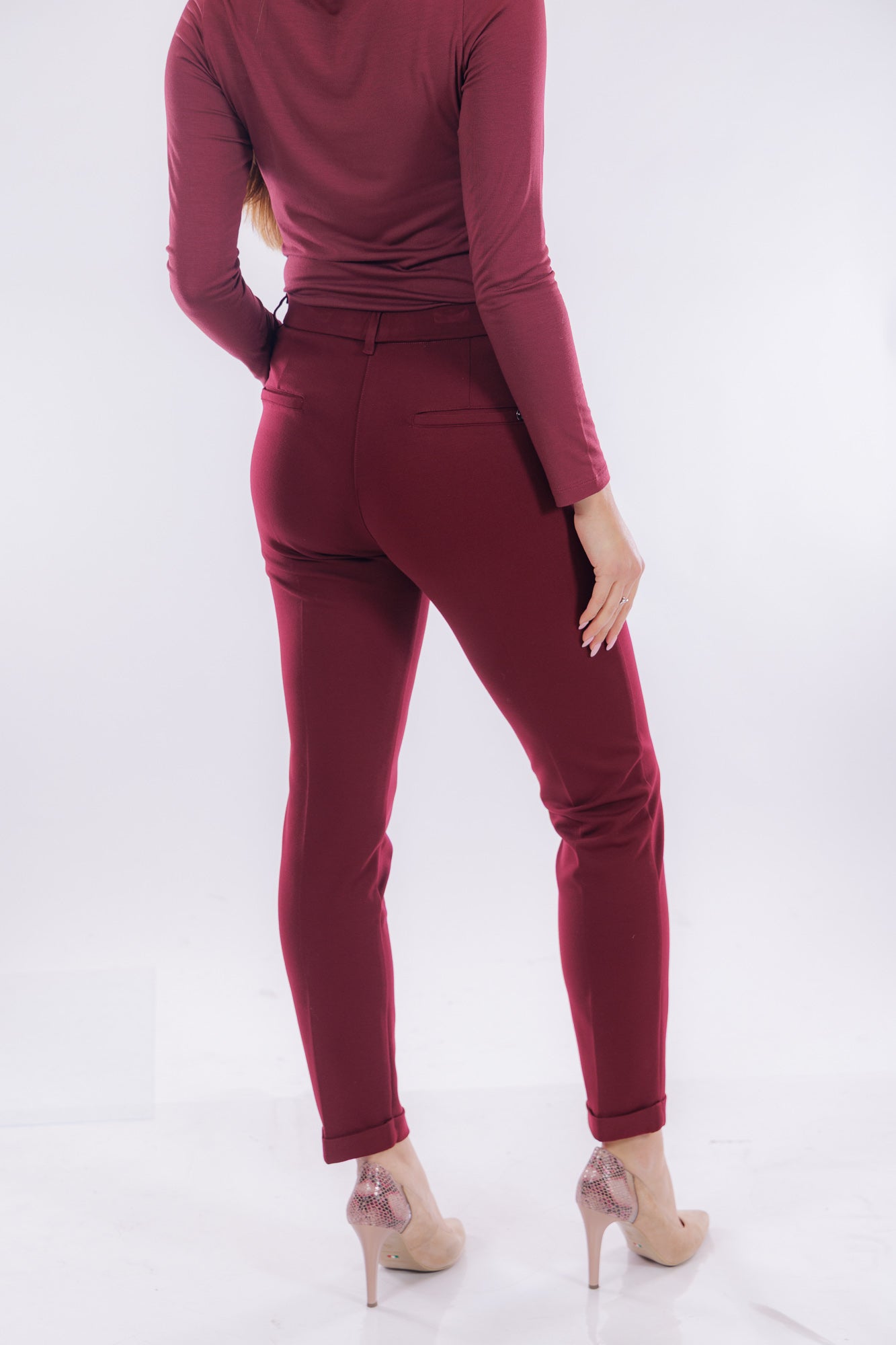Questo pantalone in tessuto elasticizzato punto milano unisce comfort e stile. Con cinturino elasticizzato e passanti in vita, offre una vestibilità asciutta. Dotato di finte taschine a filetto dietro, tasche francesi davanti, apertura zip e bottone e risvoltino sul fondo per un tocco di eleganza.