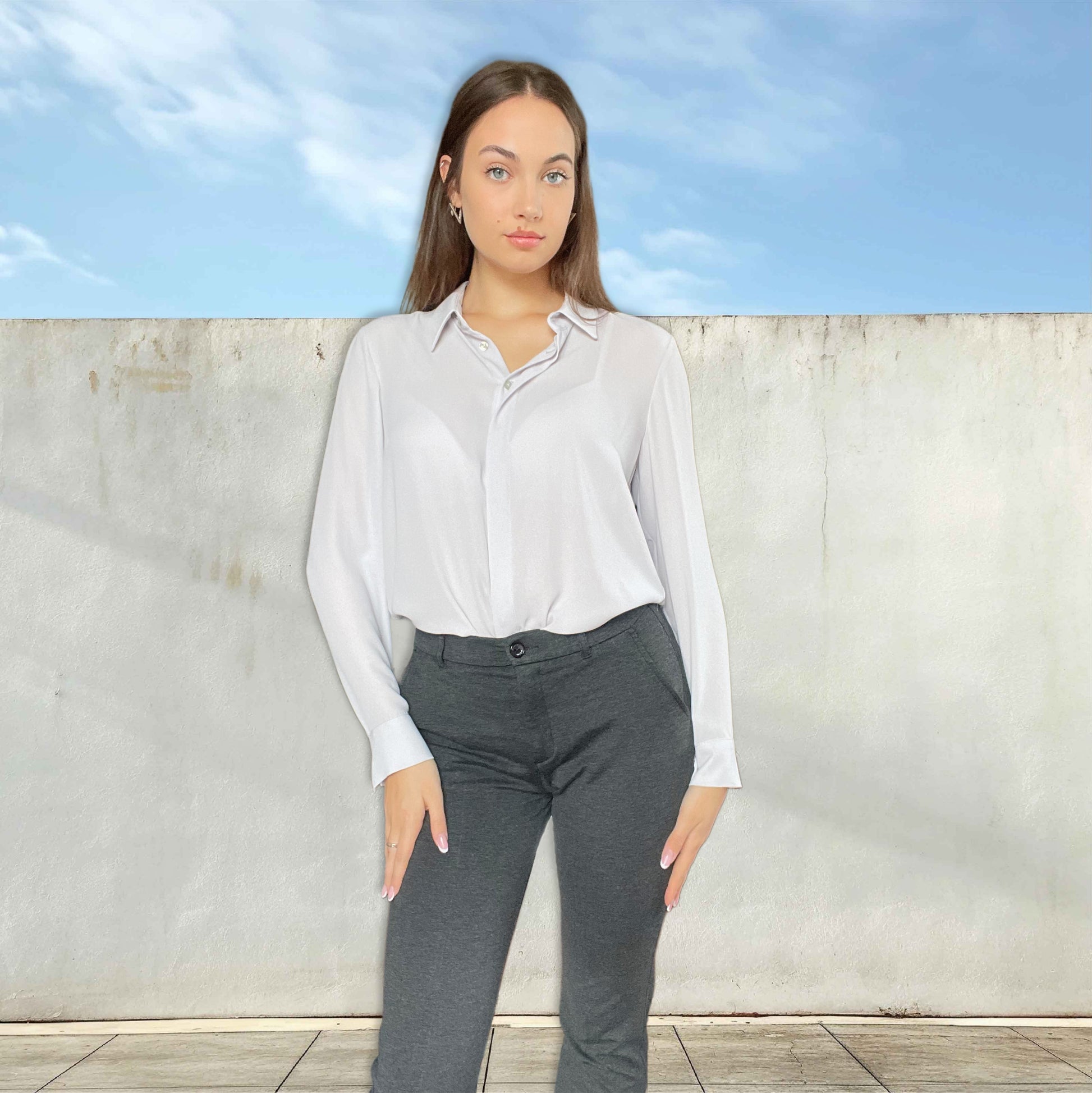 Pantalone con vestibilità asciutta, risvoltino sul fondo, taschine alla francese davanti e taschine finte dietro. Chiusura pratica con zip e bottone. Cinturino elastico in vita e passanti per un'eventuale cintura.