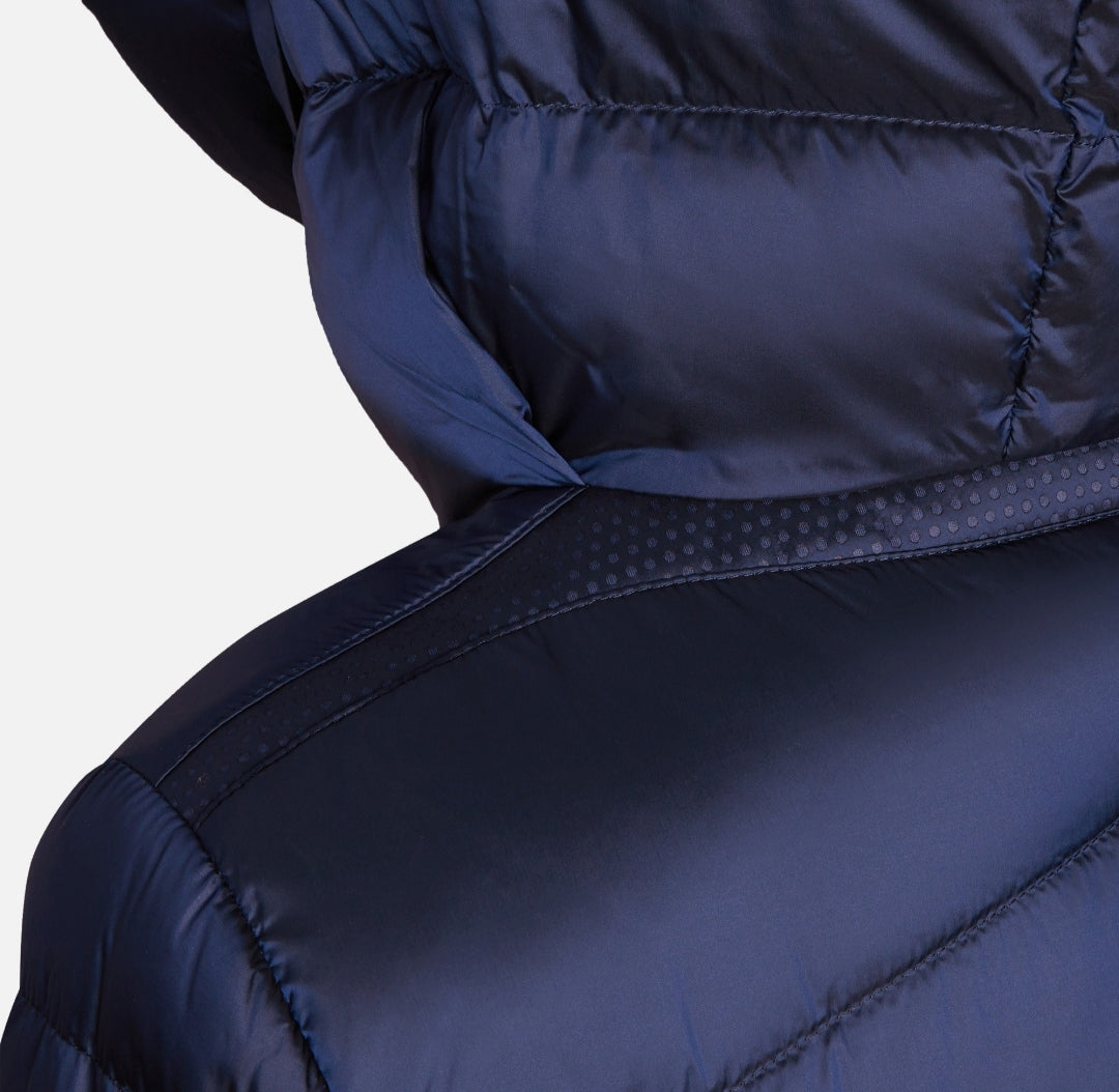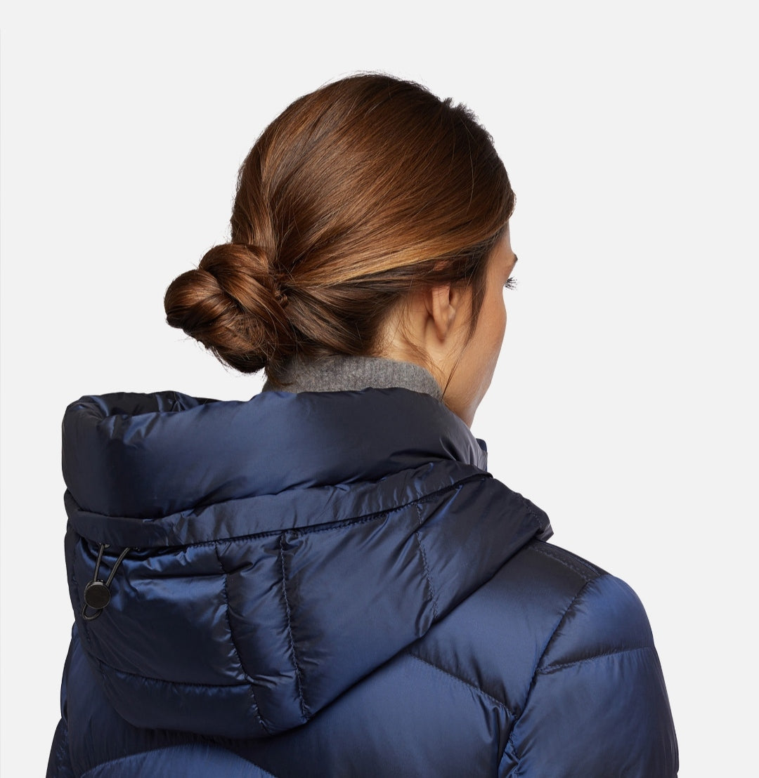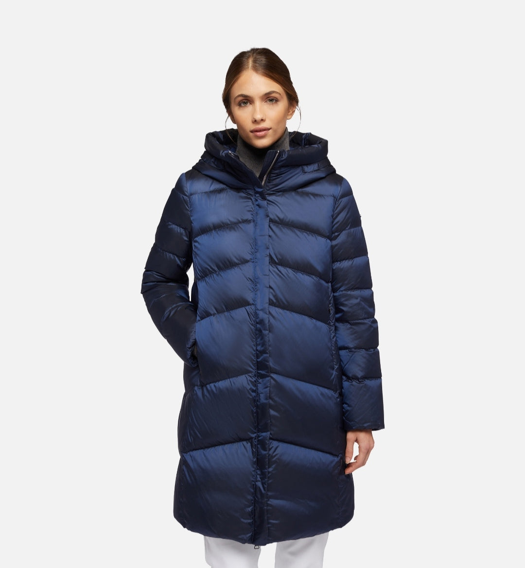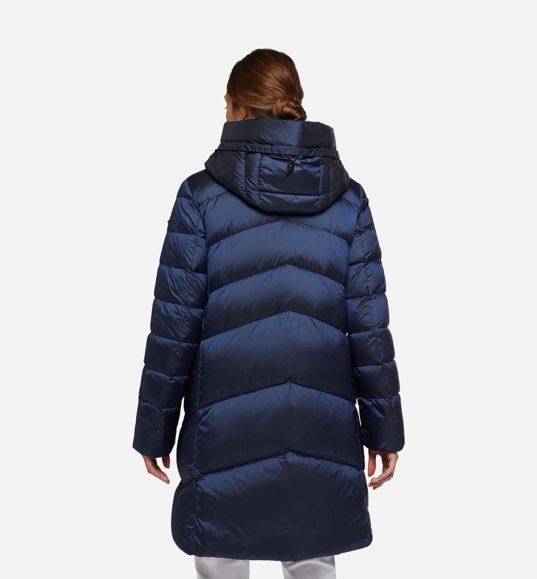 Piumino d'oca lungo con cappuccio avvolgente, dal taglio svasato e design femminile. Presentato in elegante blu cangiante. Caldo, soffice e con imbottitura a lisca di pesce. Vestibilità regolare ed elevata protezione da freddo.