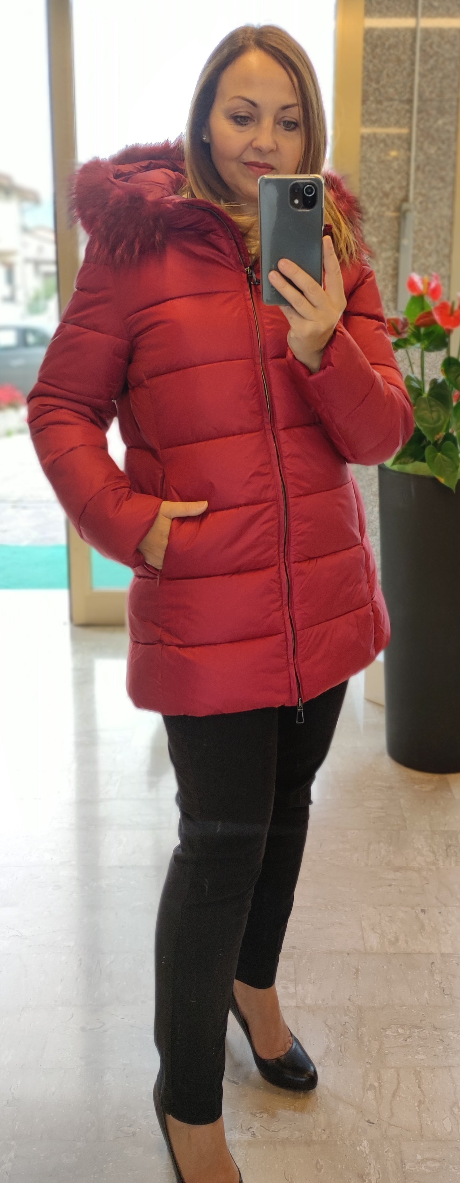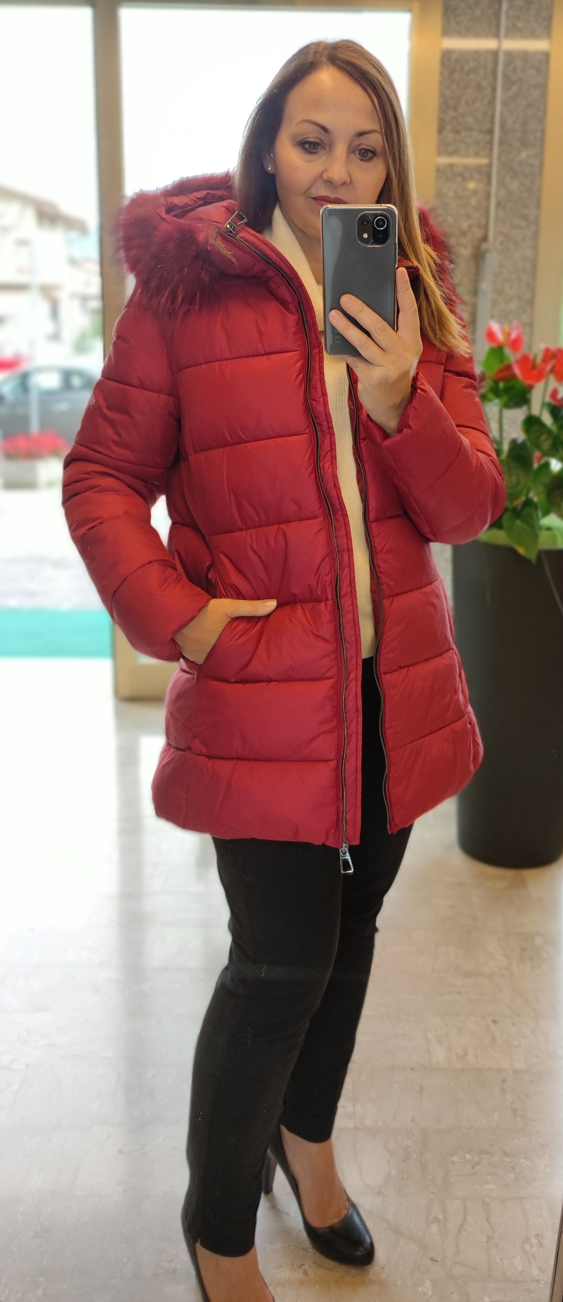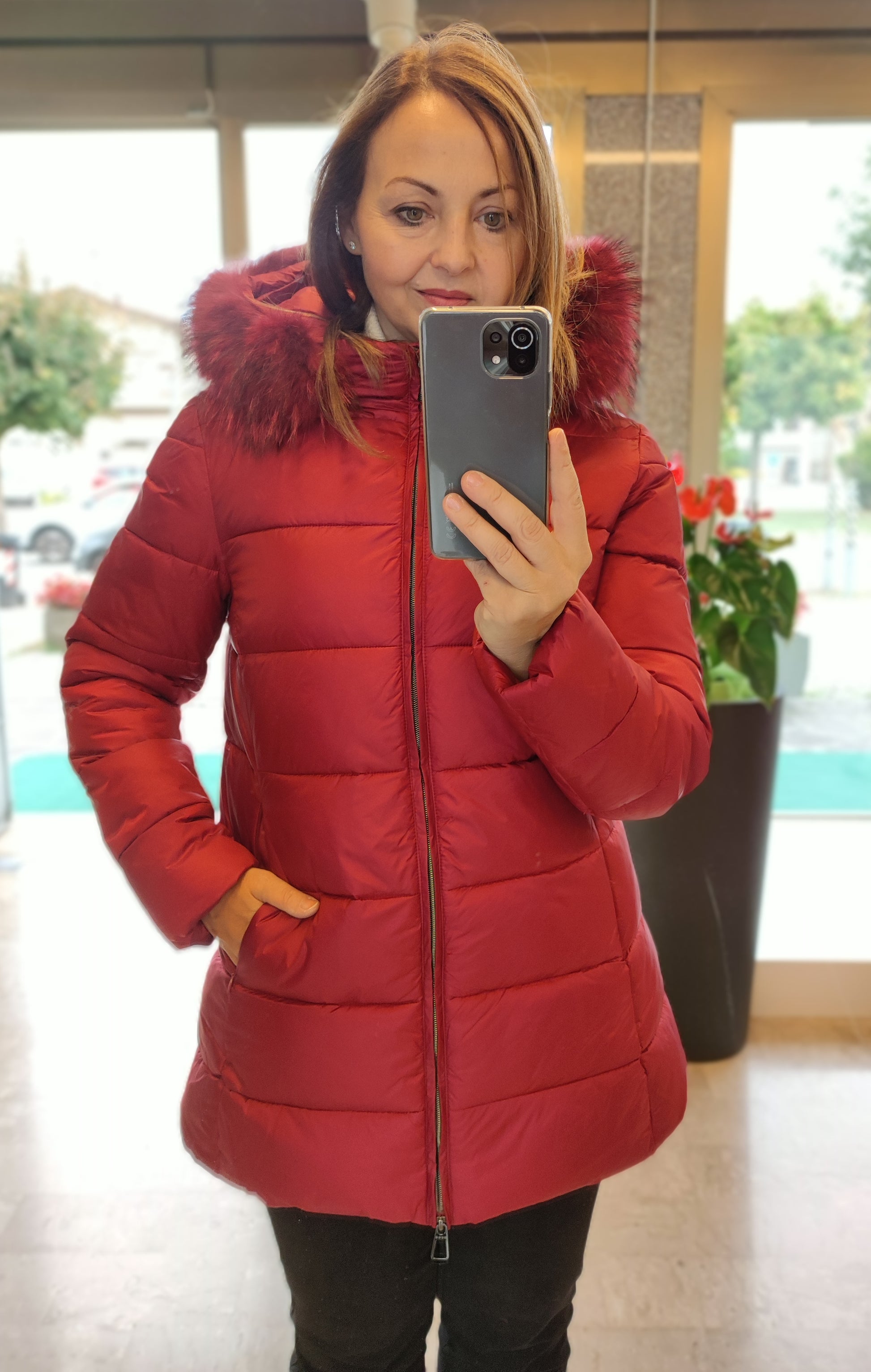 Giaccone in eco piuma, leggermente sfiancato, con imbottitura orizzontale larga. Cappuccio staccabile bordato di vera pelliccia staccabile.