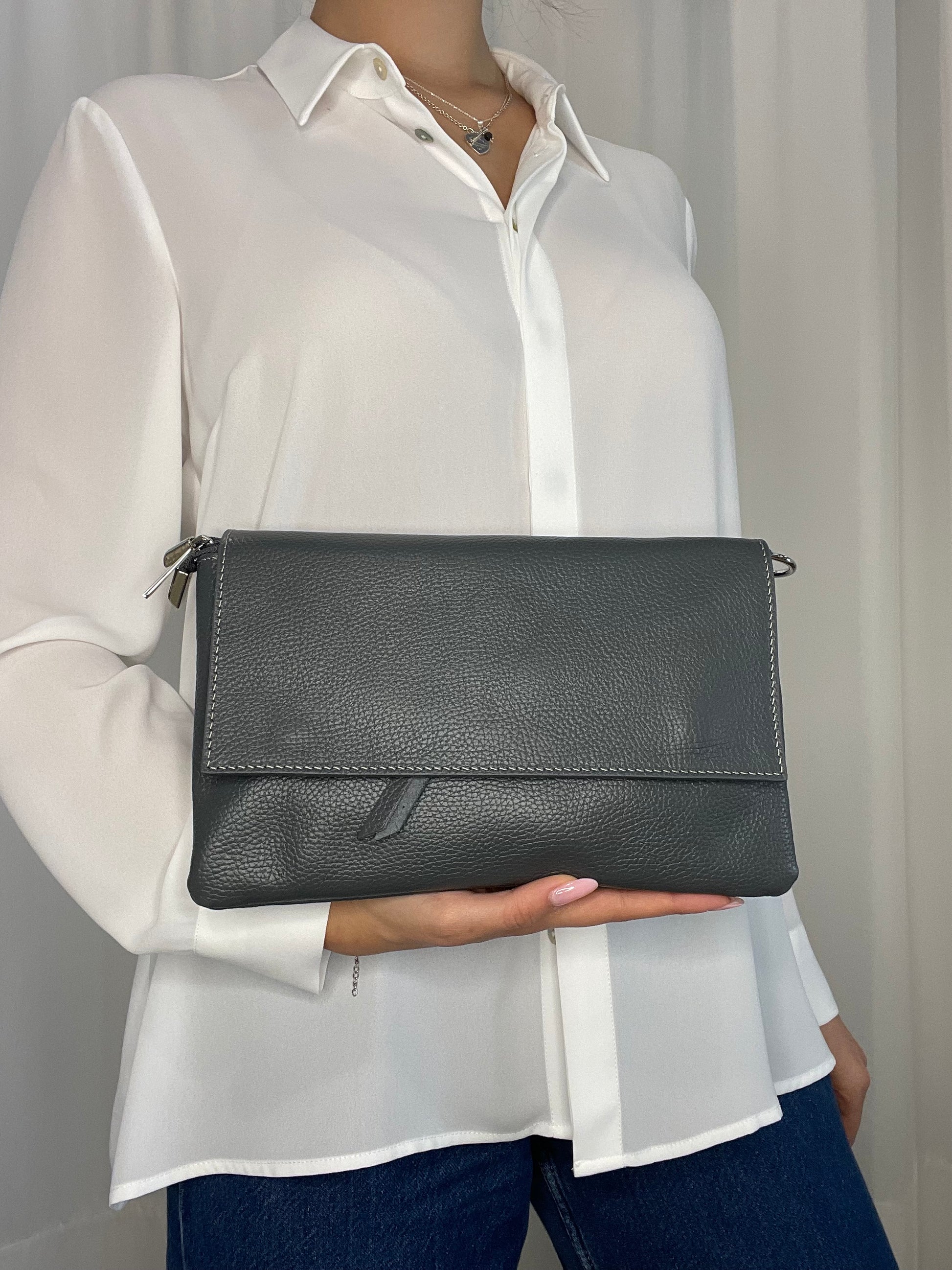 Borsa versatile, in morbidissima vera pelle, dotata di tracolla regolabile e removibile, grazie ai ganci argentati che si aprono e chiudono. L'apertura a pattina è assicurata da due bottoni metallici. L'interno invece è molto capiente, dotato di due scompartimenti zippati e un'ulteriore tasca esterna, altrettanto zippata.