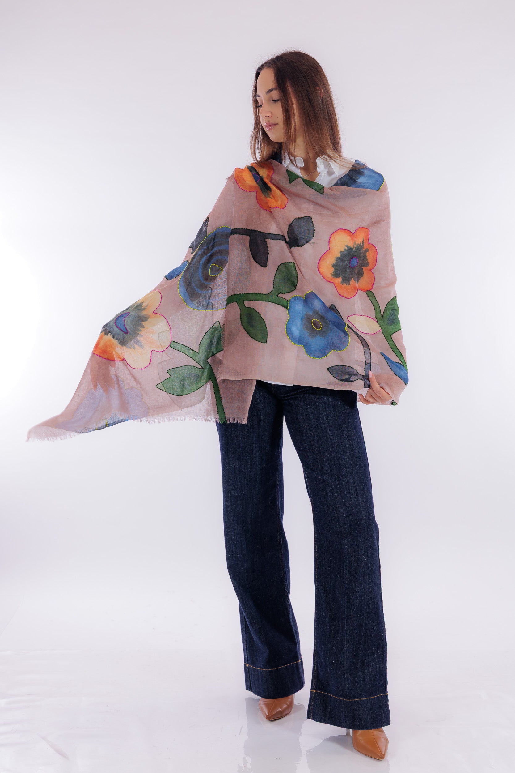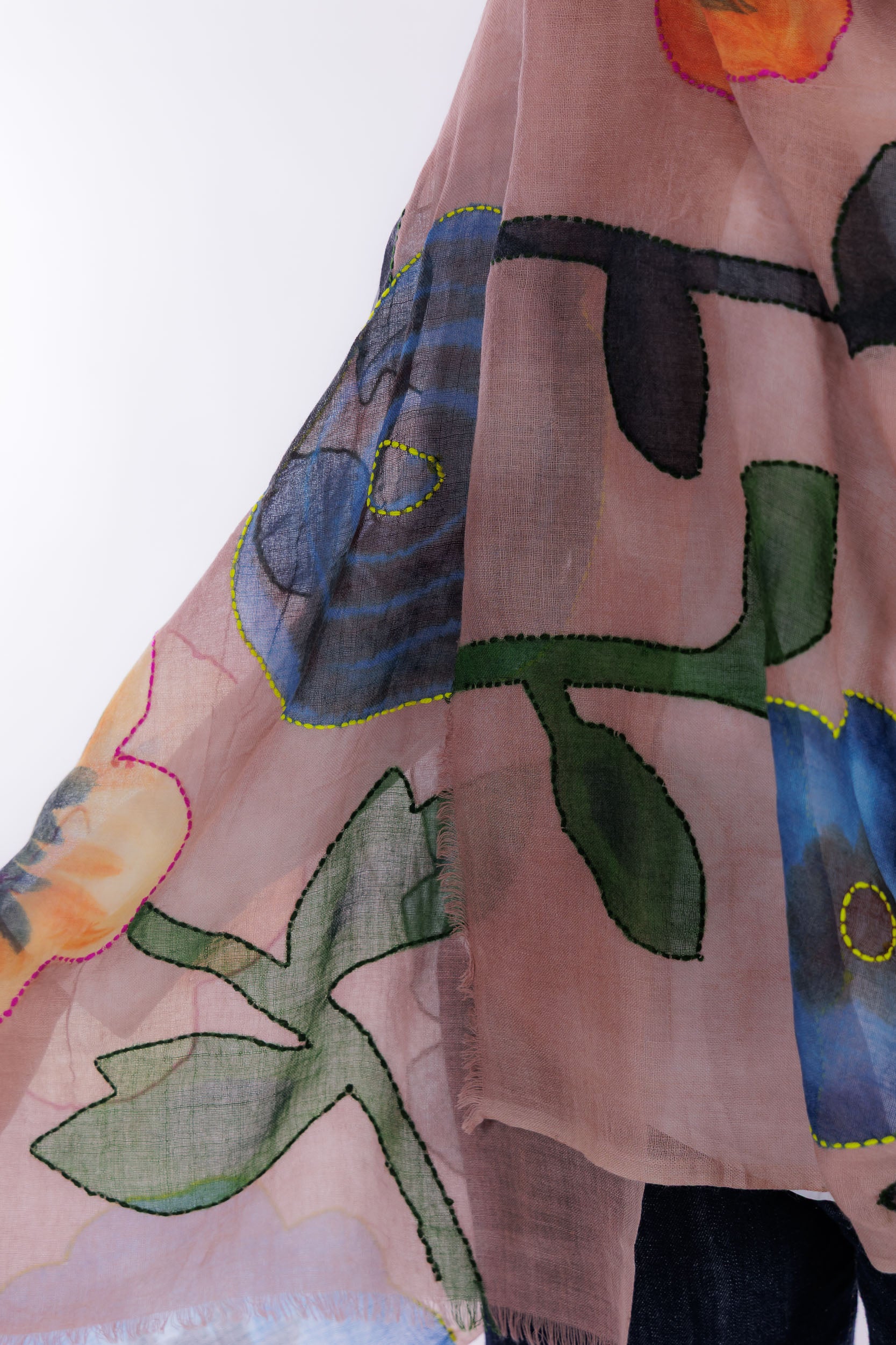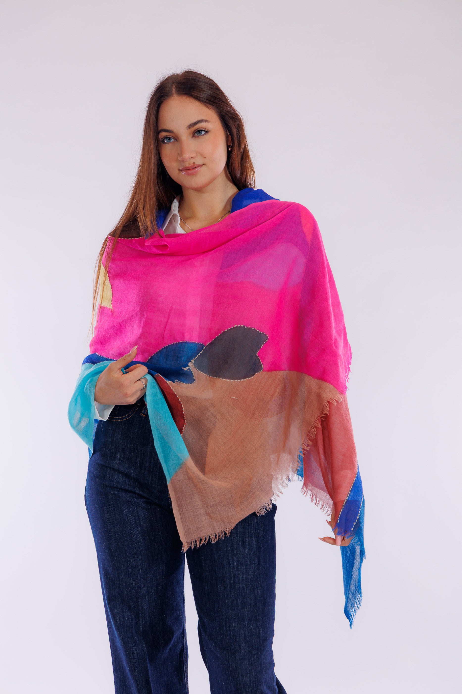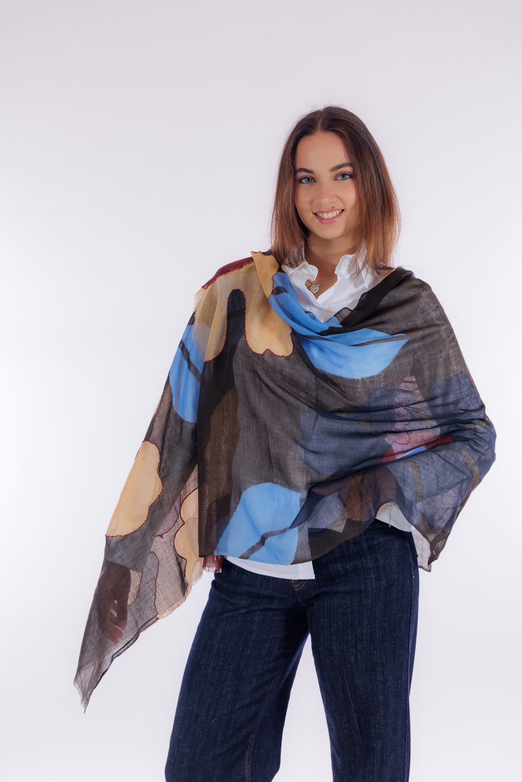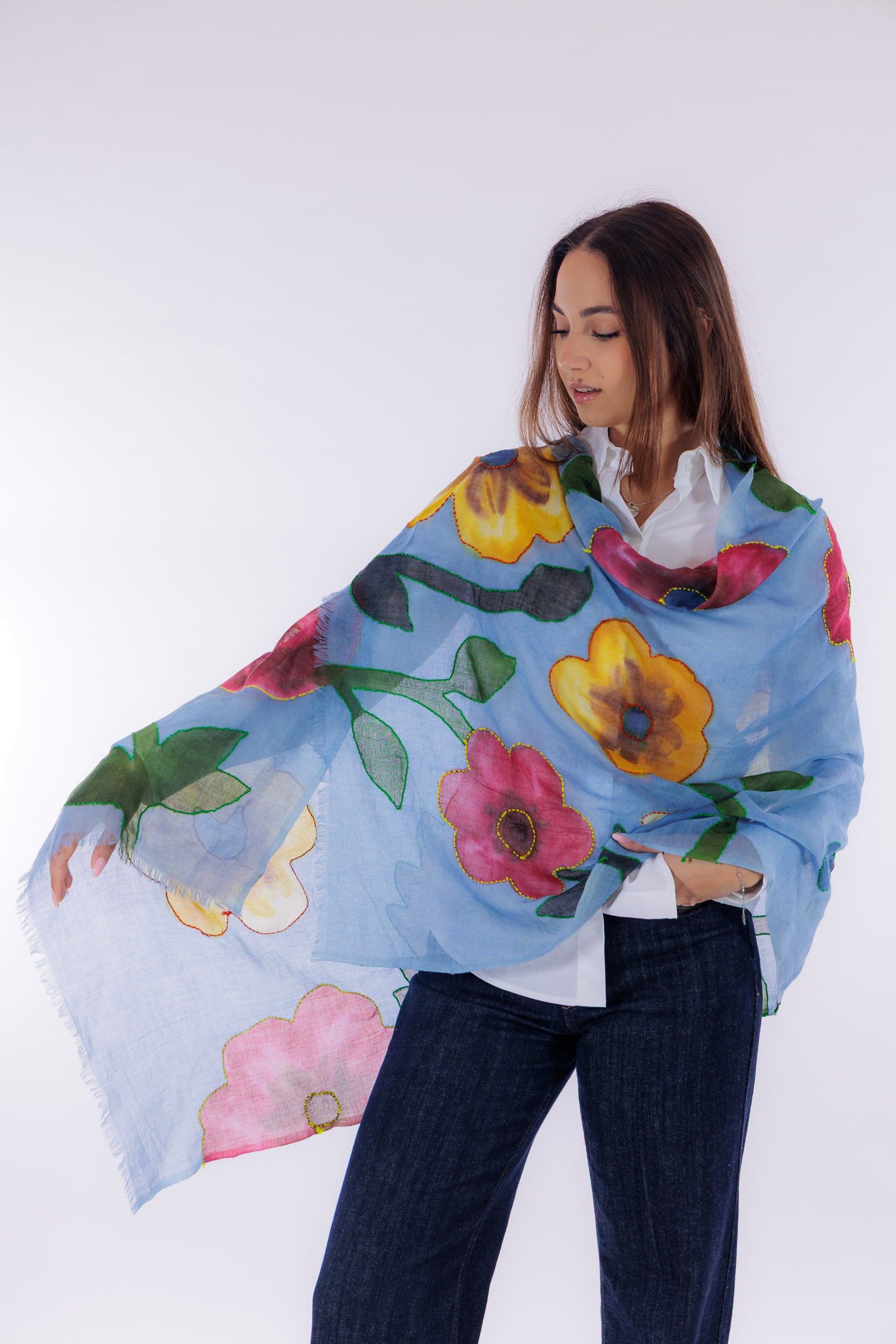 Elegante e morbidissima sciarpa disponibile in varie fantasie. Realizzata in pura lana, ricamata e dipinta a mano.