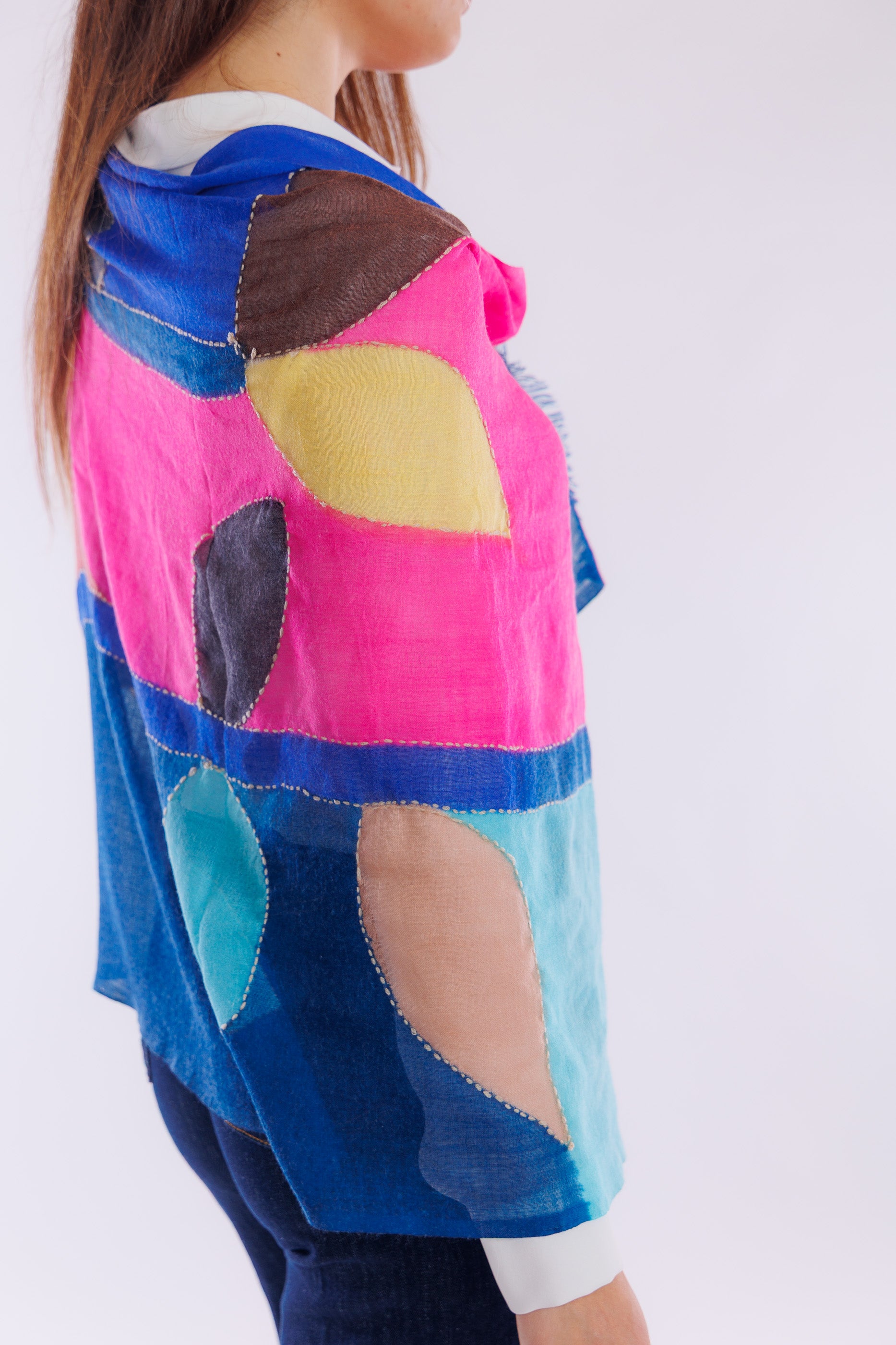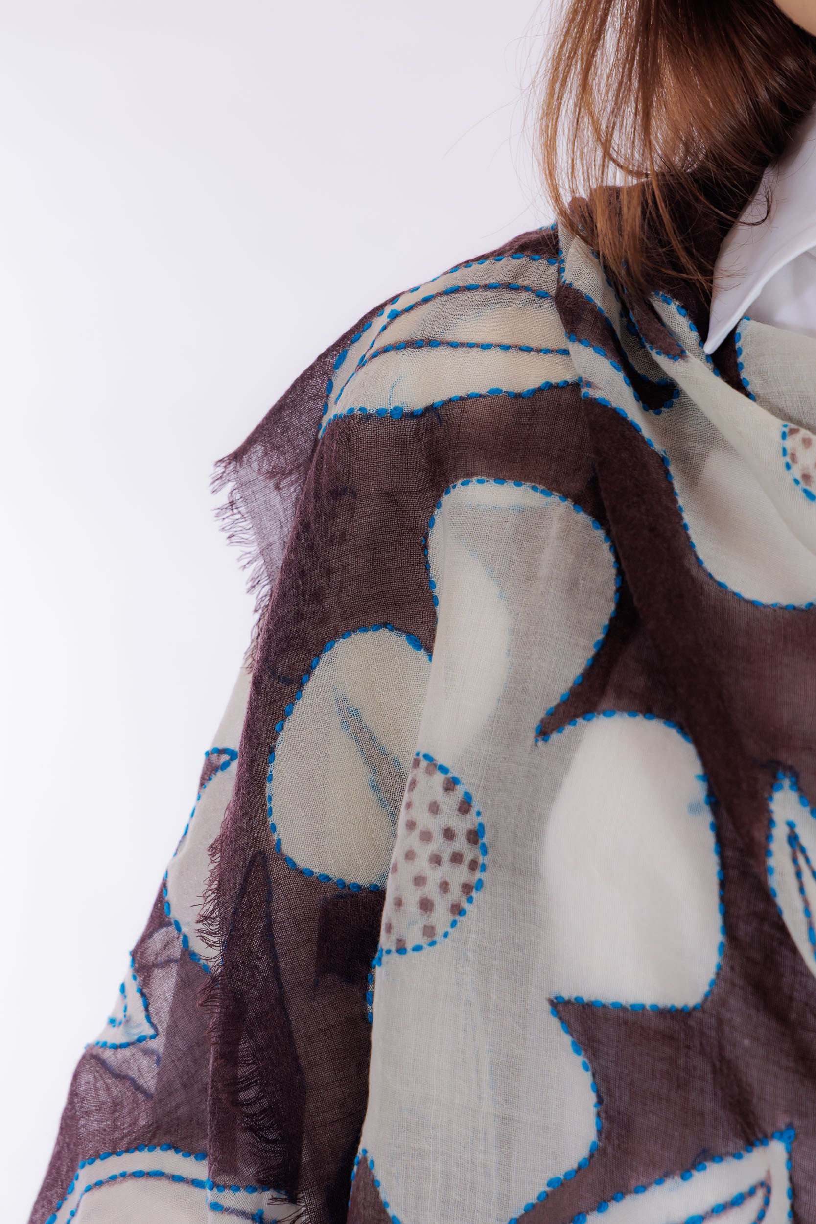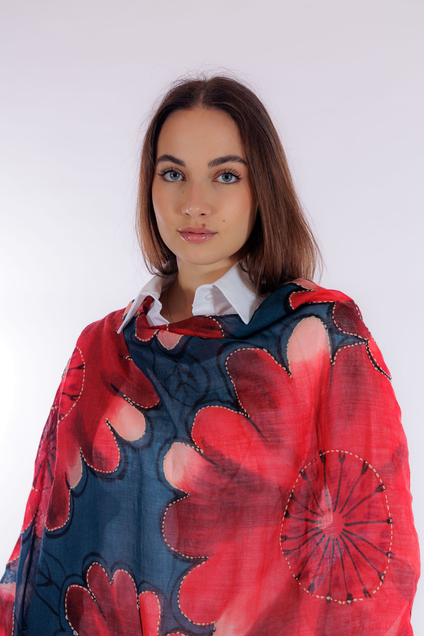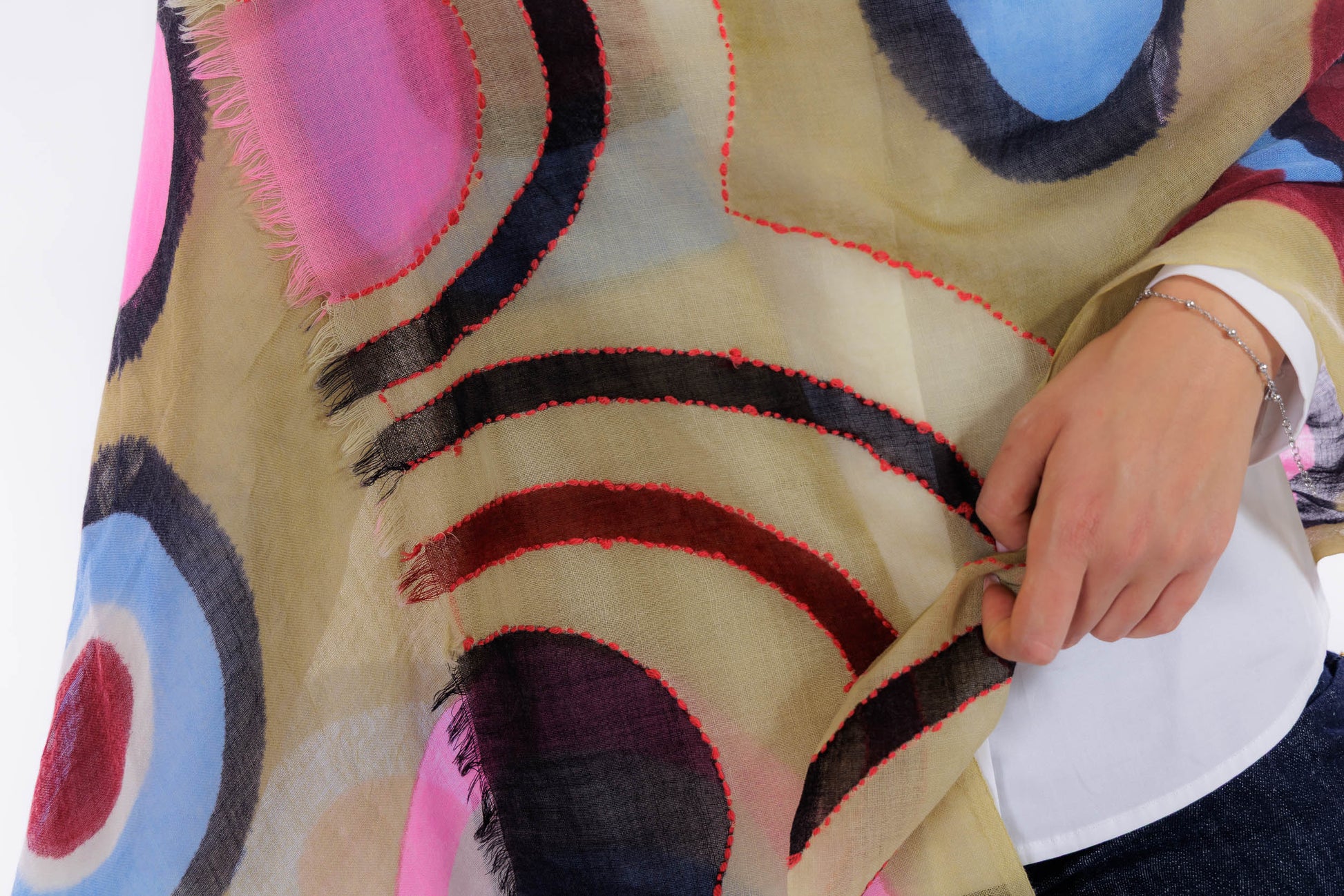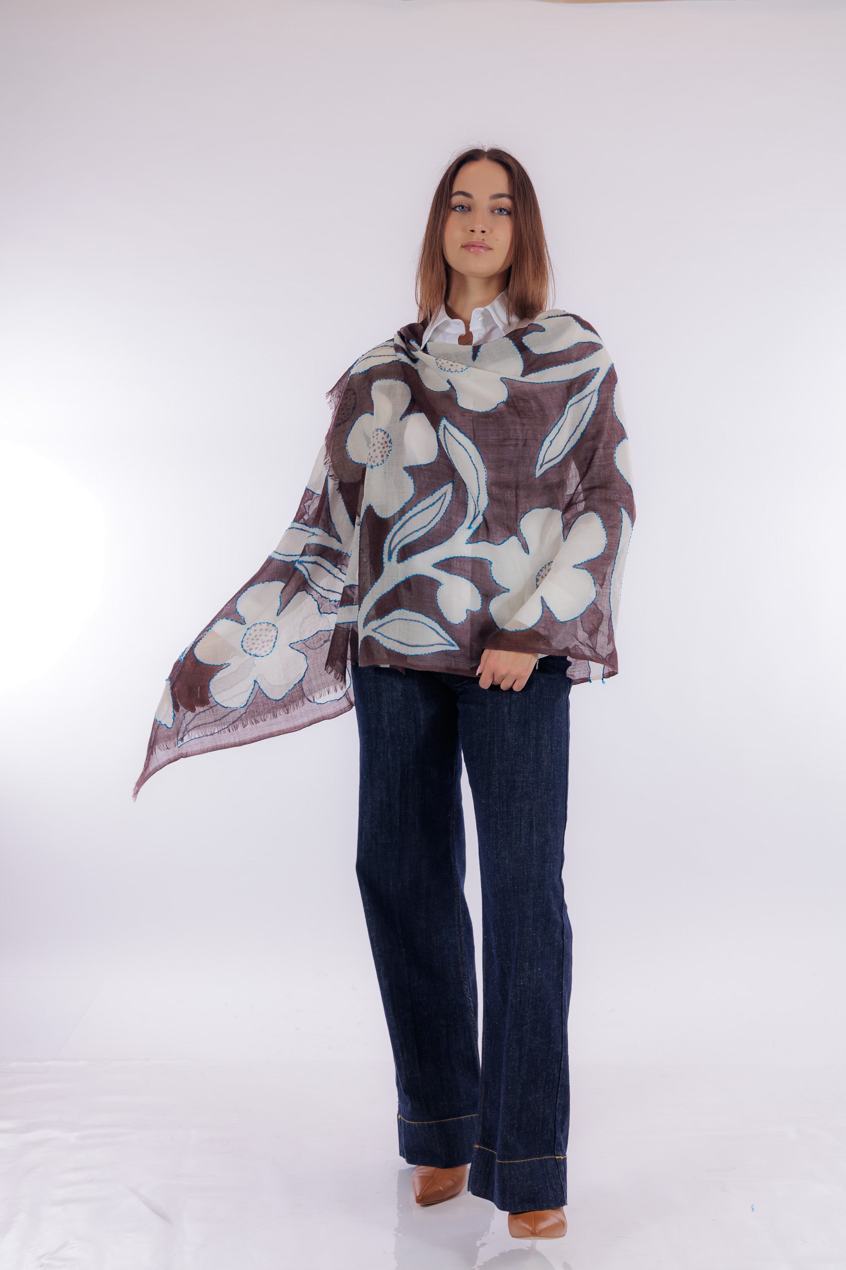 Elegante e morbidissima sciarpa disponibile in varie fantasie. Realizzata in pura lana, ricamata e dipinta a mano.