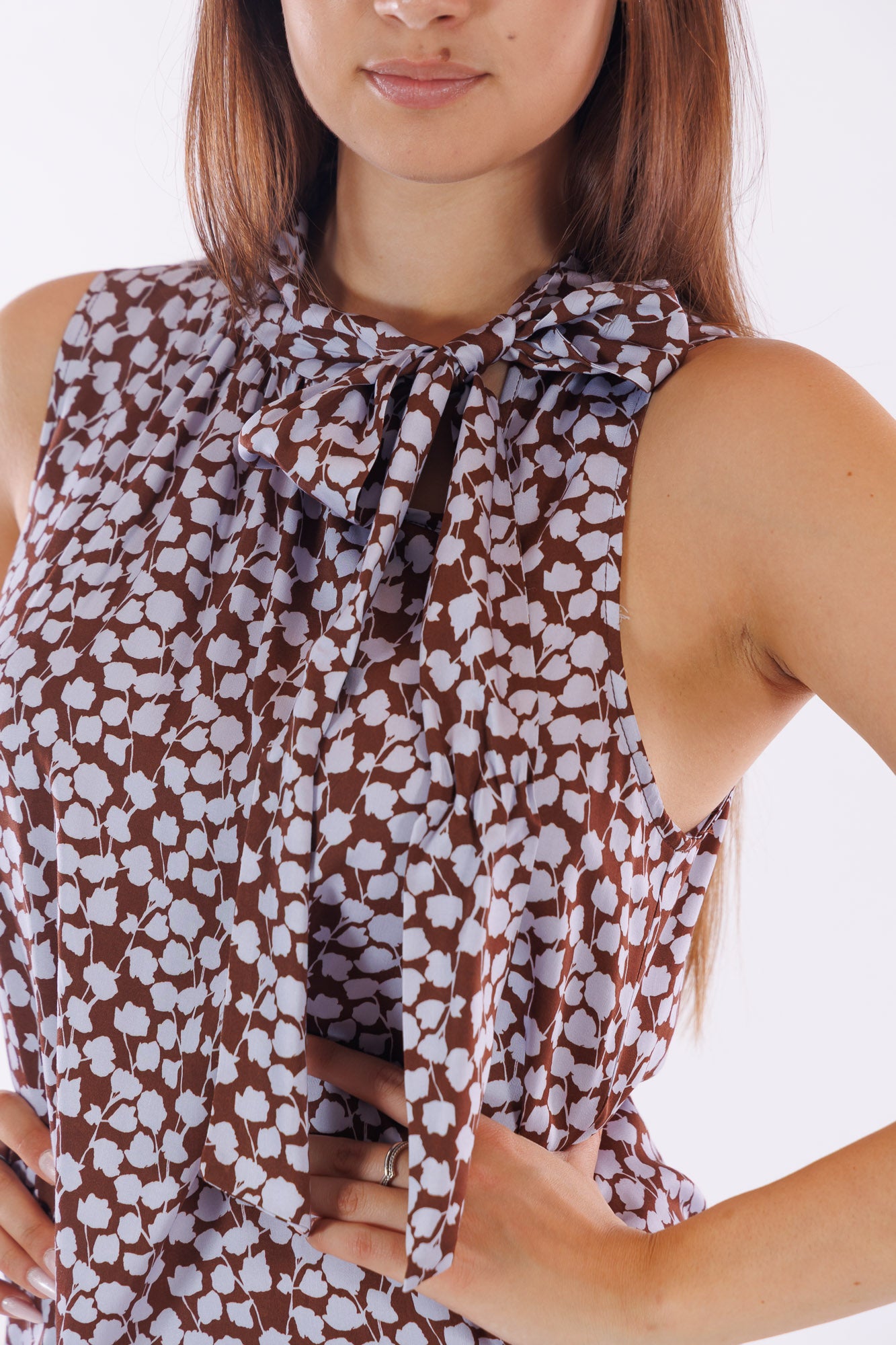 Questo top senza maniche si distingue per la stampa raffinata di fiorellini color glicine su uno sfondo cioccolato, creando un contrasto elegante e moderno. Il collo, arricchito da un fiocco, dona un tocco di femminilità. La vestibilità morbida e la lunghezza al bacino garantiscono comfort e versatilità, rendendo il capo adatto al quotidiano e a momenti più formali.