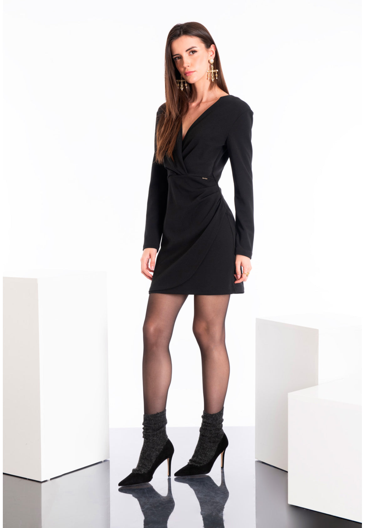 Questo elegante abito con scollo a V realizzato grazie ad un incrocio davanti ti farà sentire al top in ogni occasione. L'arriccio sul fianco sinistro, insieme al delicato spacco, conferisce un tocco di stile unico. Le maniche lunghe e la cerniera sul retro completano il look perfetto per chi ama essere al passo con la moda. Lunghezza corta fino a metà coscia.