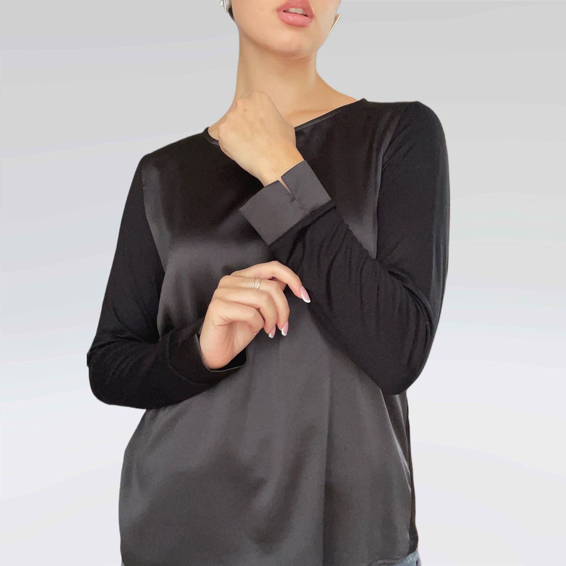 Maniche lunghe e scollo rotondo: la nostra blusa è elegante e versatile. Grazie alla doppia texture di raso e morbido jersey, offre un comfort unico. Con dettagli di stile come i polsini con micro spacchetti, sarai sempre al top con questo capo di alta qualità. Bellissima da portare come sottogiacca o come capo unico.