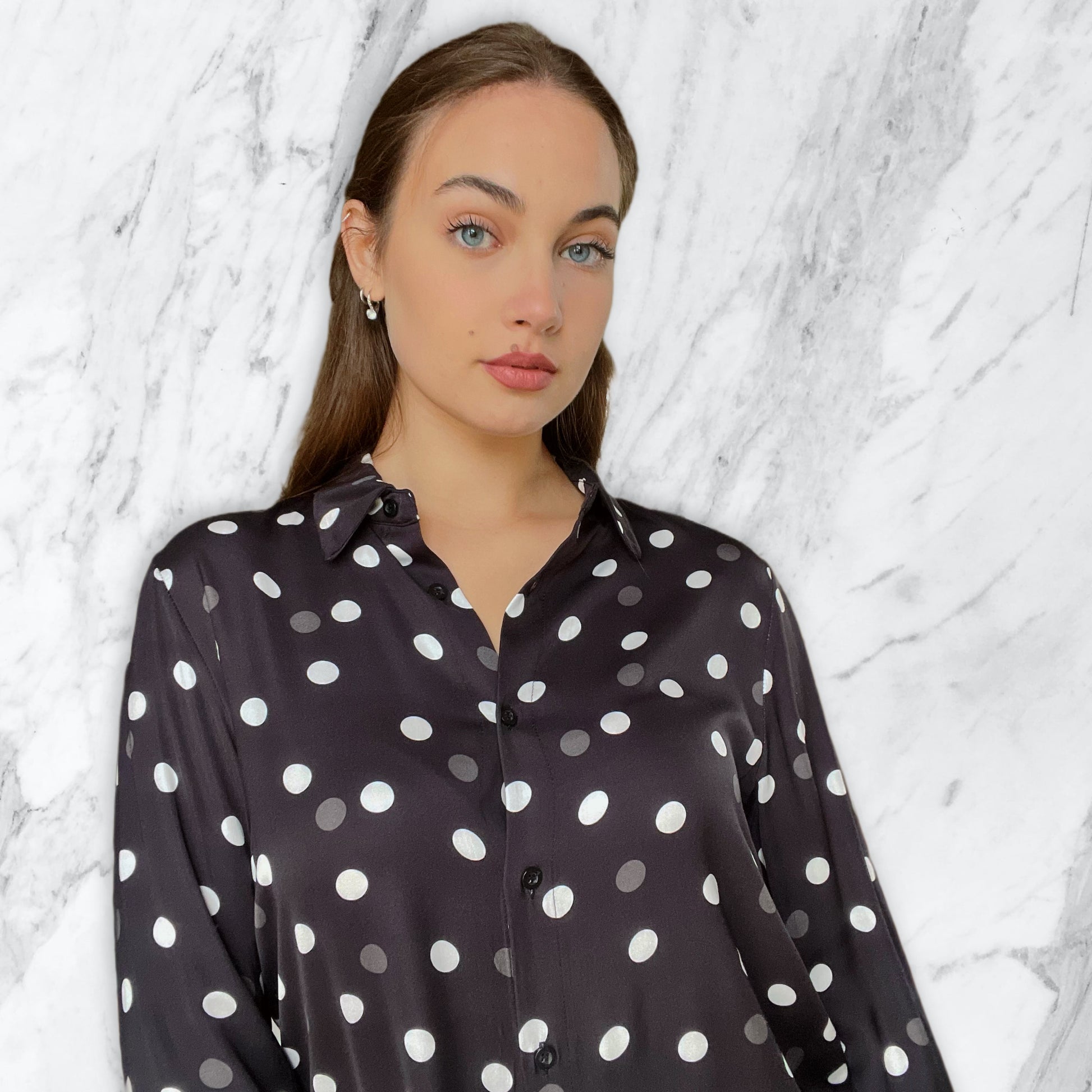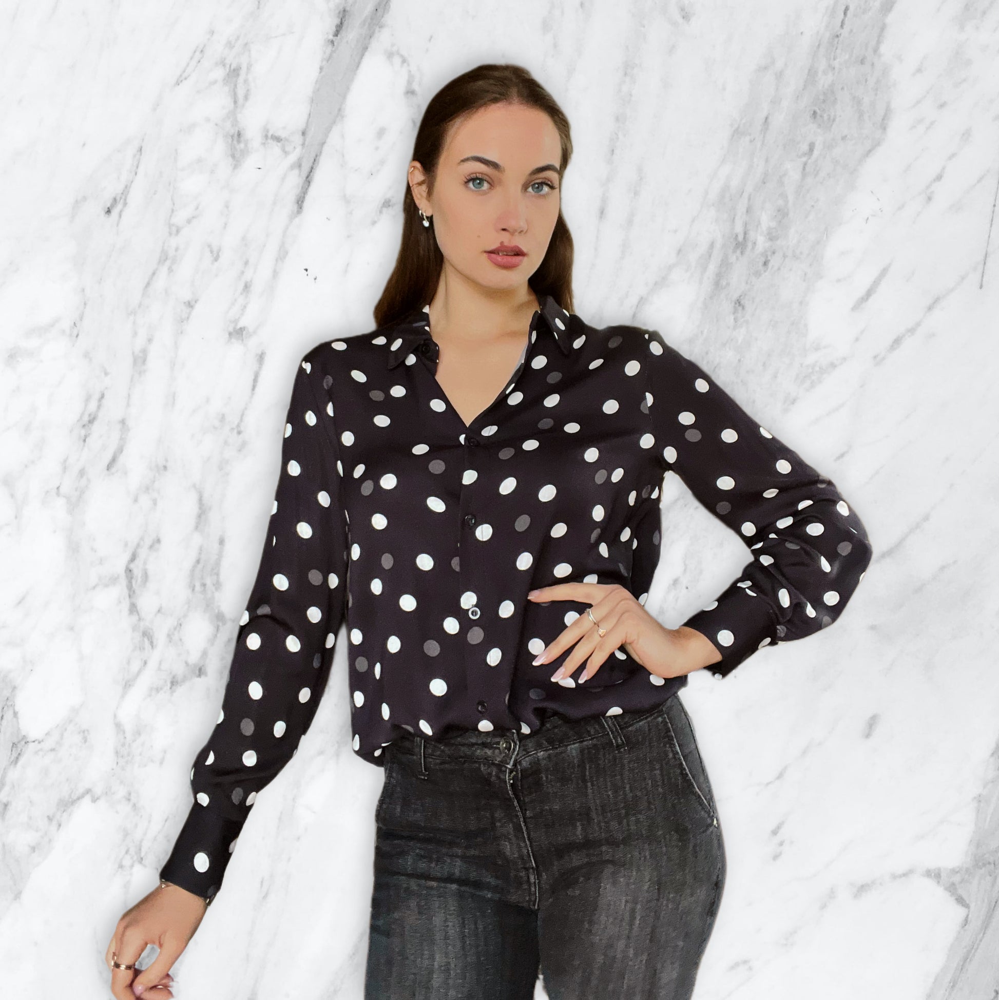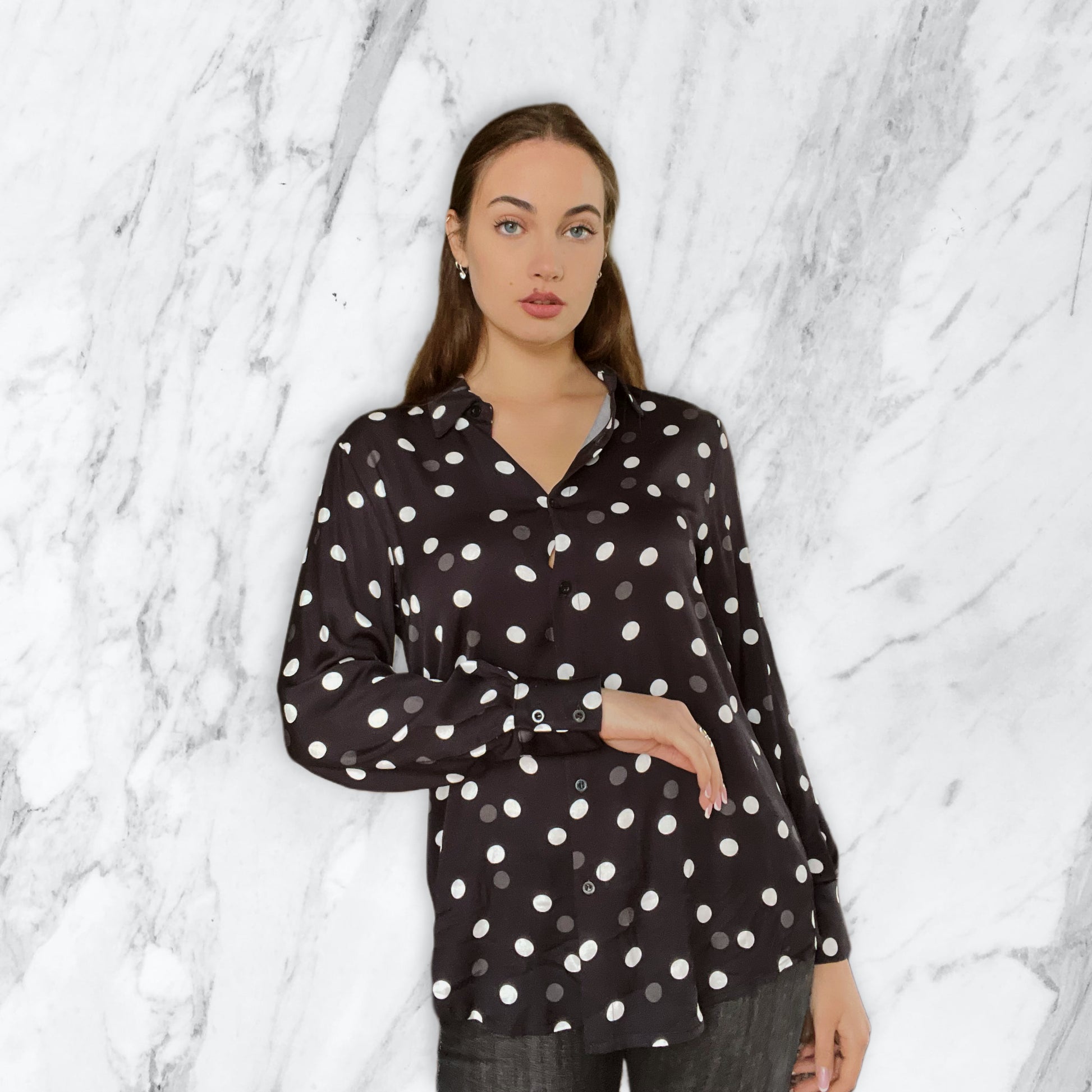 Questa camicia a fantasia a pois presenta un elegante colletto a uomo e una comoda apertura centrale con bottoncini, perfetta per un look formale ma originale. Le maniche lunghe con bottoncini sui polsini offrono un tocco di stile e la lunghezza oltre il bacino garantisce un fit perfetto.