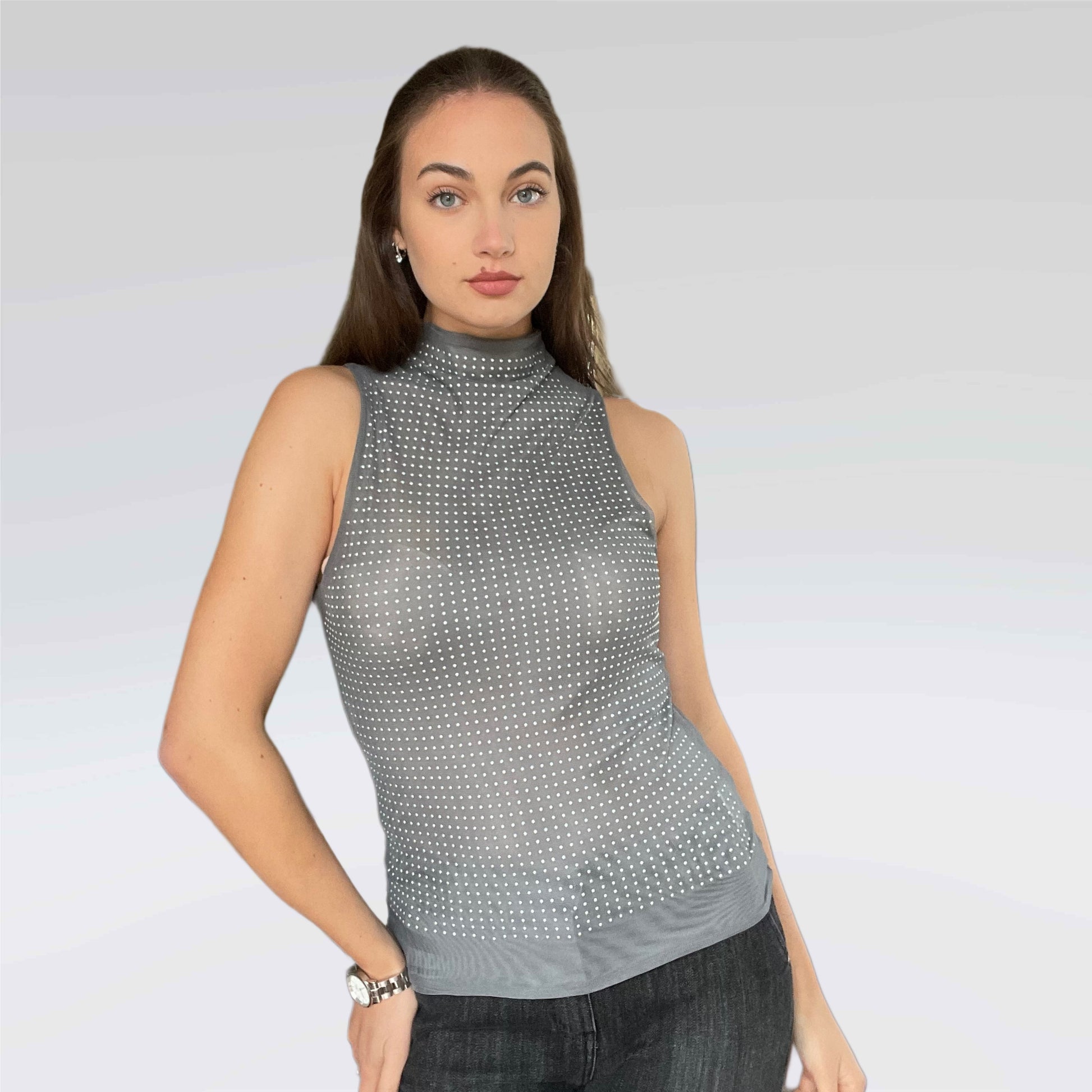 Questo dolcevita senza maniche, realizzato completamente in tulle è perfetto per le serate speciali. Con i suoi strass luminosi e il design elegante, ti farà sentire al centro dell'attenzione.