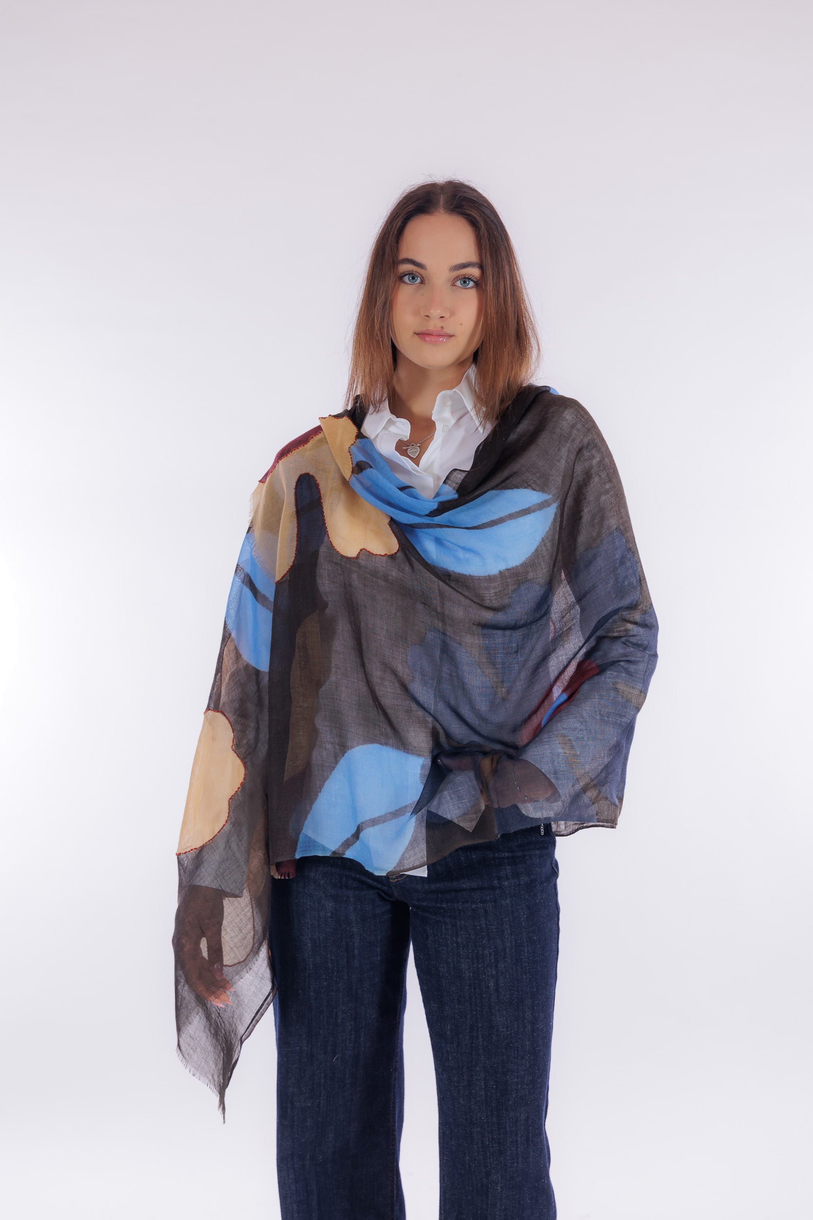 Elegante e morbidissima sciarpa disponibile in varie fantasie. Realizzata in pura lana, ricamata e dipinta a mano.