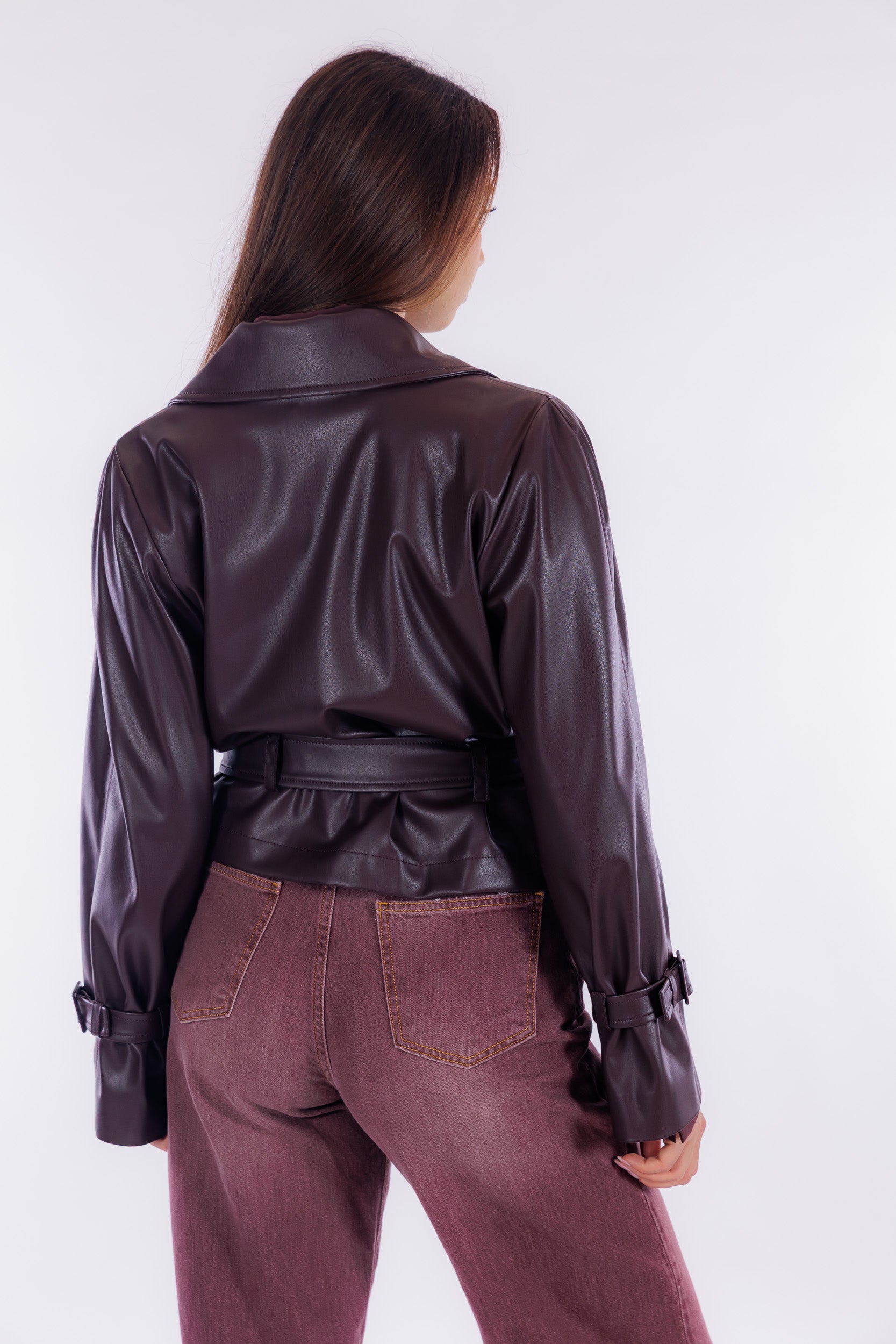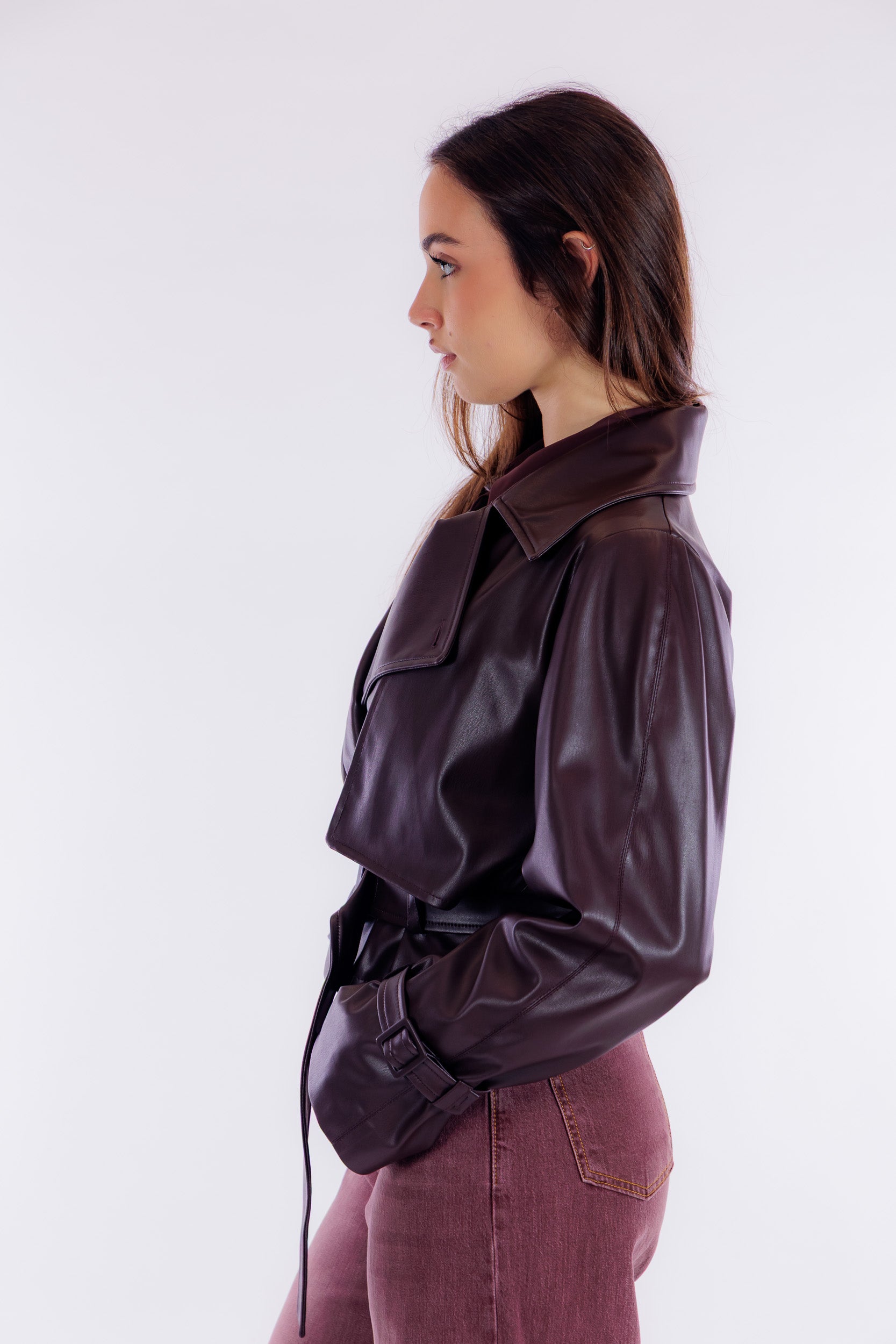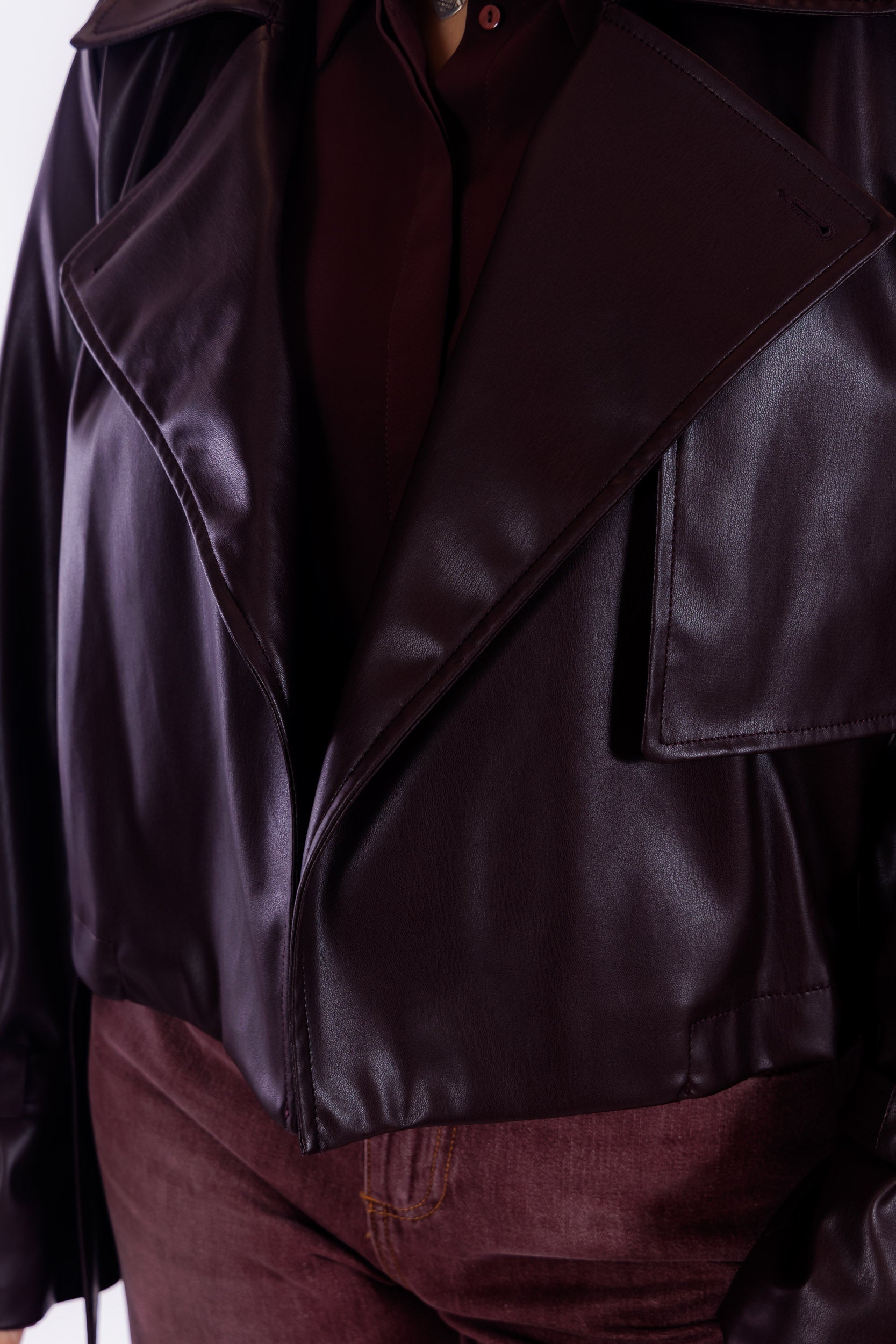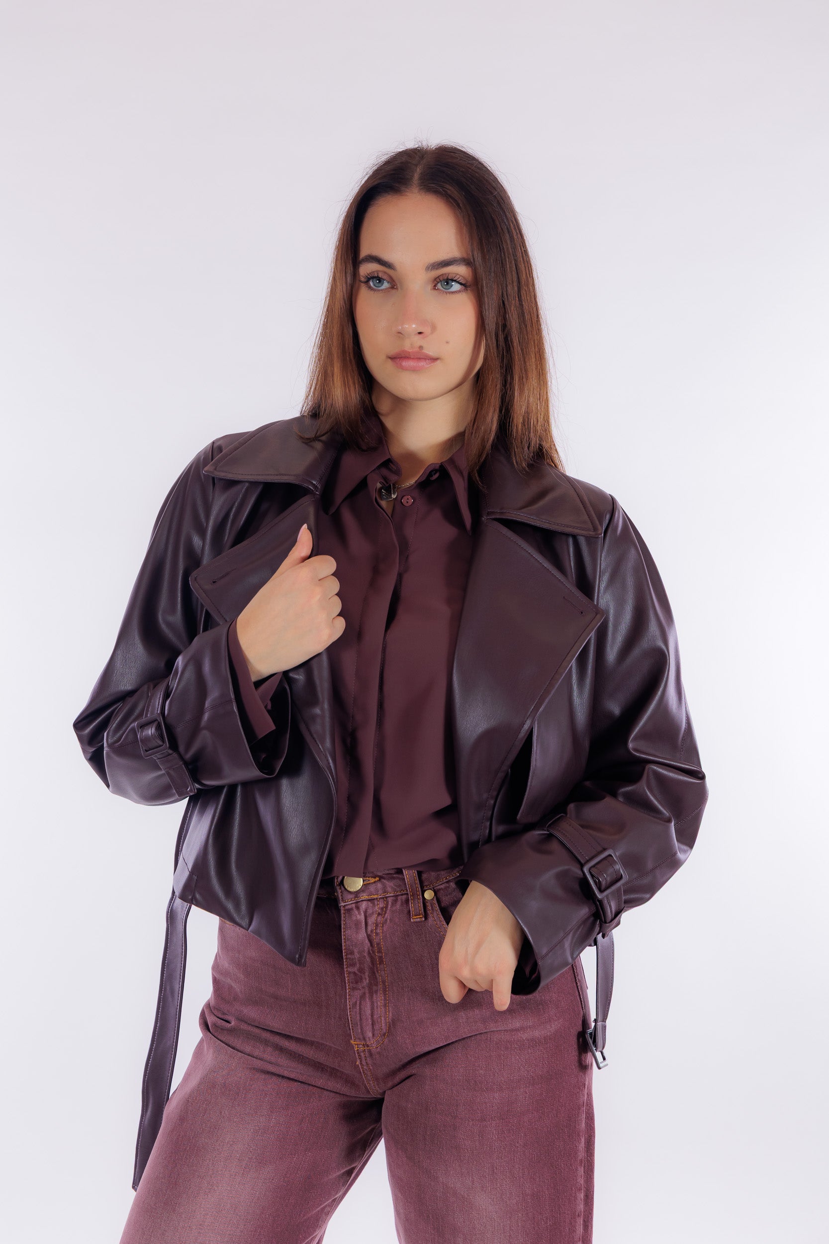 Questo chiodo in tessuto ecopelle si distingue per la cintura morbida e regolabile in vita che garantisce una vestibilità su misura. Gli ampi rever sullo scollo donano un tocco sofisticato, mentre l’assenza di bottoni valorizza un design minimale e contemporaneo. I cinturini sui polsi aggiungono funzionalità e dettaglio, mentre la mantellina che scende dalla spalla sinistra crea un elemento distintivo e di carattere, perfetto per chi cerca un capo raffinato e originale.